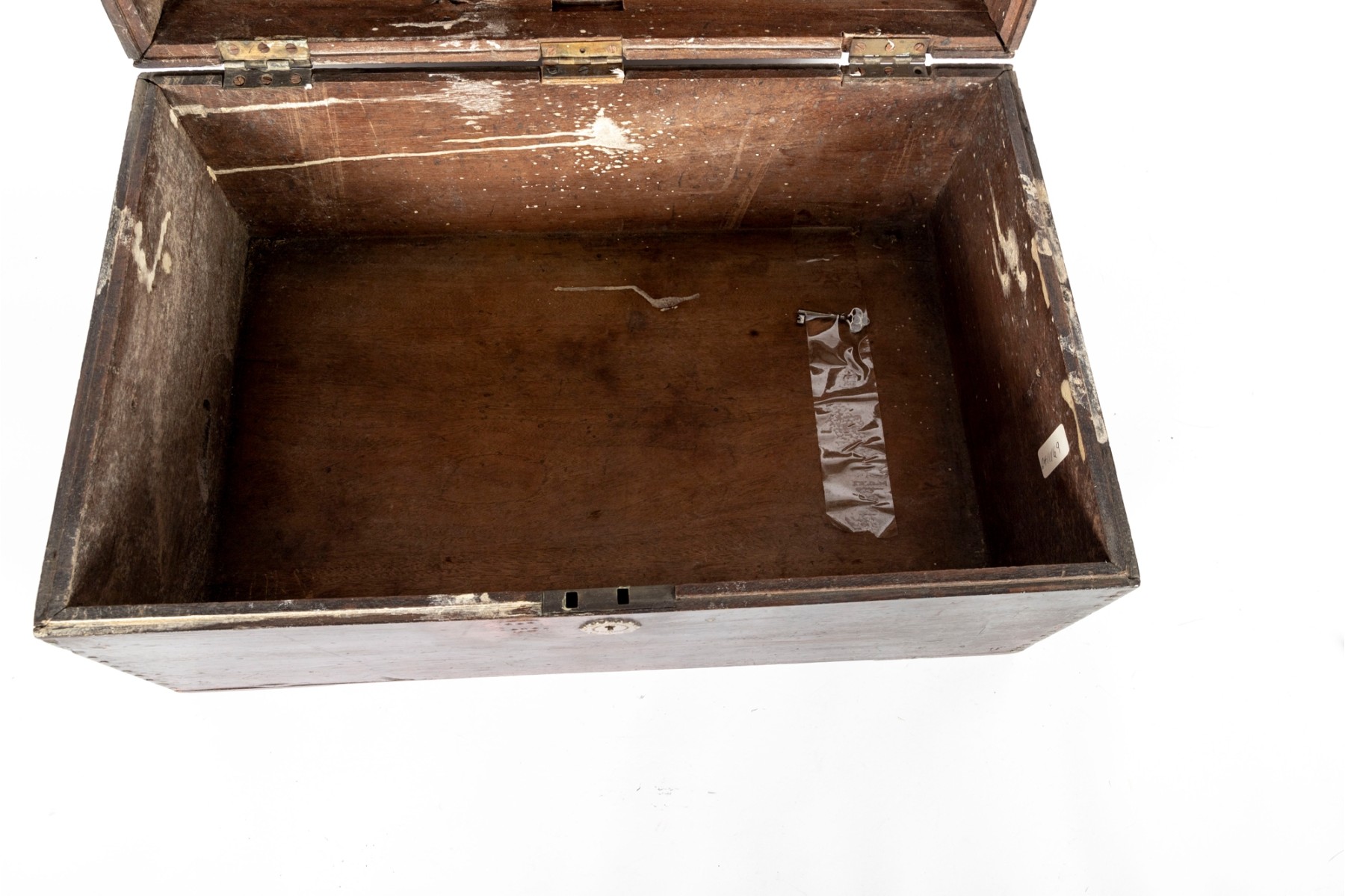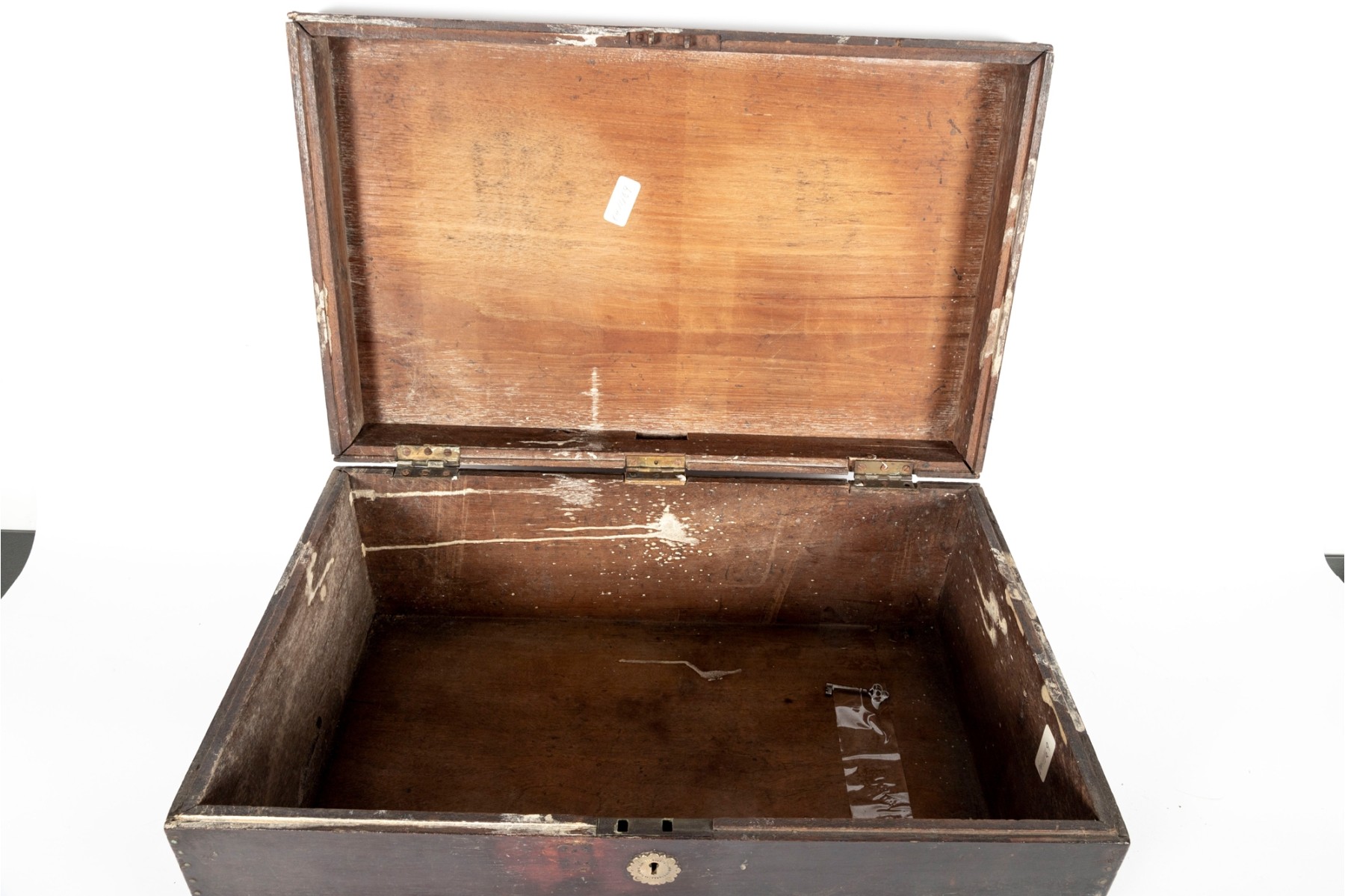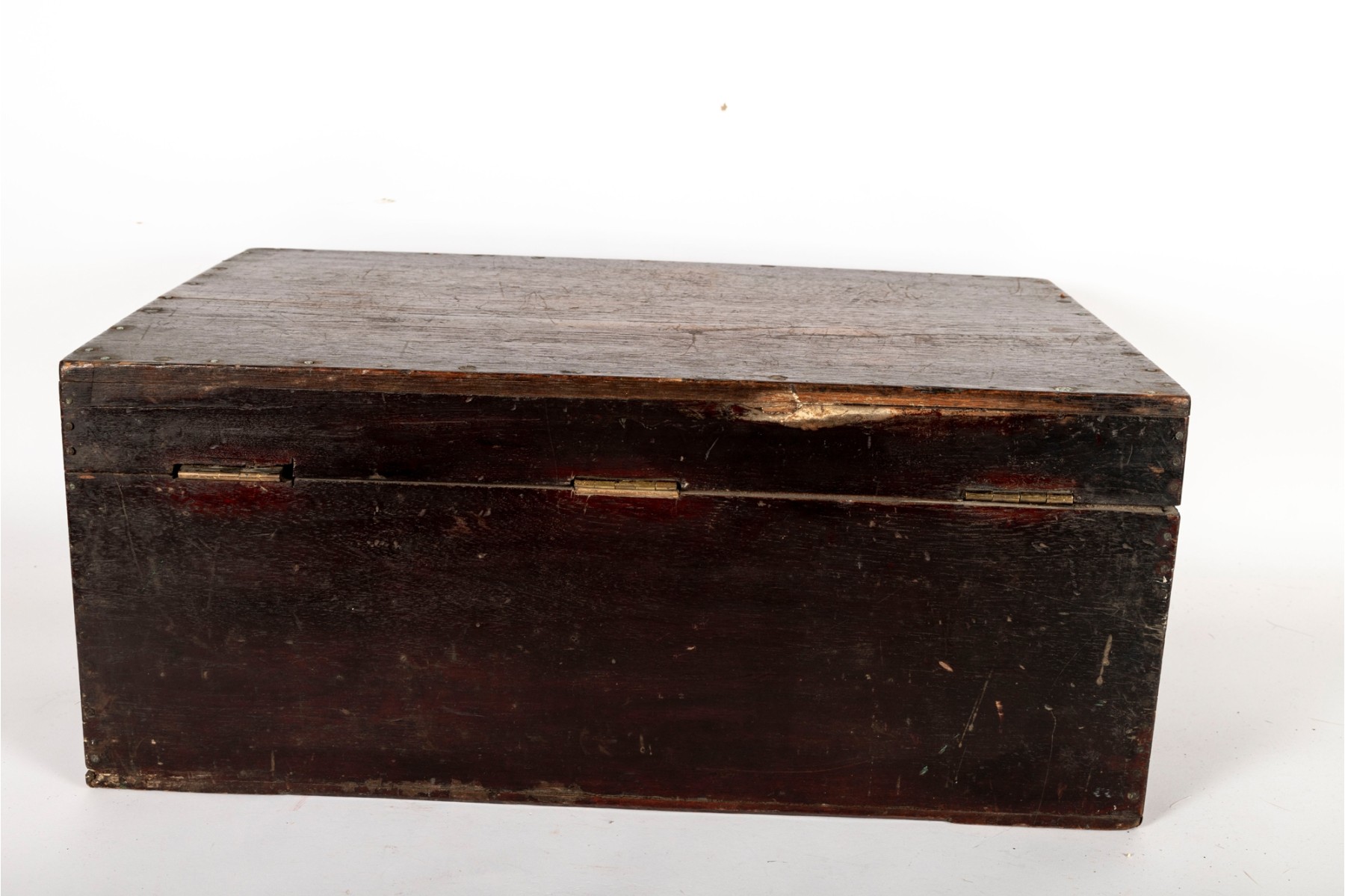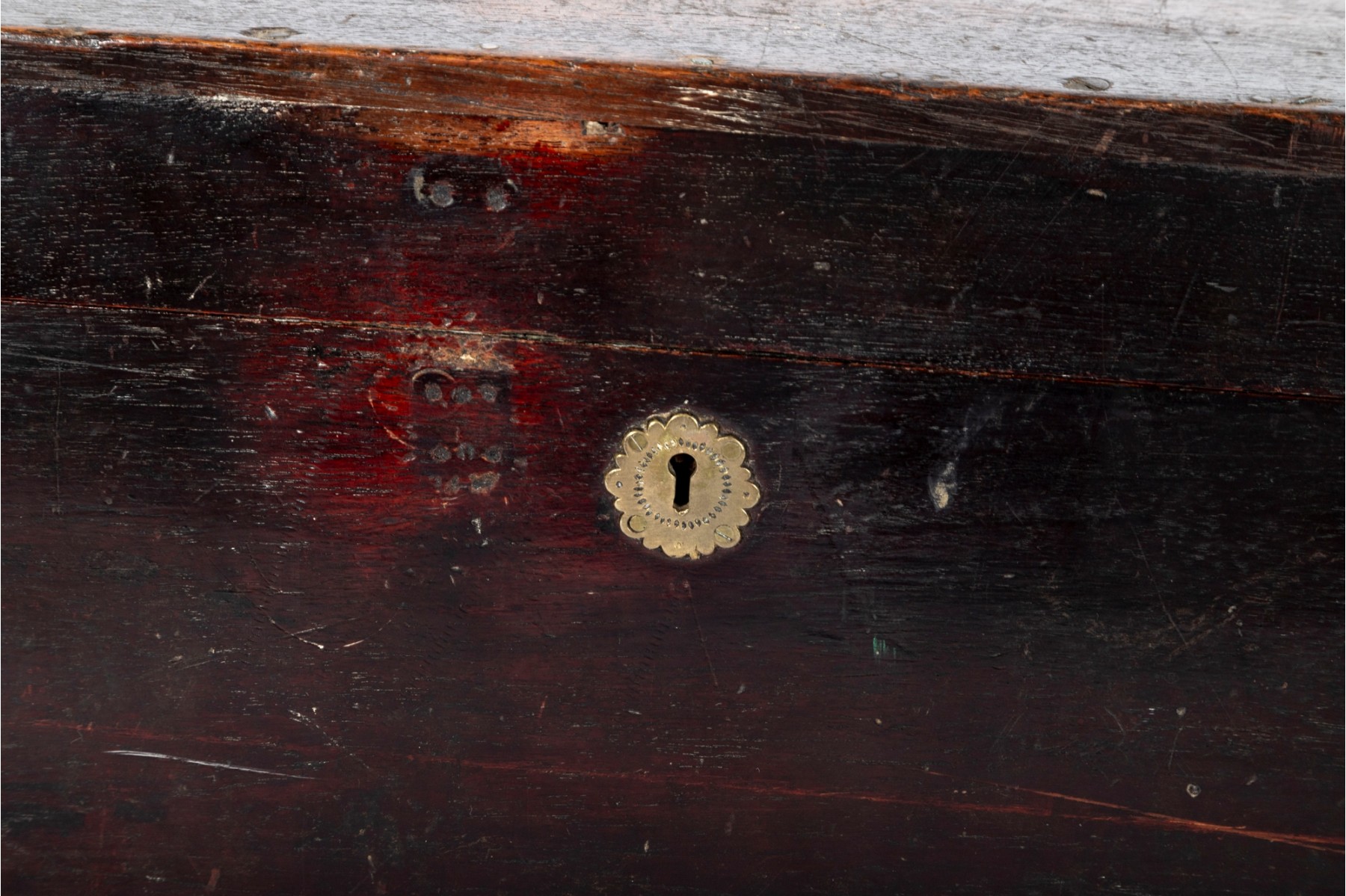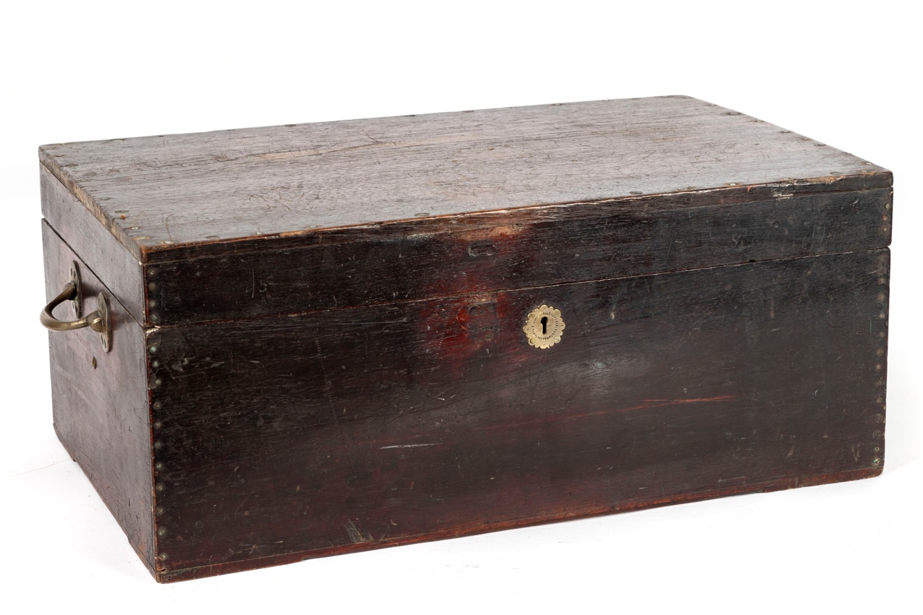 An antique cash chest or trunk, constructed from sturdy wood reinforced with iron nails -- originally designed for secure storage of valuables.