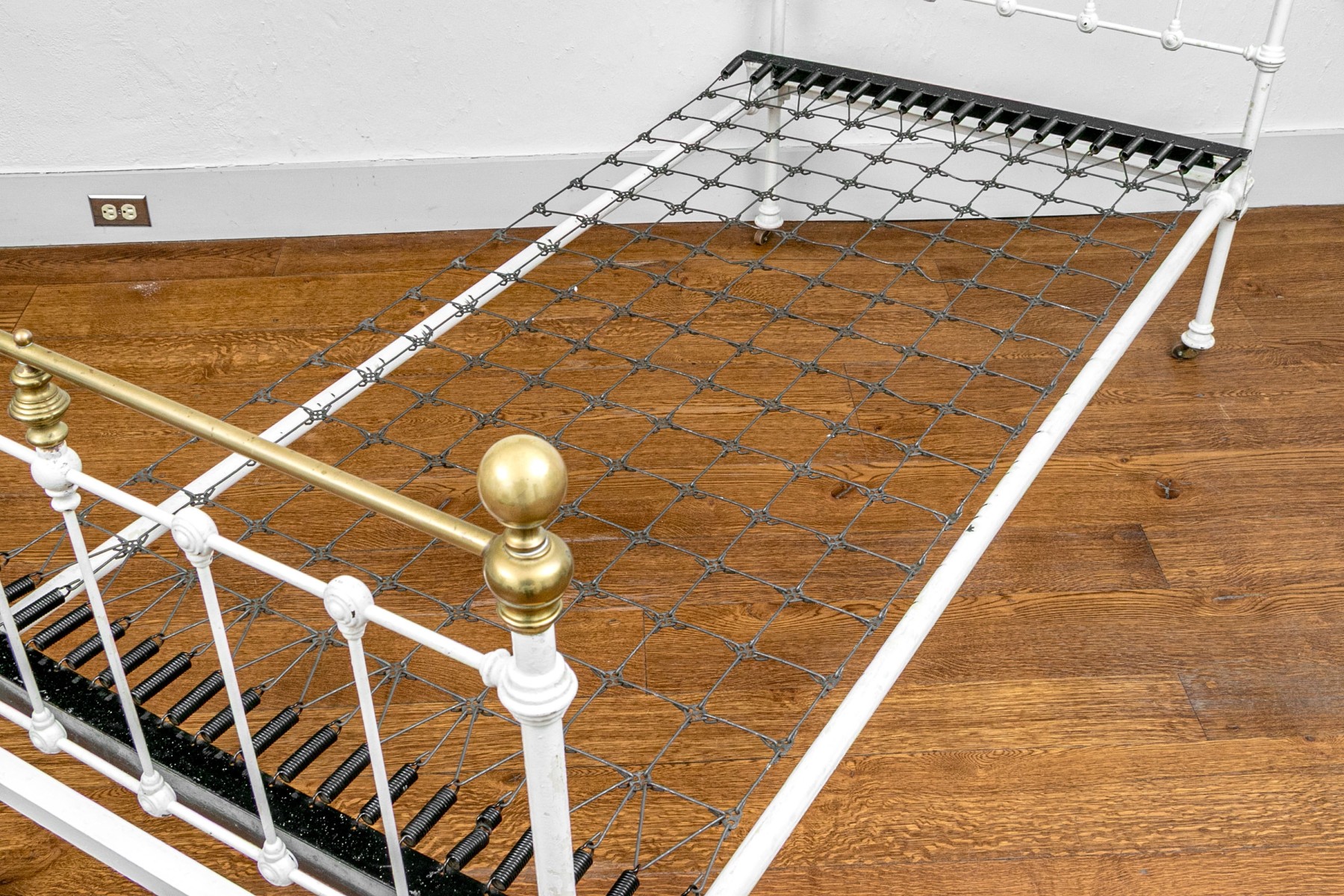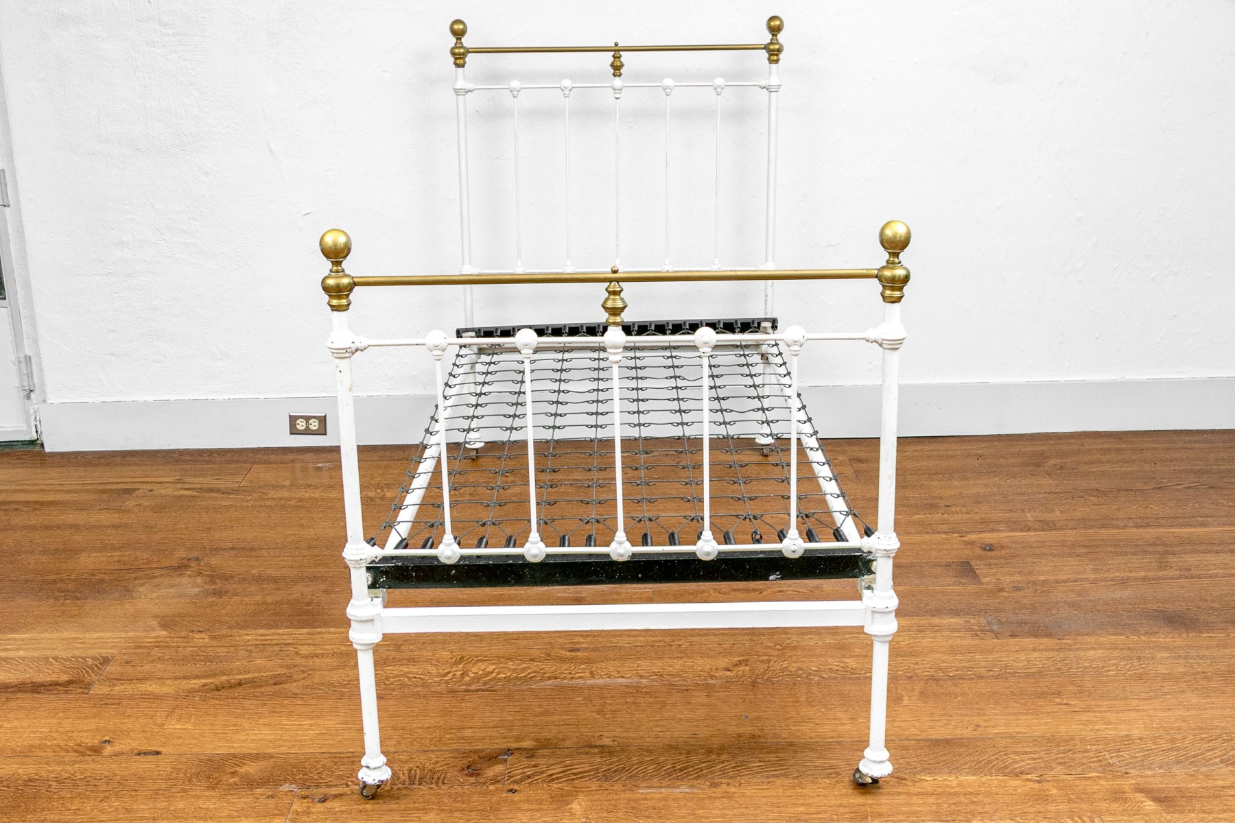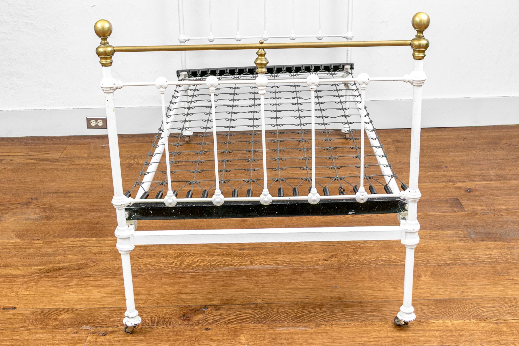 A charming antique white finished cast iron bed frame sporting brass cannonball finials and top rails. Raised over casters for easy mobility.