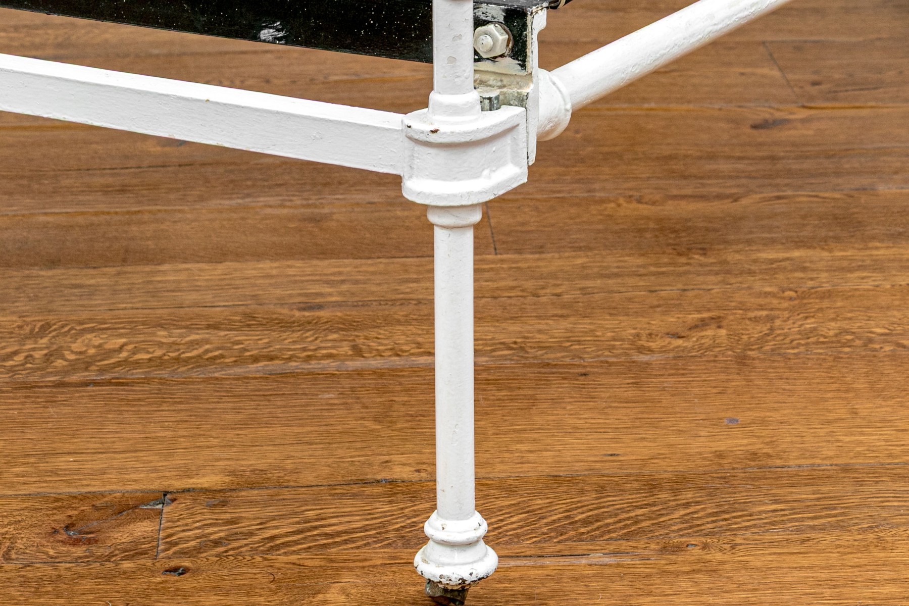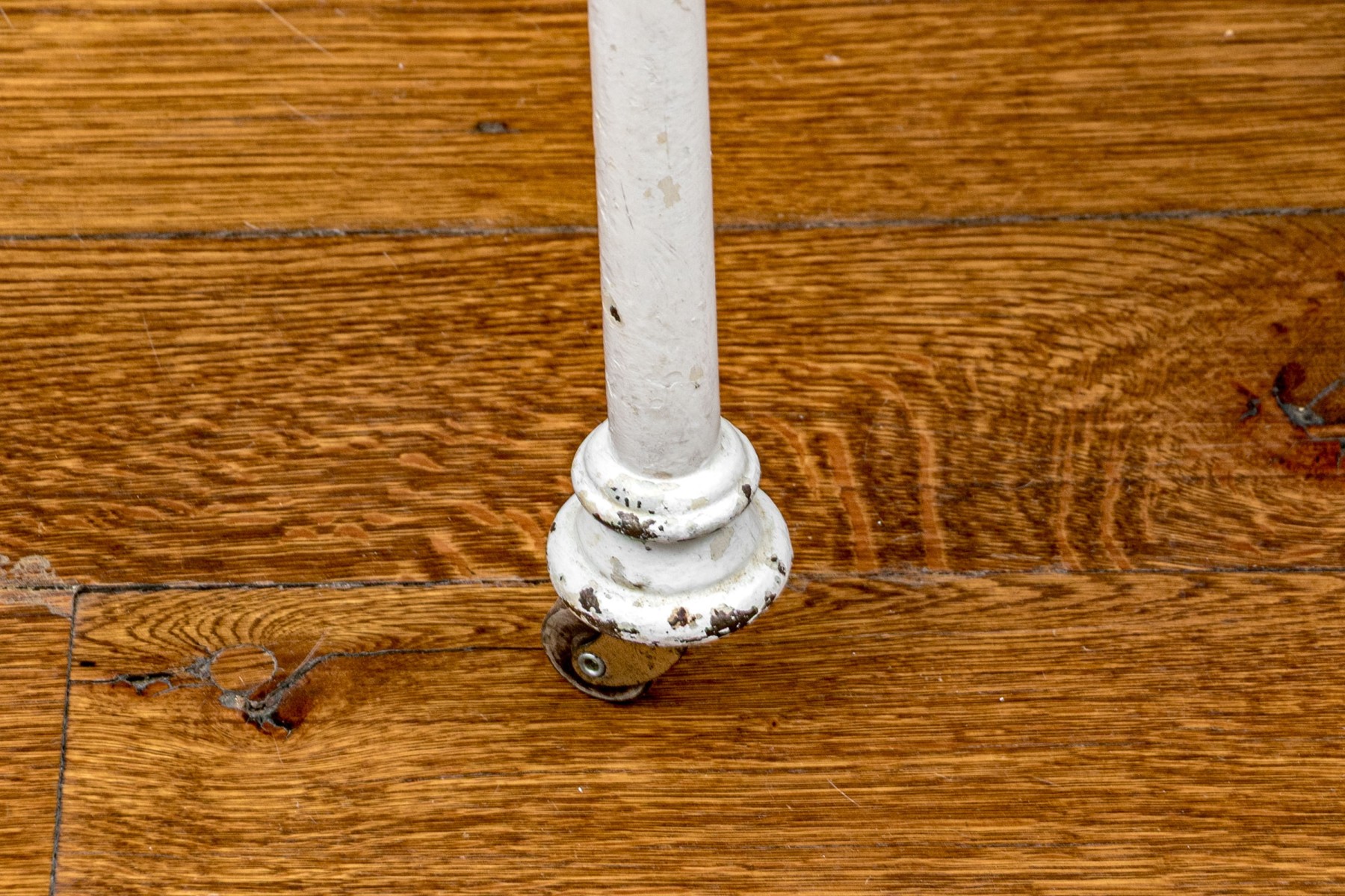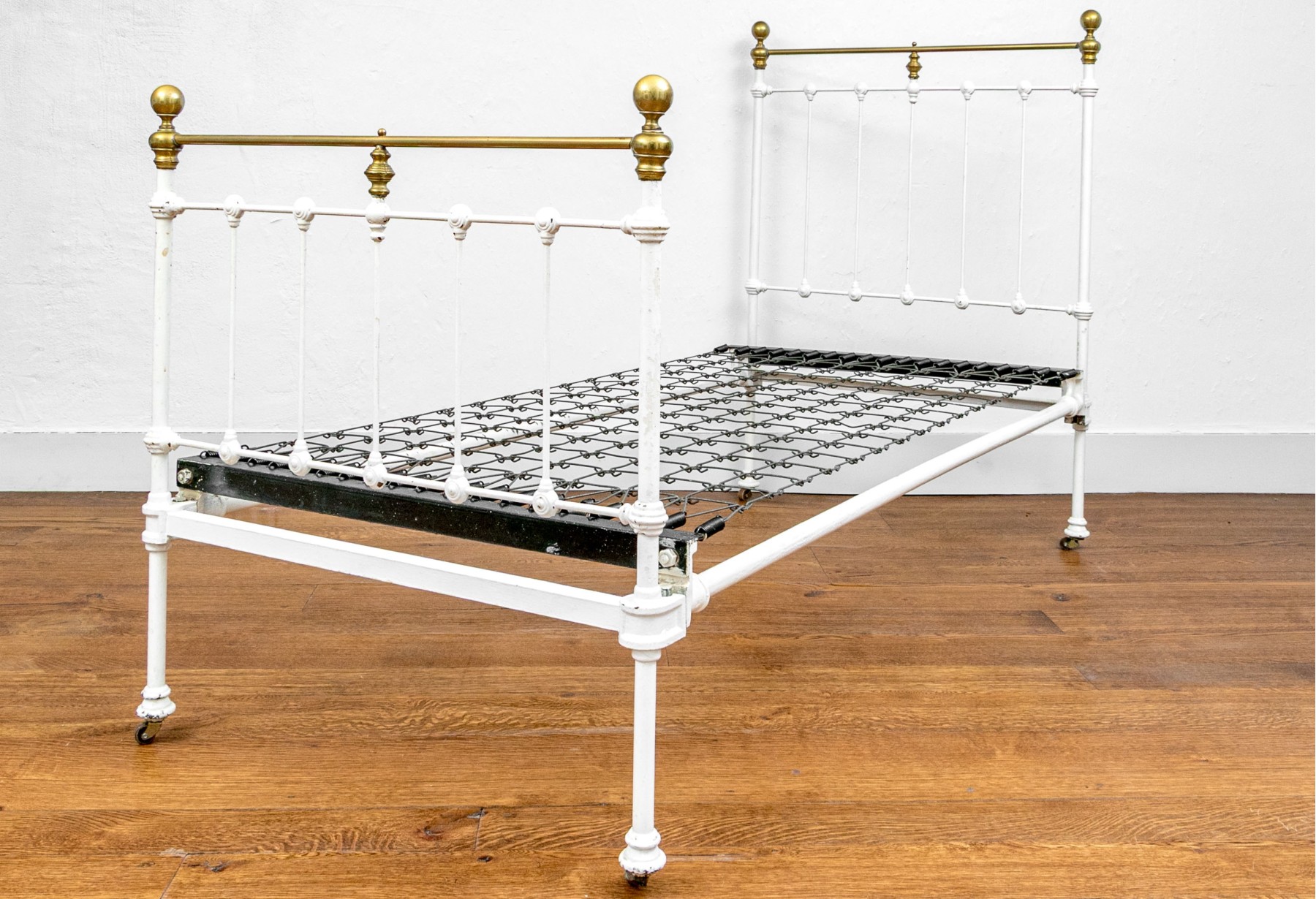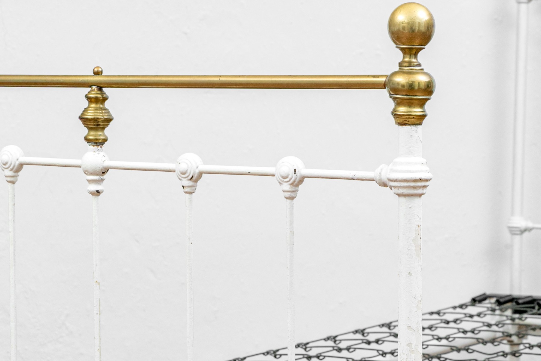 A charming antique white finished cast iron bed frame sporting brass cannonball finials and top rails. Raised over casters for easy mobility.