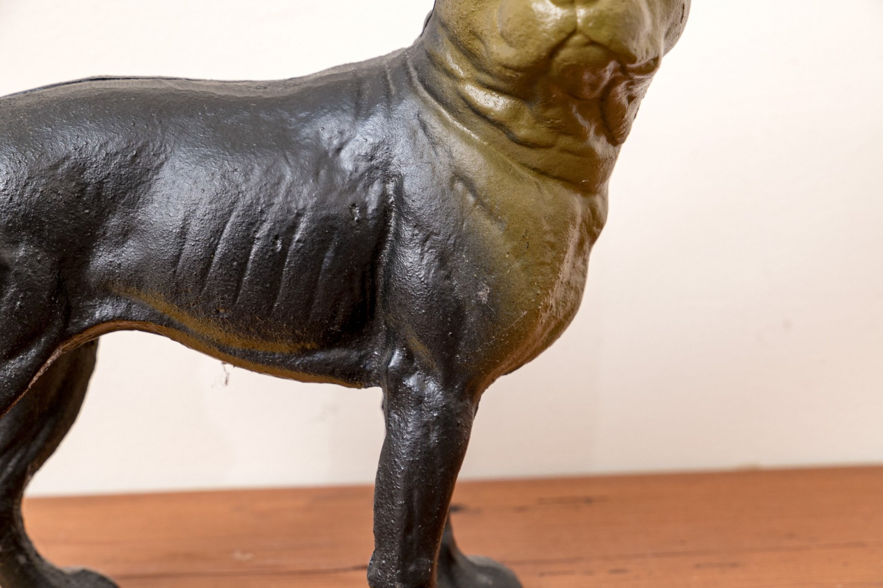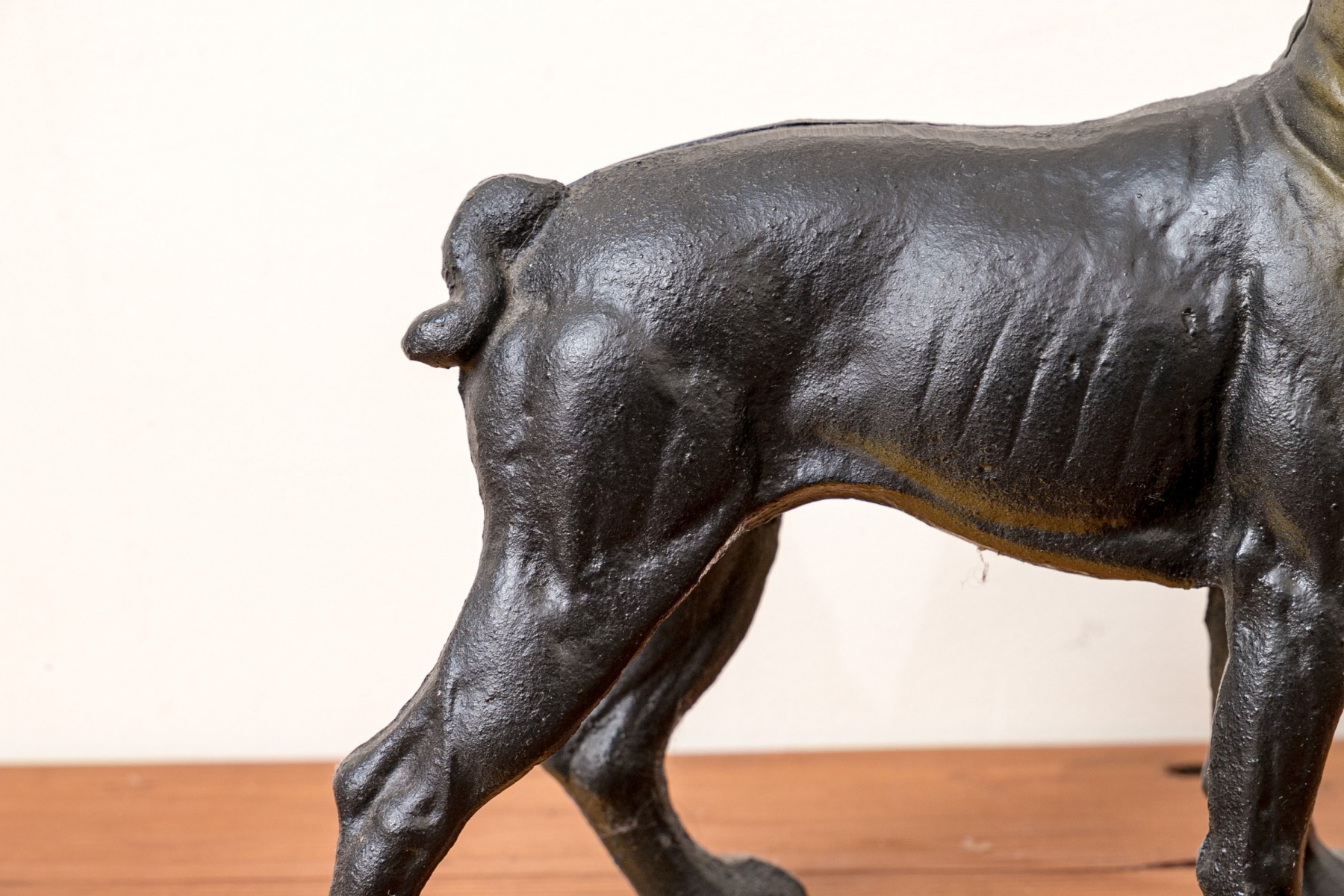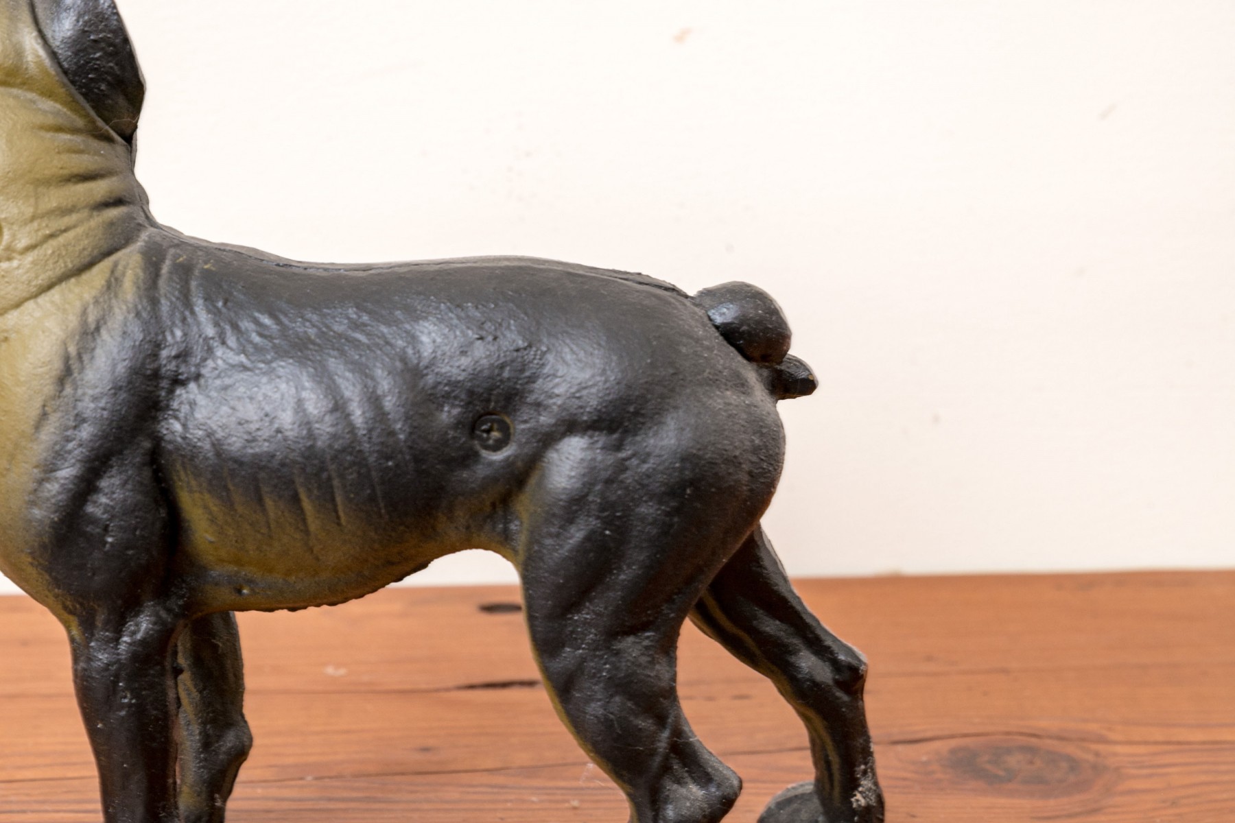 An antique cast iron figural door stopper depicting the form of a dog in a charming stance.