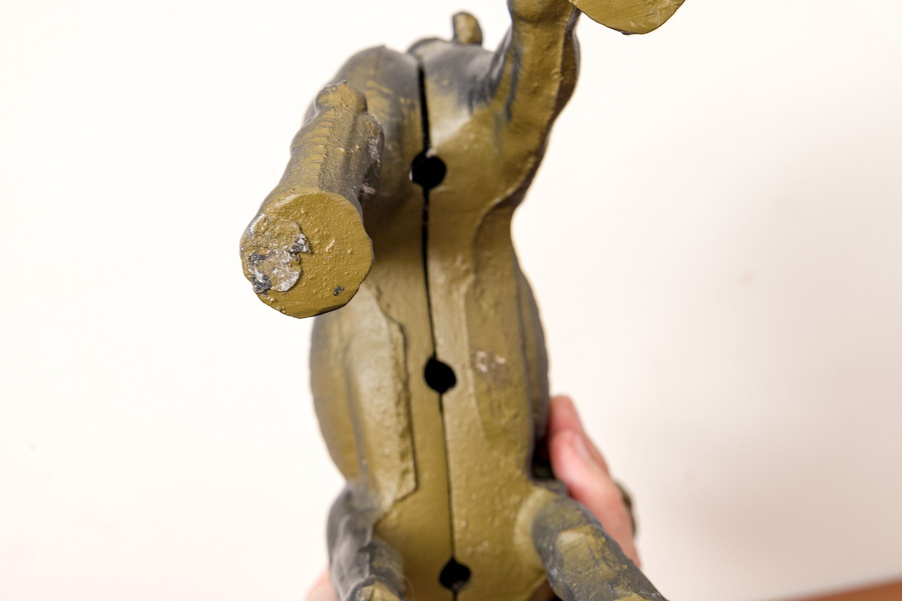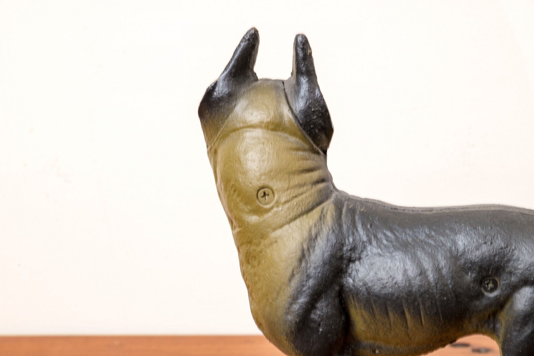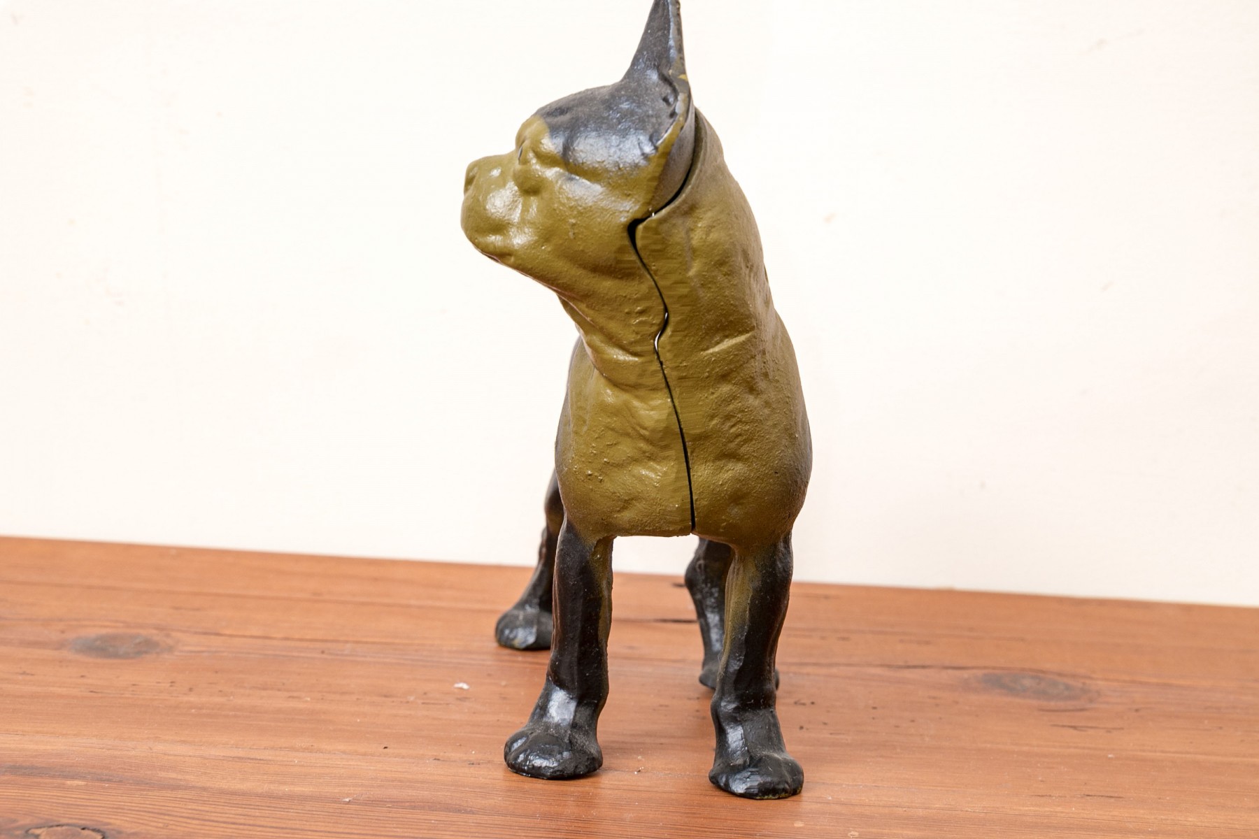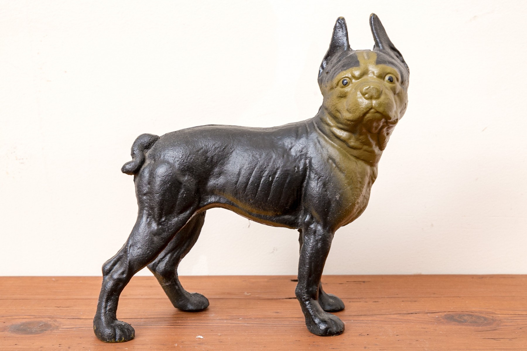An antique cast iron figural door stopper depicting the form of a dog in a charming stance.