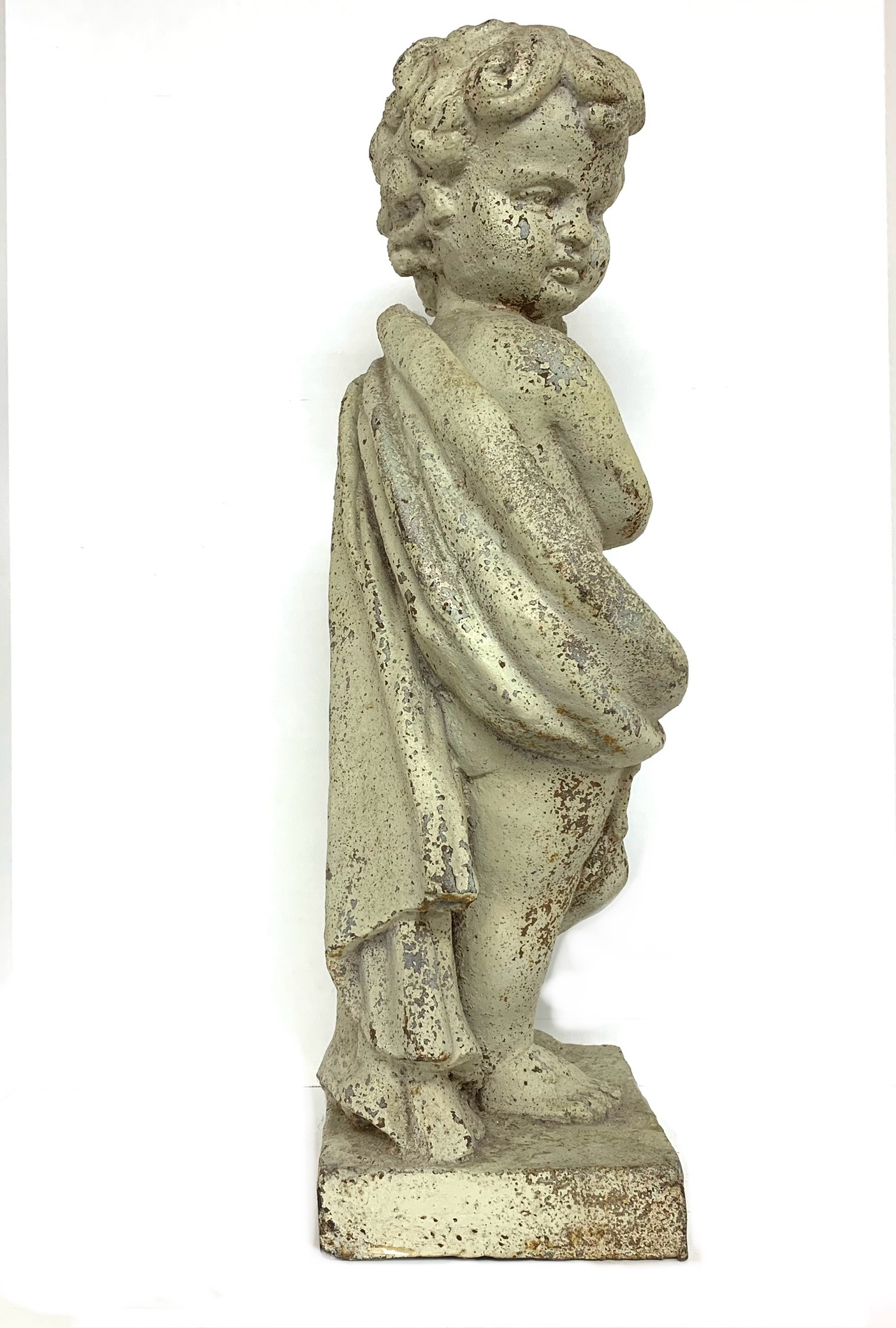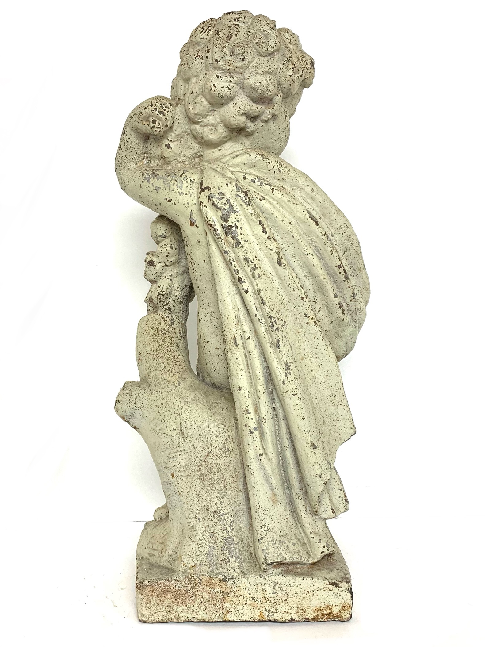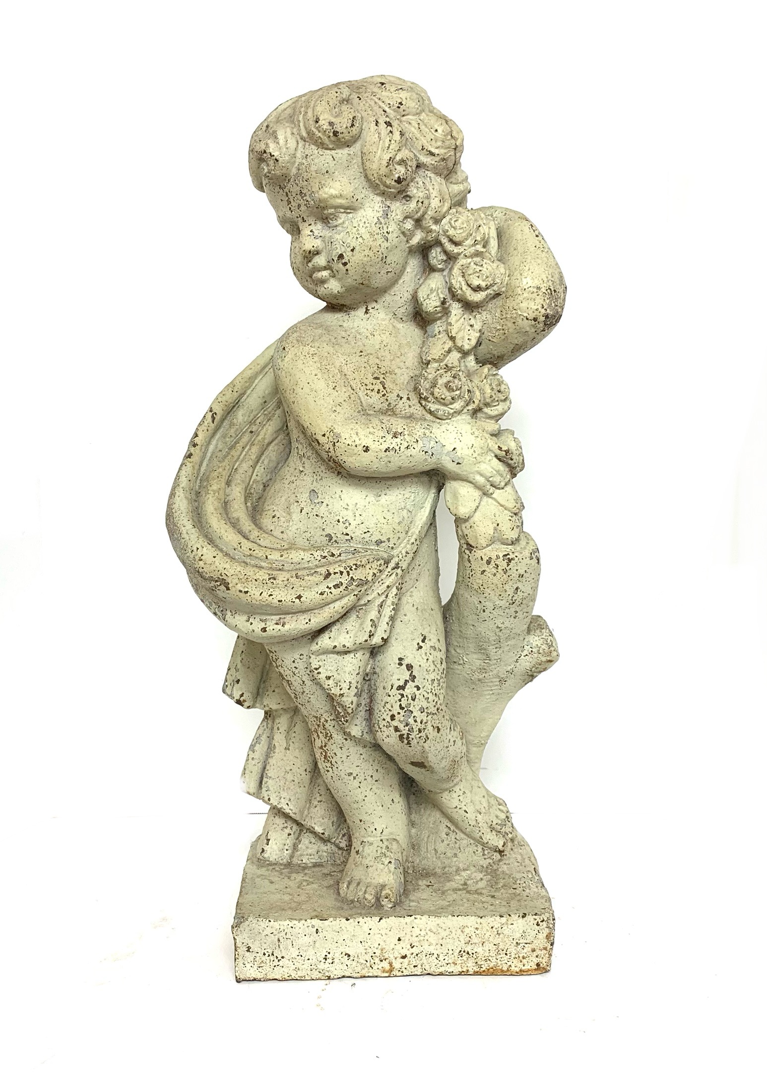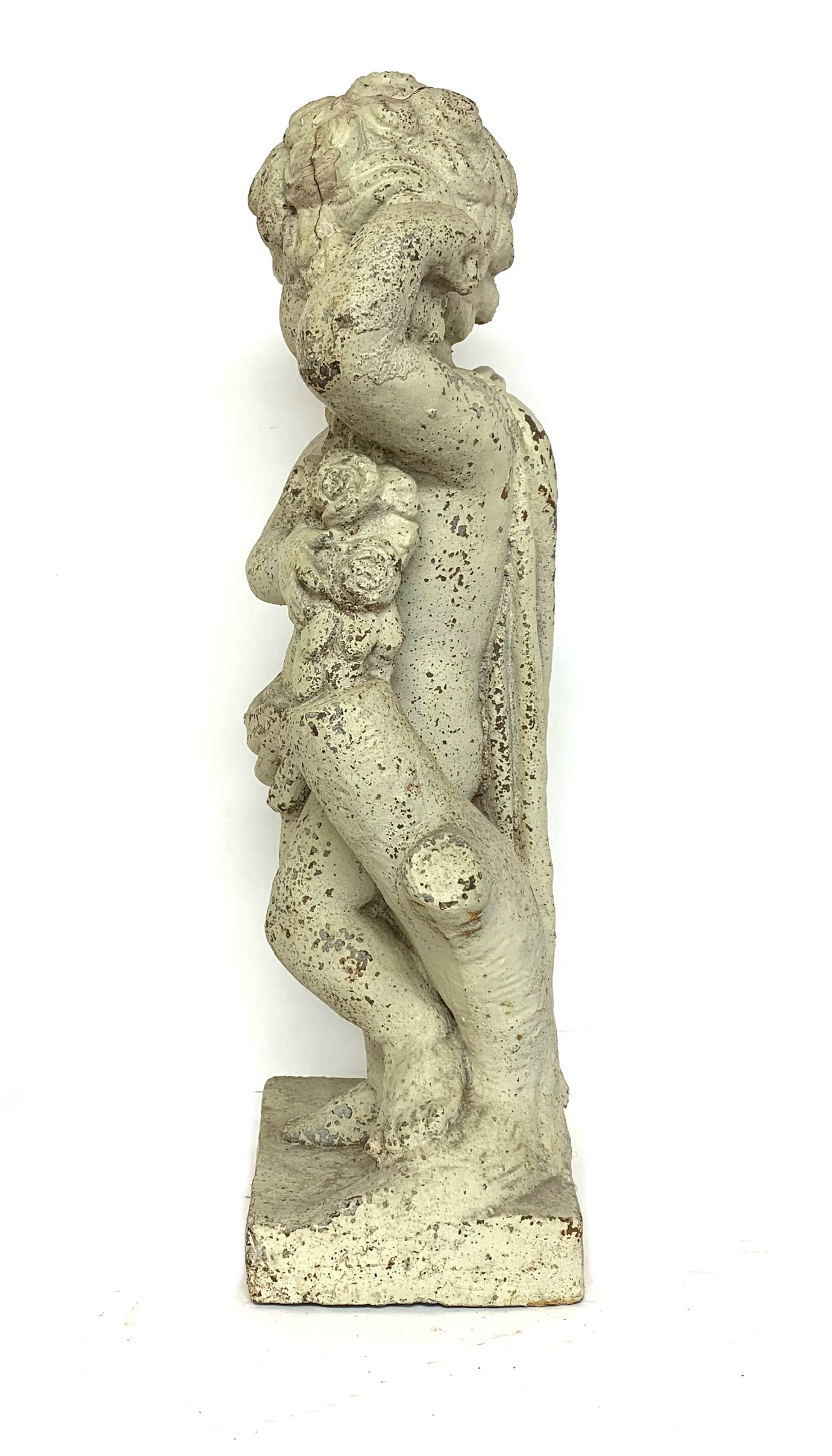 Antique cast iron garden statue in old white paint depicting a cherub or putto figure shown draped in cloth and holding a floral garland. The putto is surmounted on a plinth base.