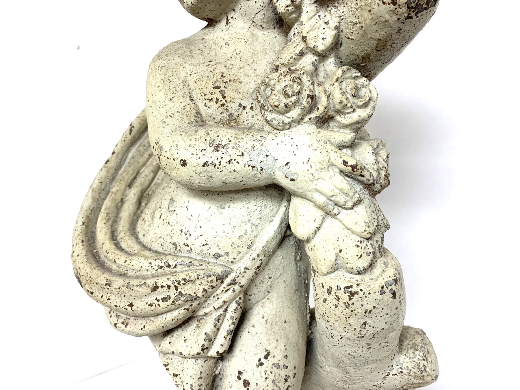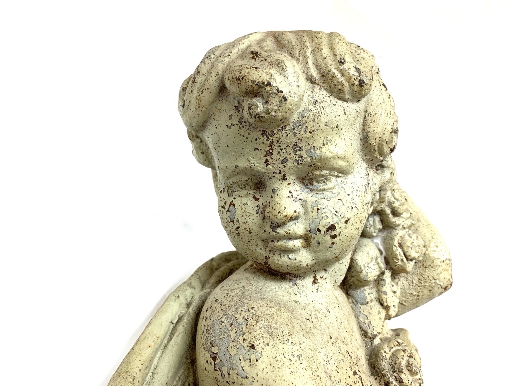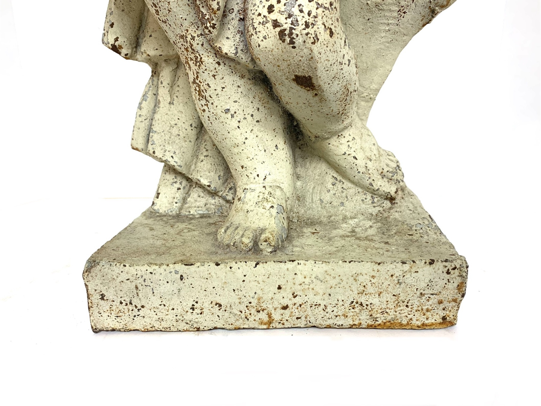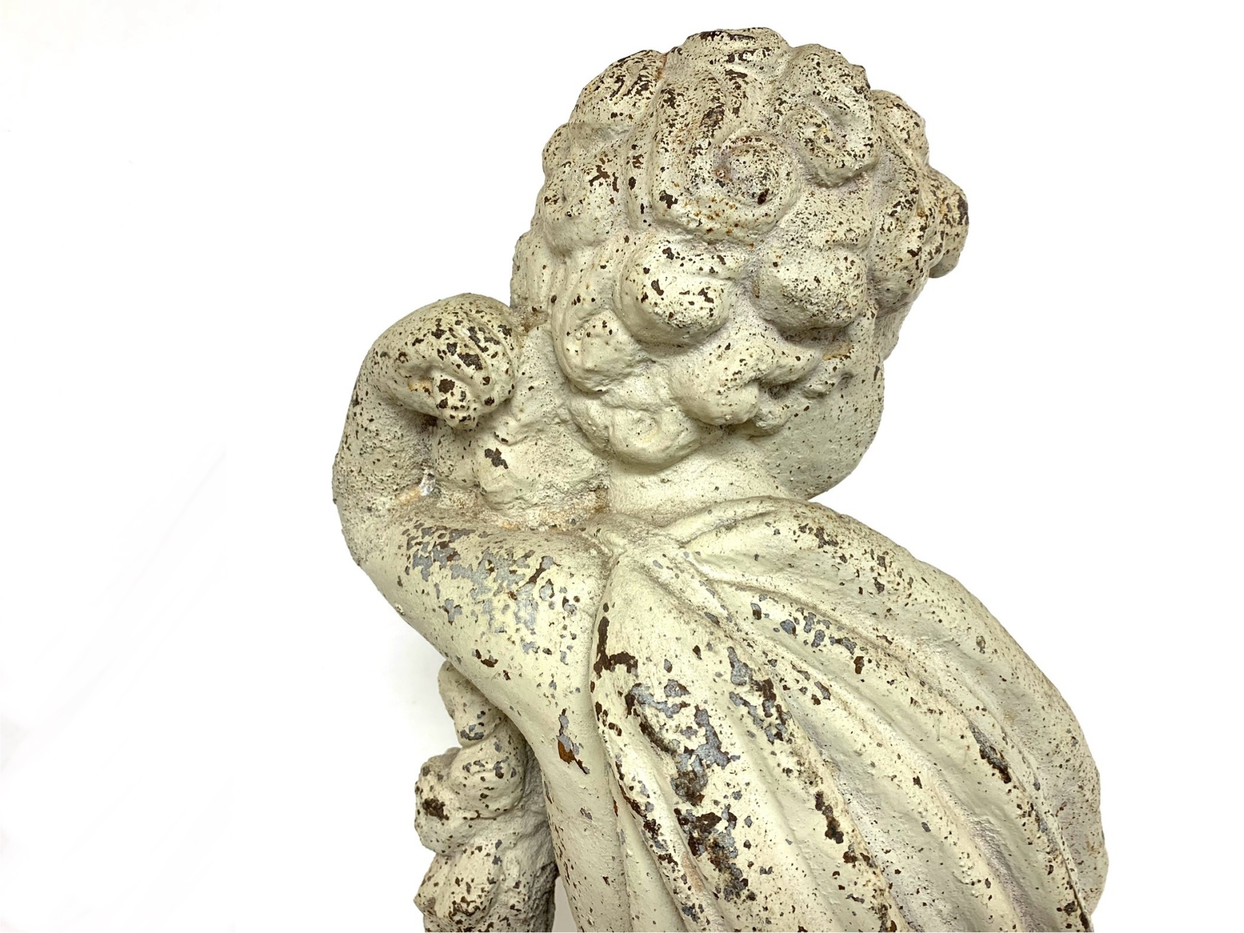 Antique cast iron garden statue in old white paint depicting a cherub or putto figure shown draped in cloth and holding a floral garland. The putto is surmounted on a plinth base.