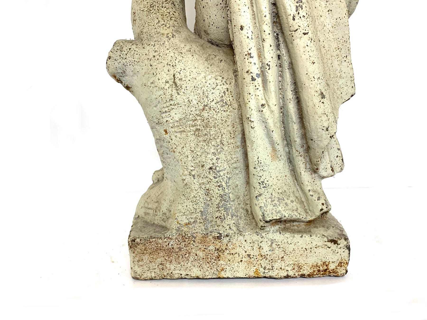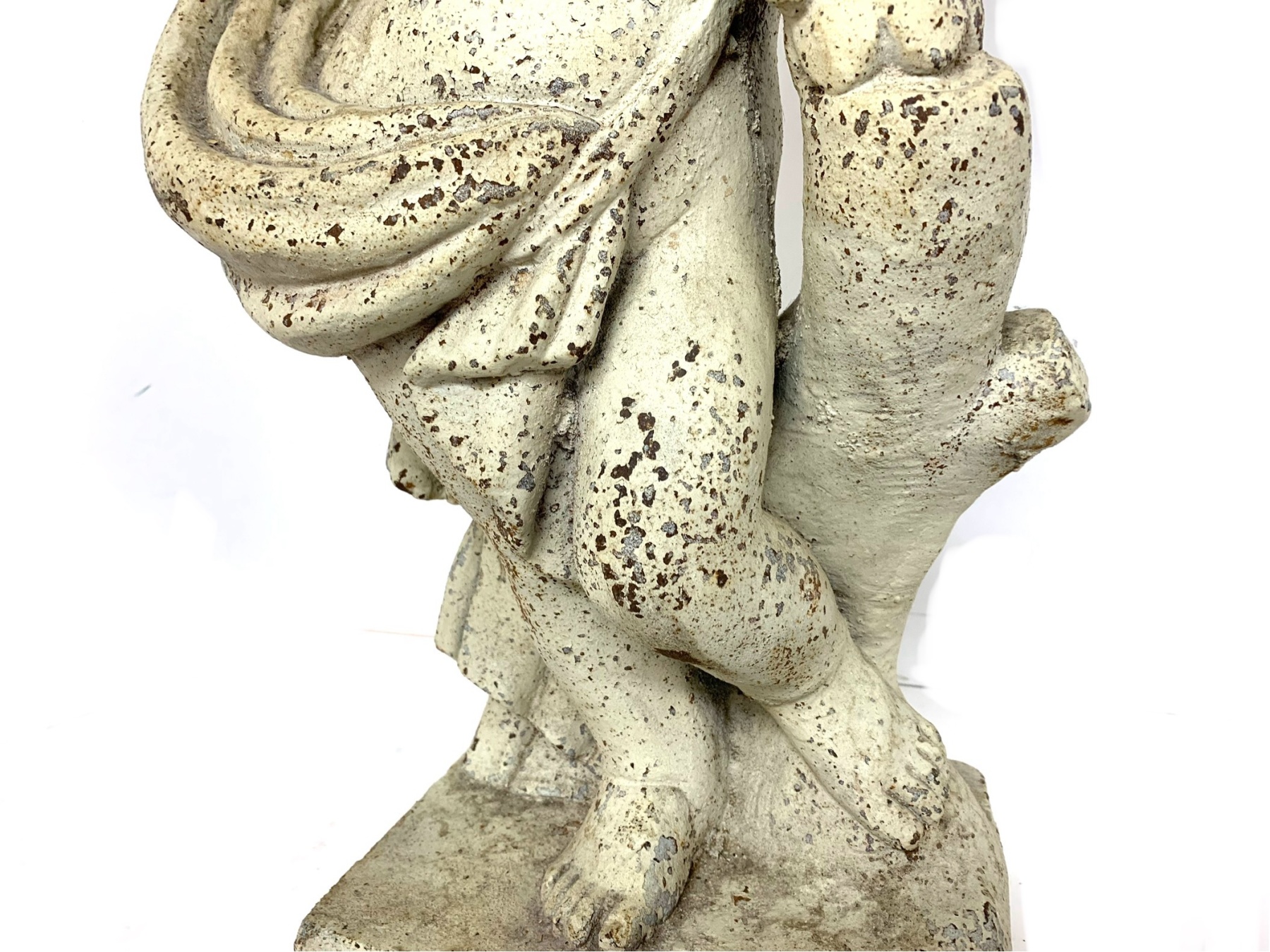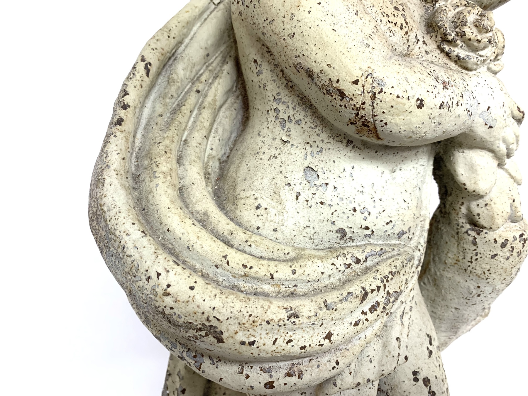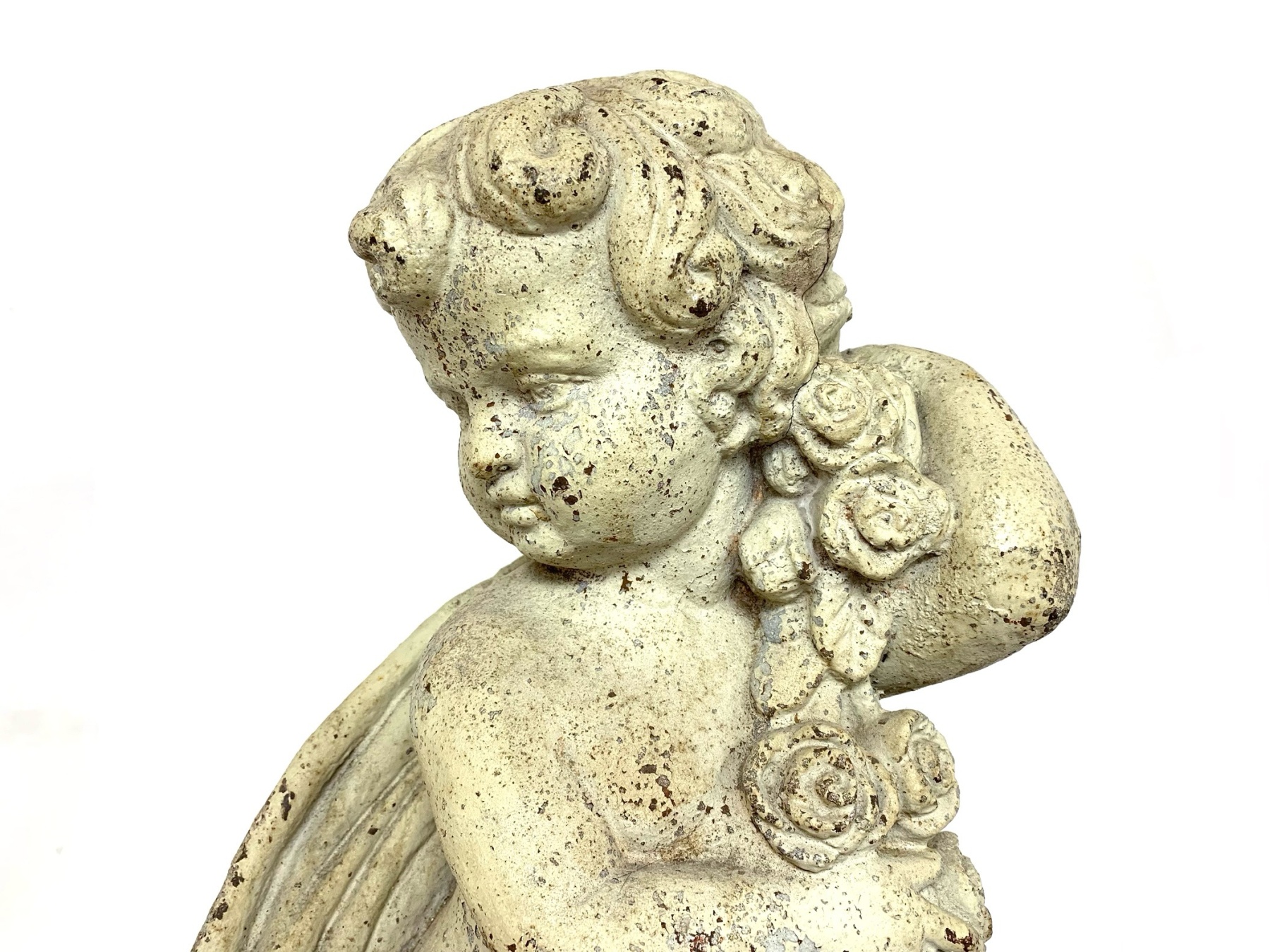 Antique cast iron garden statue in old white paint depicting a cherub or putto figure shown draped in cloth and holding a floral garland. The putto is surmounted on a plinth base.