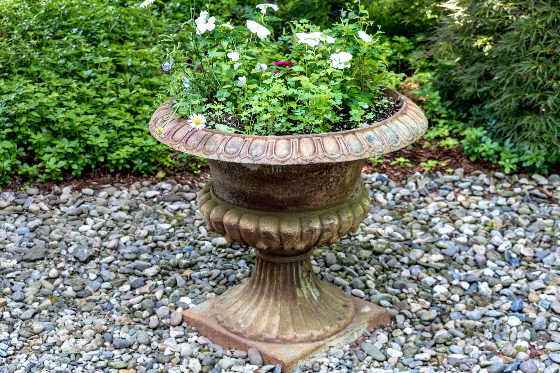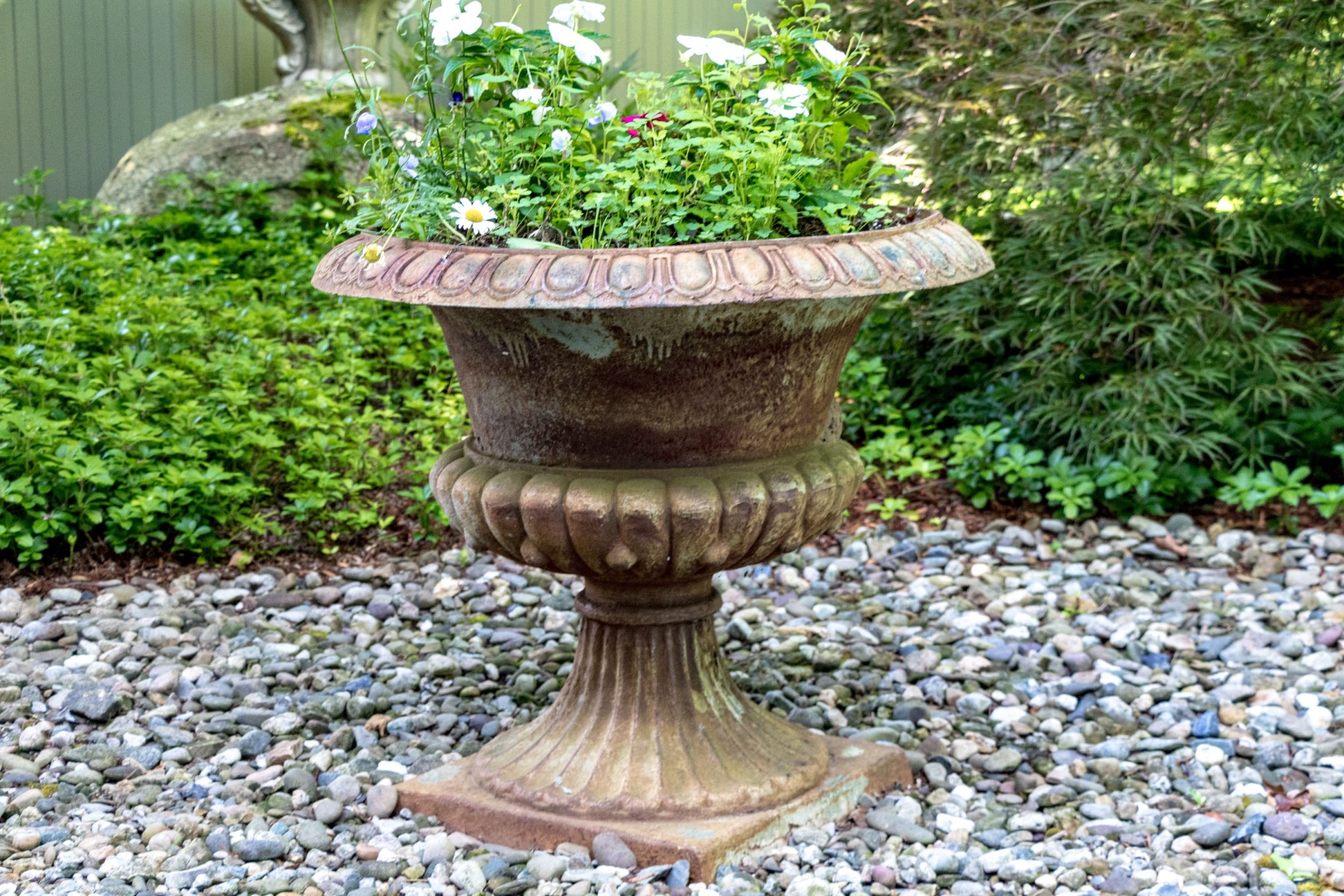 A delightful antique cast iron garden planter with a classic campana form showcasing an everted rim with petaled relief over a gently tapering body leading to a rotund gadrooned lower body. Raised with a fluted pedestal base with a square foot.