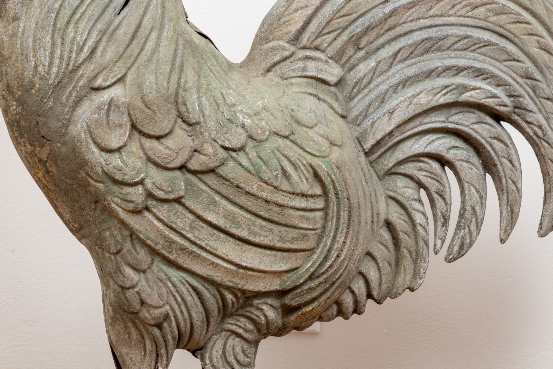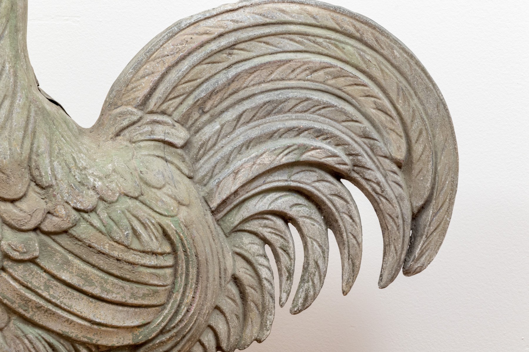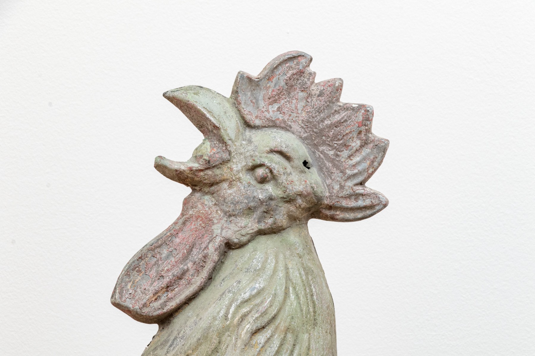 A fabulous antique cast hollow lead sculpture of a rooster in a wonderfully patinated neutral finish with subtle green undertones beautifully contrasting pale red accents. The rooster stands proudly with its head gently tilted back, posed crowing with its beak opened. Finely detailed throughout the feathers, following an impressive arched curve along the tail. The rooster's rod legs are mounted to a black base.