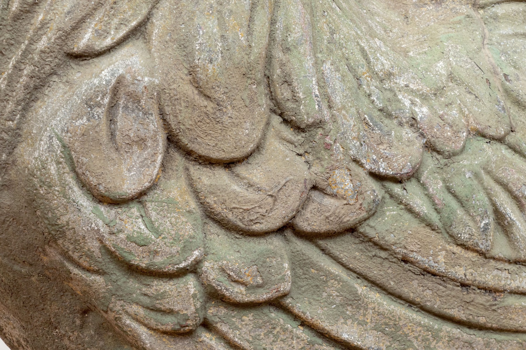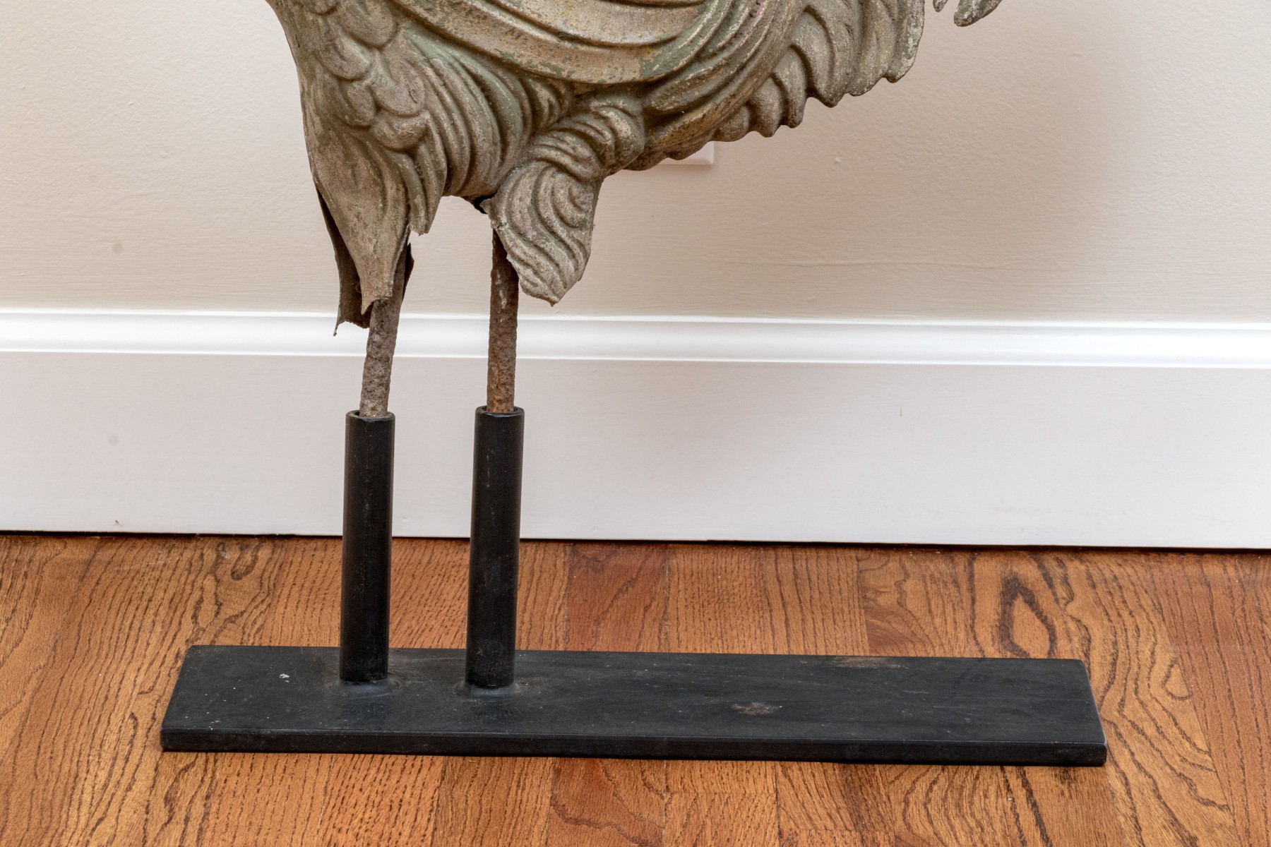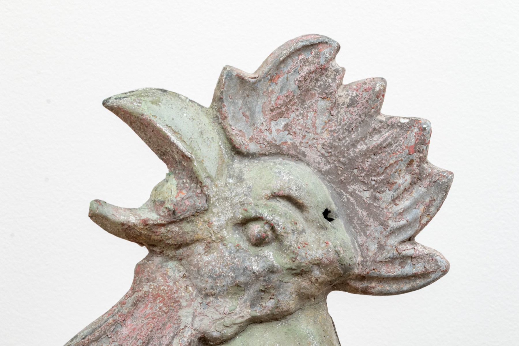 A fabulous antique cast hollow lead sculpture of a rooster in a wonderfully patinated neutral finish with subtle green undertones beautifully contrasting pale red accents. The rooster stands proudly with its head gently tilted back, posed crowing with its beak opened. Finely detailed throughout the feathers, following an impressive arched curve along the tail. The rooster's rod legs are mounted to a black base.