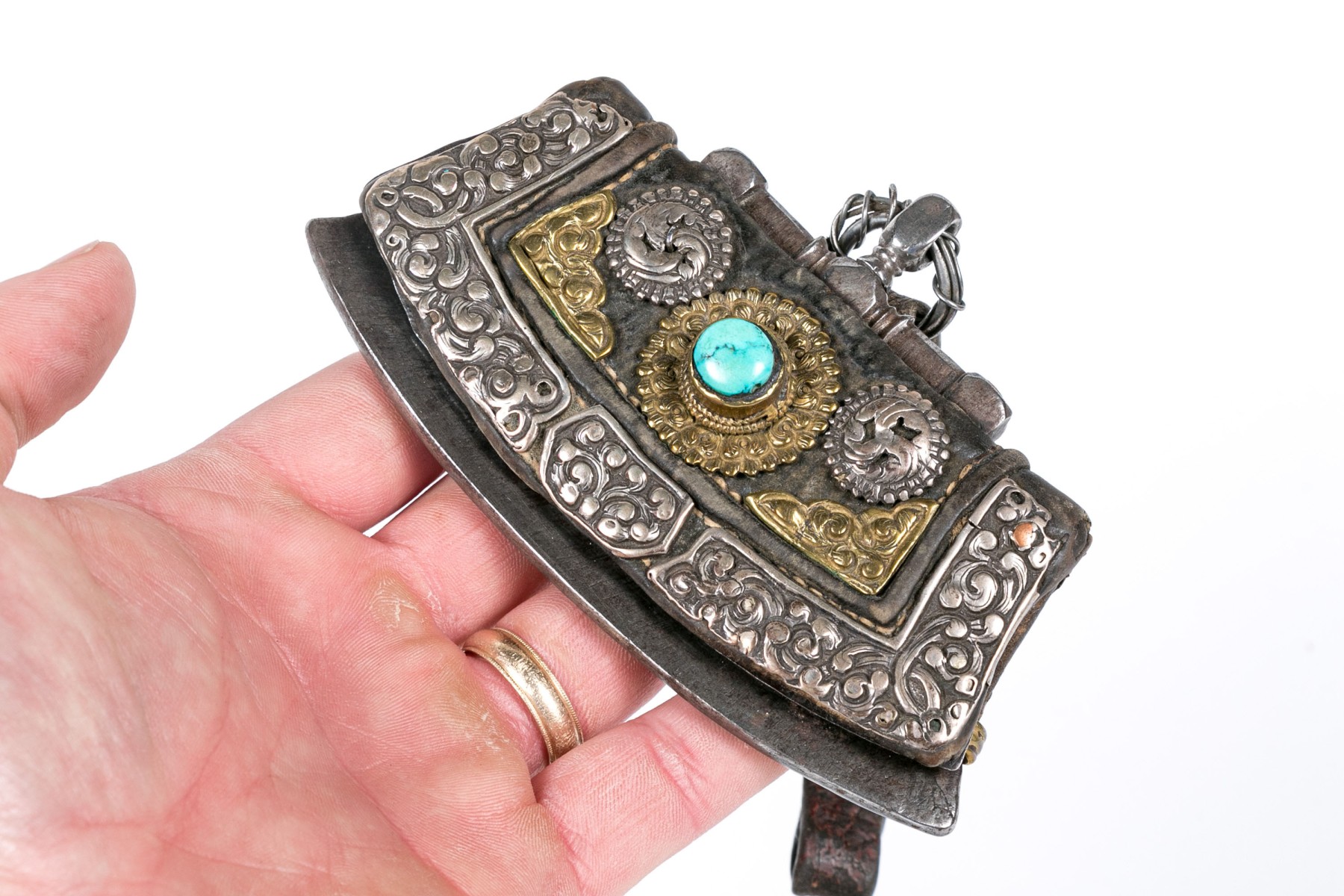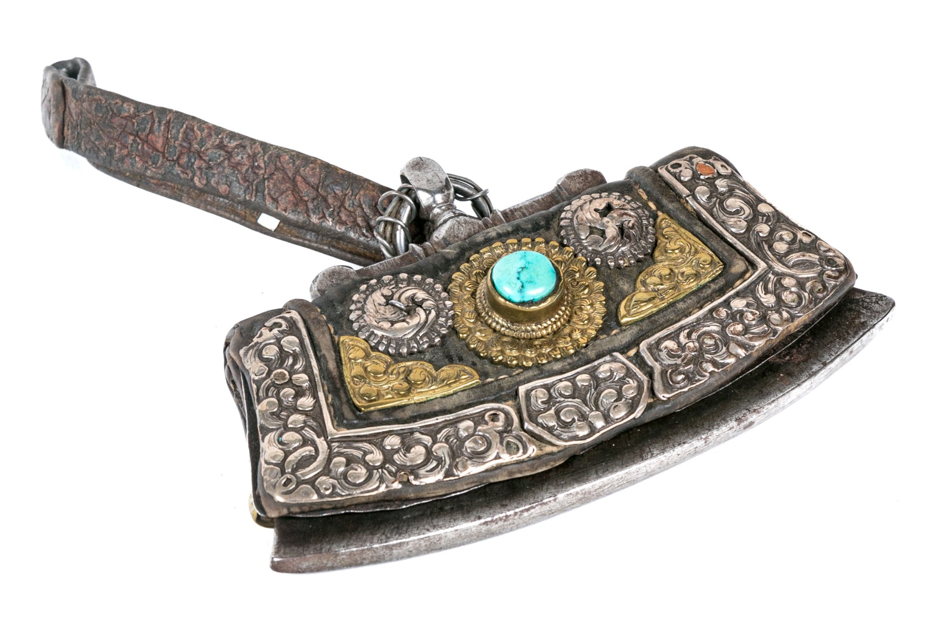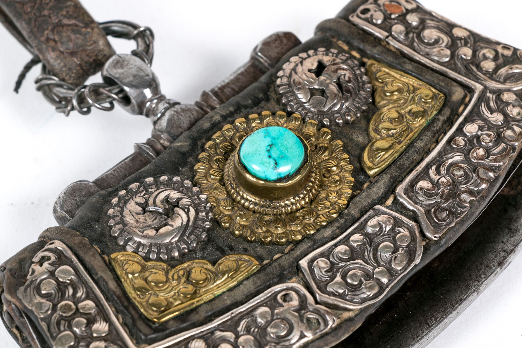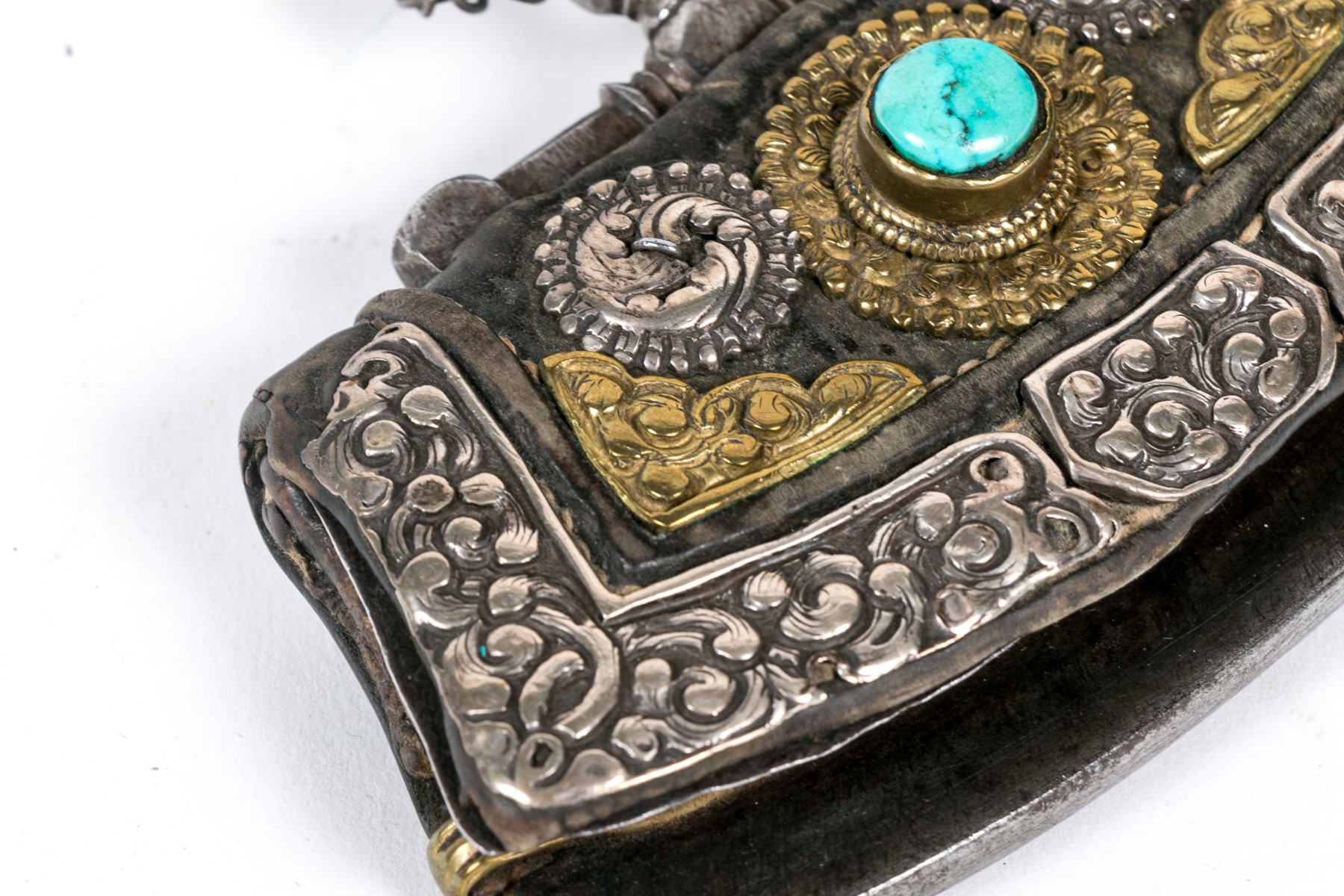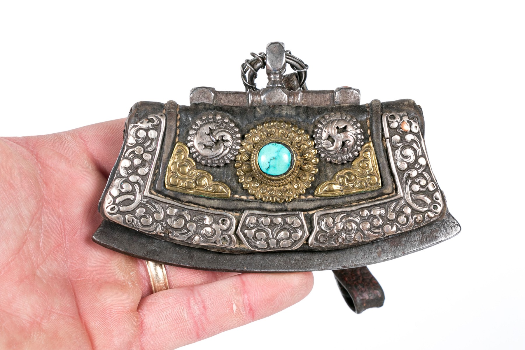 A shaped rectangular thin leather purse with a metal frame and silver and gilt scrolled overlaid decoration with a turquoise cabochon. With a leather strap.