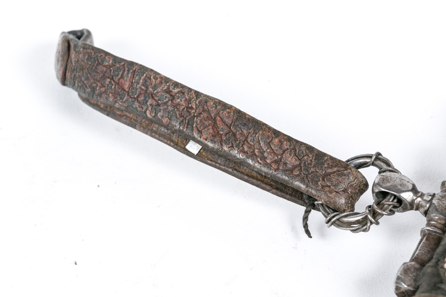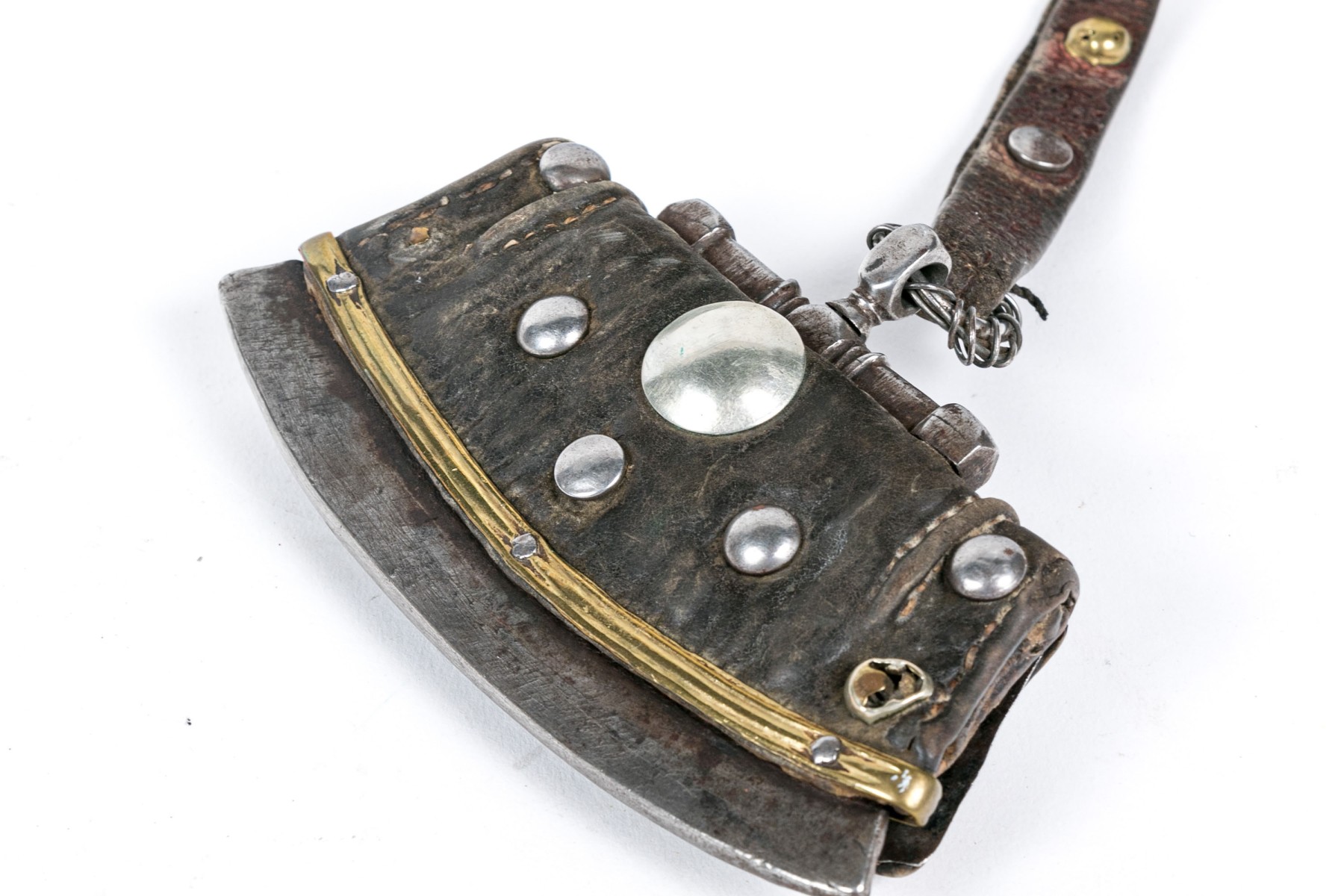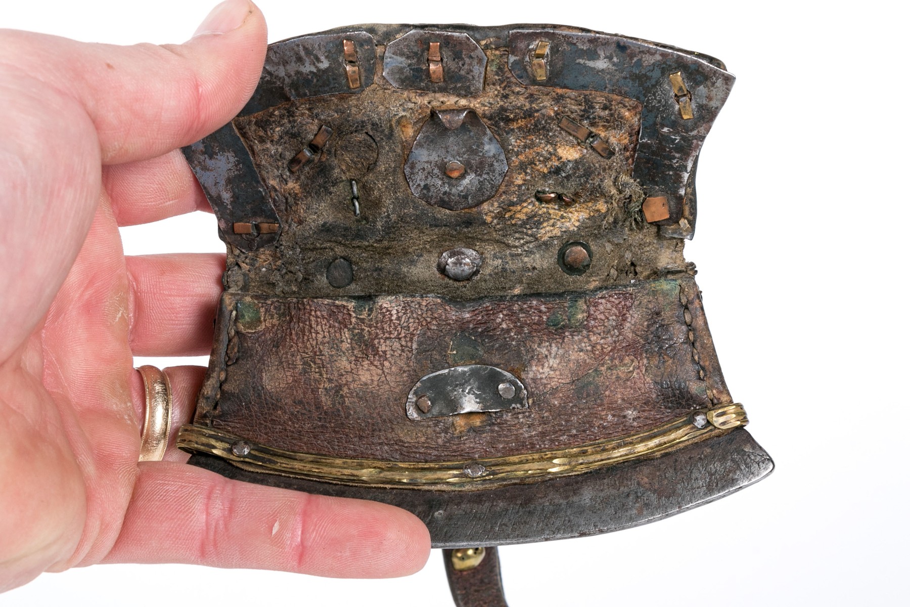 Condition: worn leather overall, the back with loss to one metal boss and break to another one. Please review the photos as they are part of the condition report.