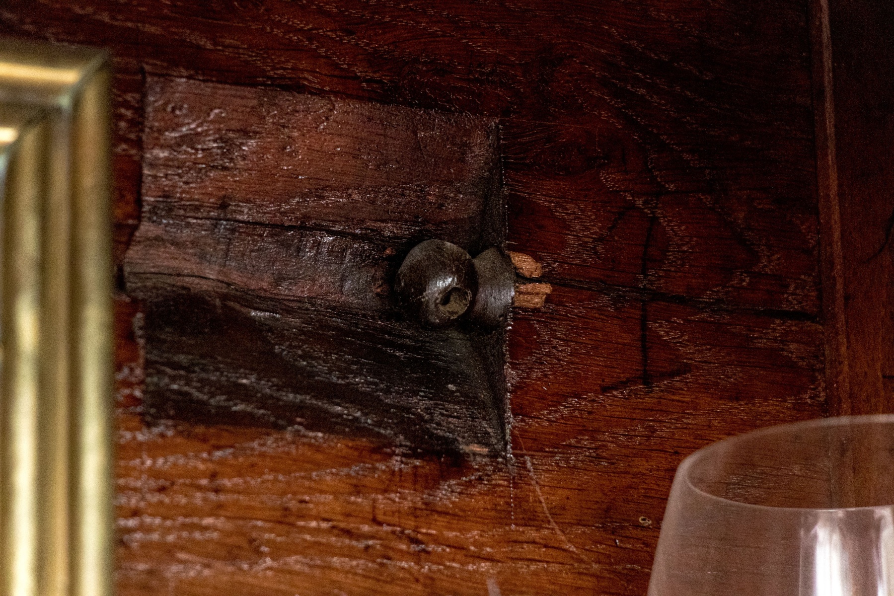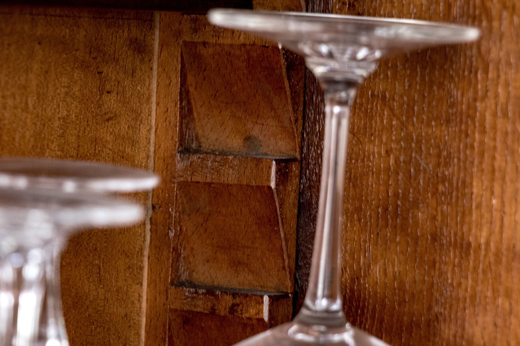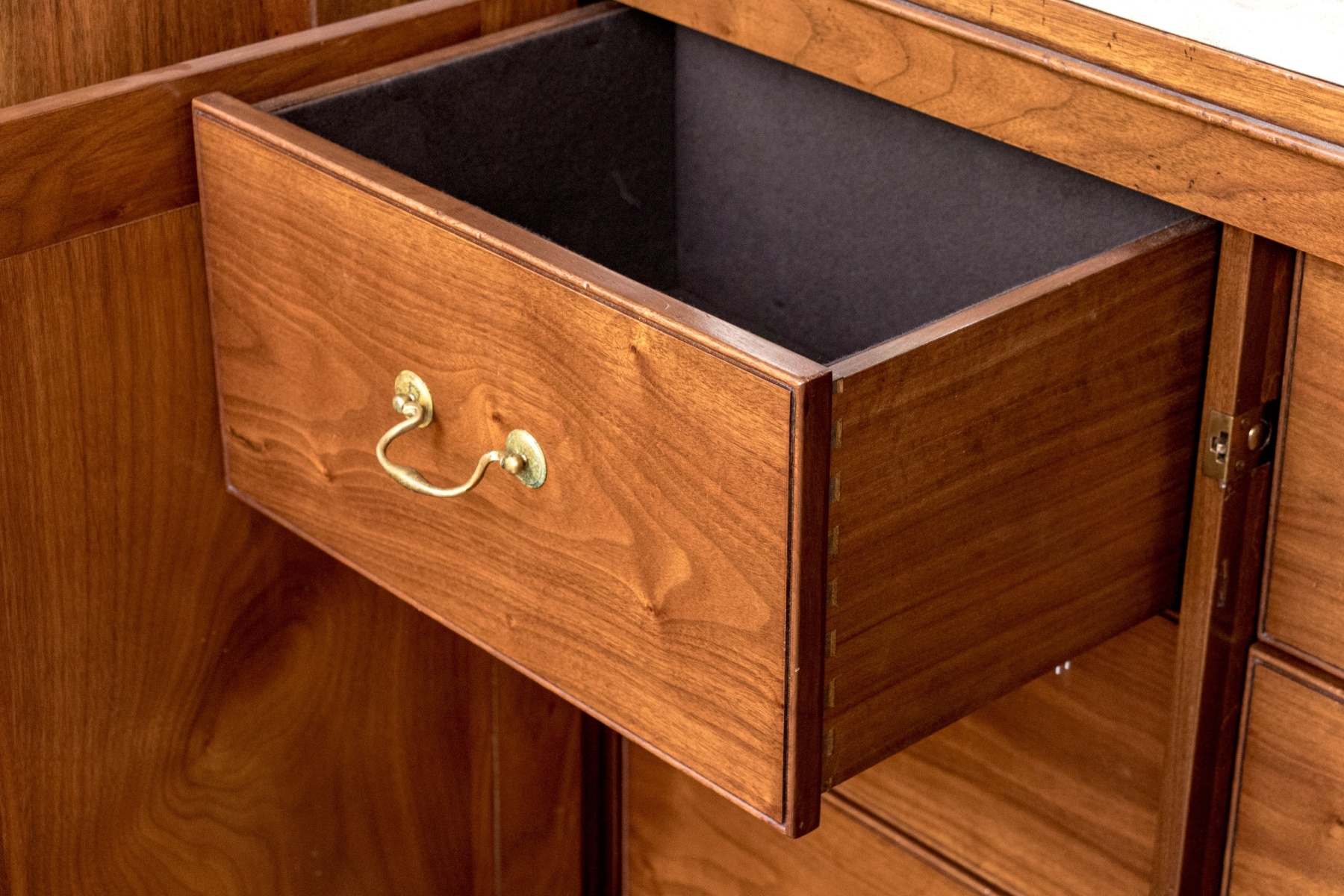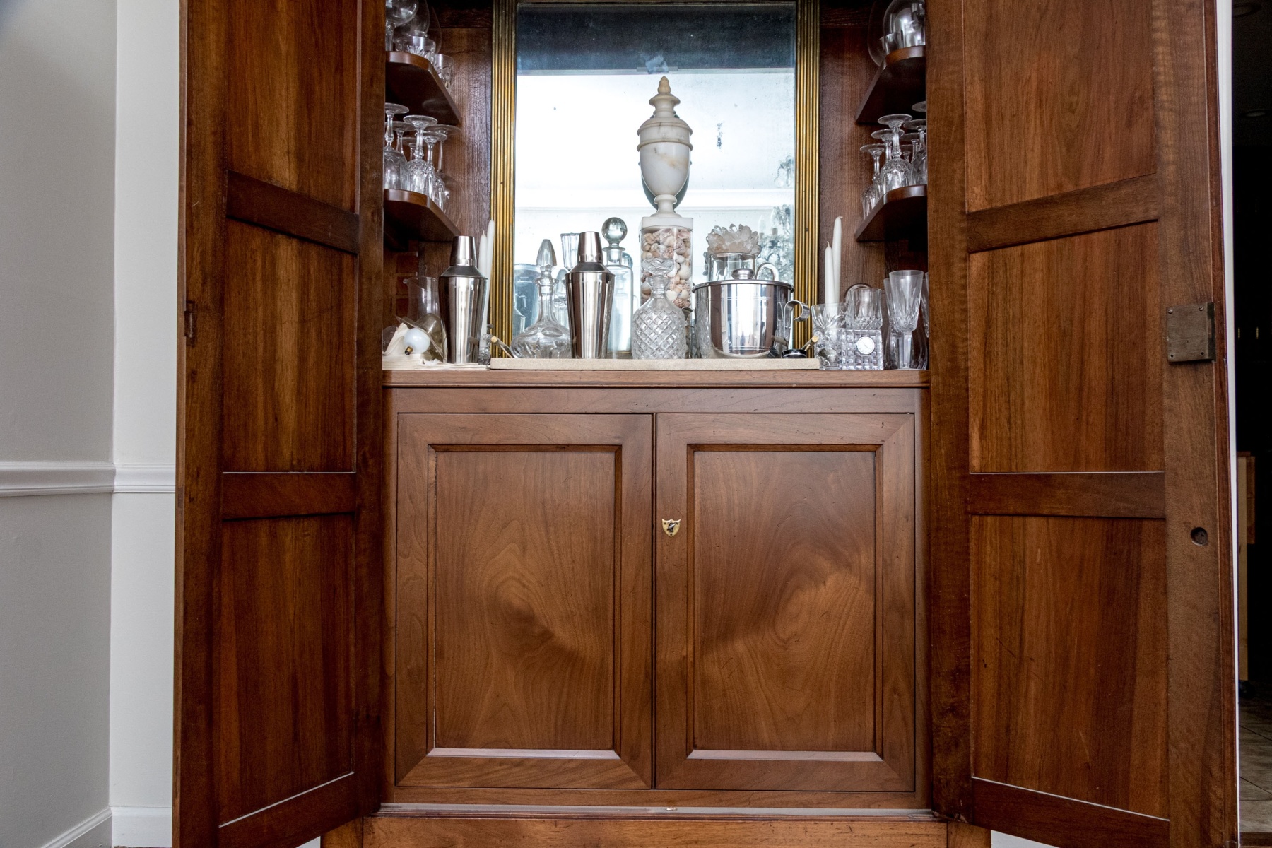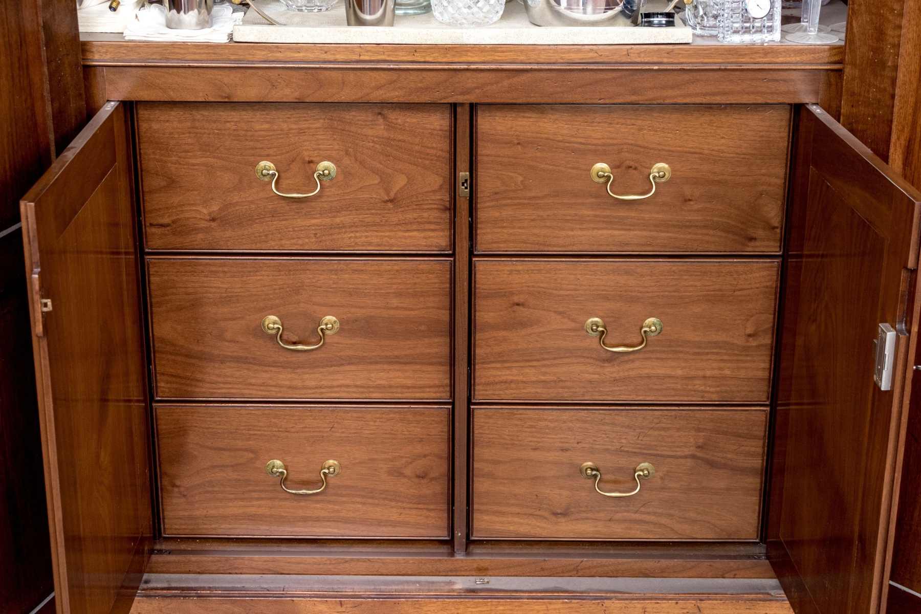 Inside, the cabinet showcases a pair of short drawers opening on the right side to four drawers, with a panel that has a brass button on the trim that can be pushed and opened to reveal a bay of four more drawers. Above the drawers, the section has been retrofitted as a bar cabinet with two shelves on either side for glassware.