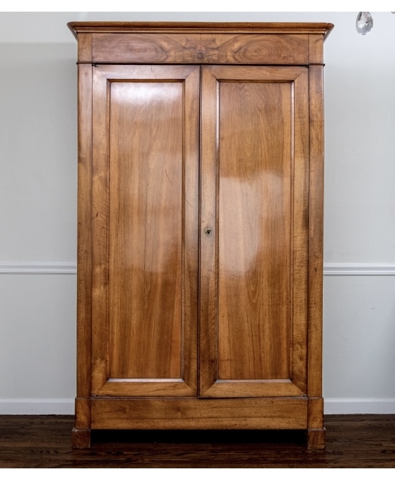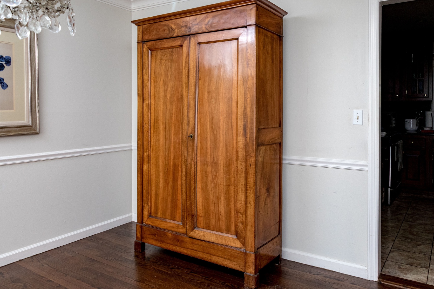 A delightful antique armoire converted to a bar cabinet, well crafted in rich, warm-toned medium brown cherry with eye-catching figured veneers. The case features a straight, overhanging top over a figured rectangular panel drawing the eye down to paneled double doors raised over block feet.