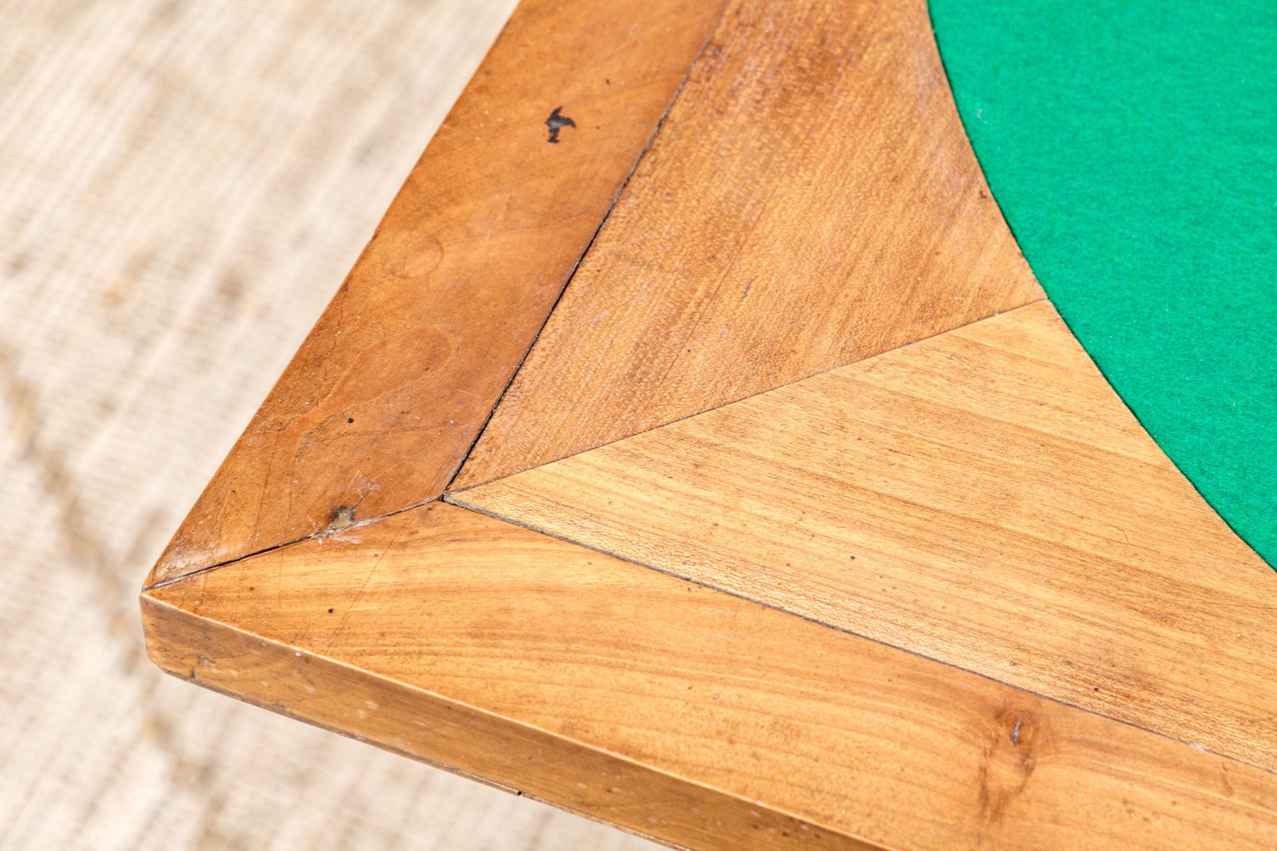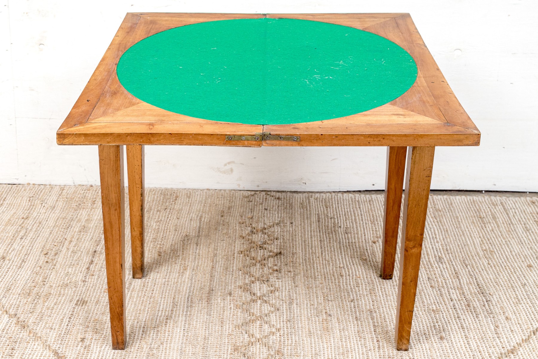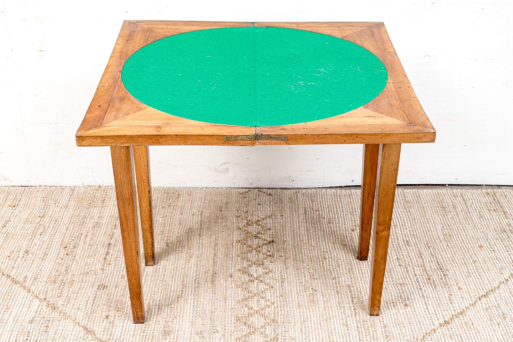 A rectangular plank constructed table with a top that turns and opens to a green felt topped circle. Raised on square tapering legs.
