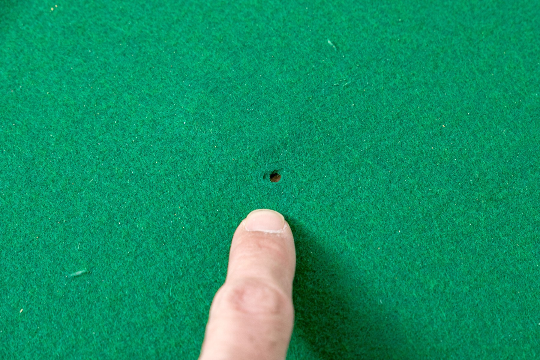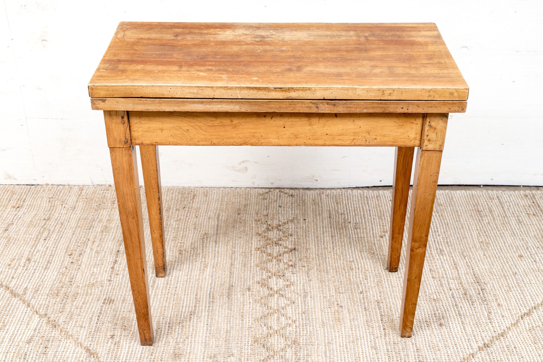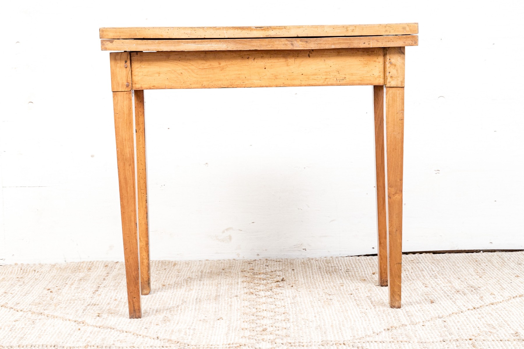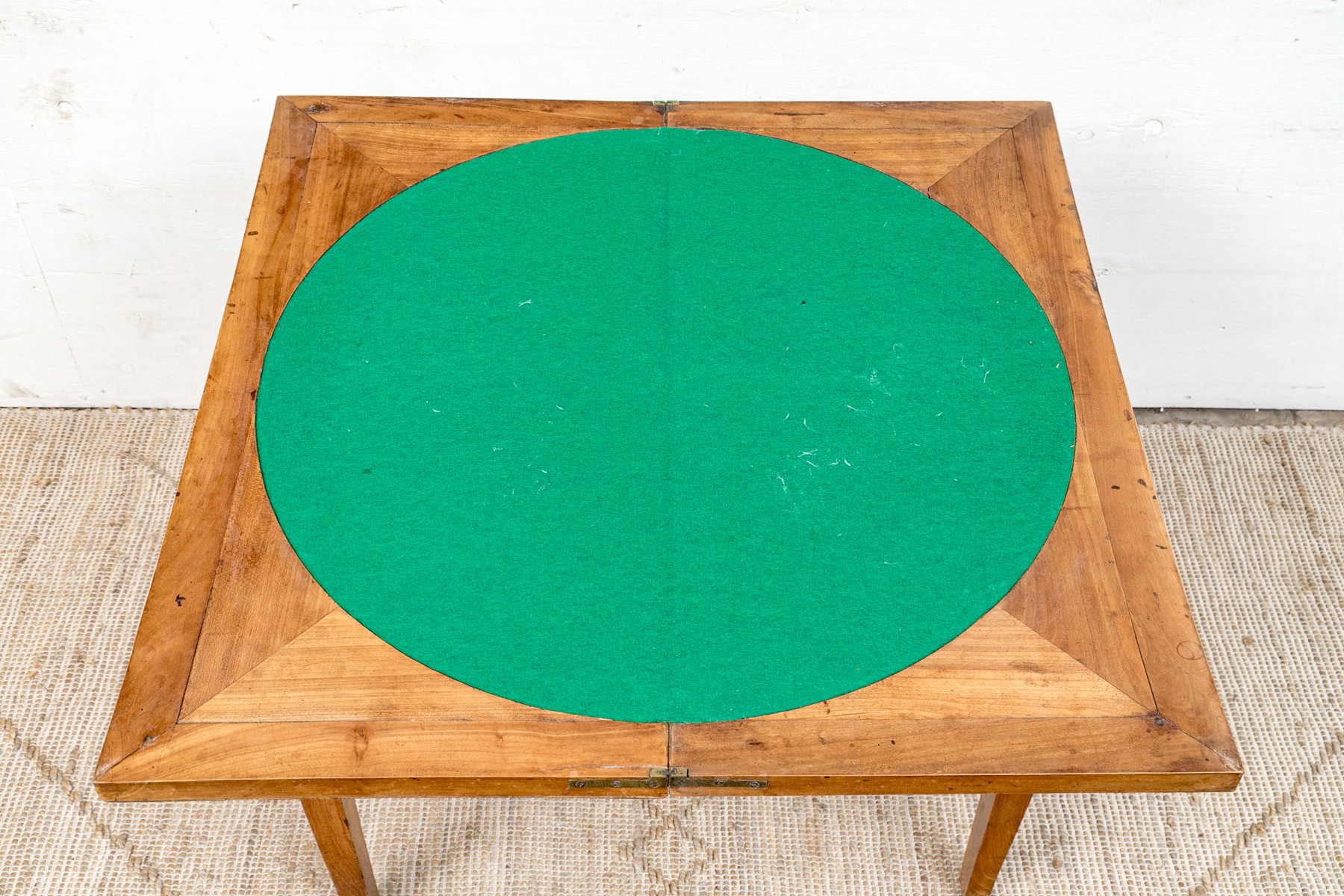 A rectangular plank constructed table with a top that turns and opens to a green felt topped circle. Raised on square tapering legs.