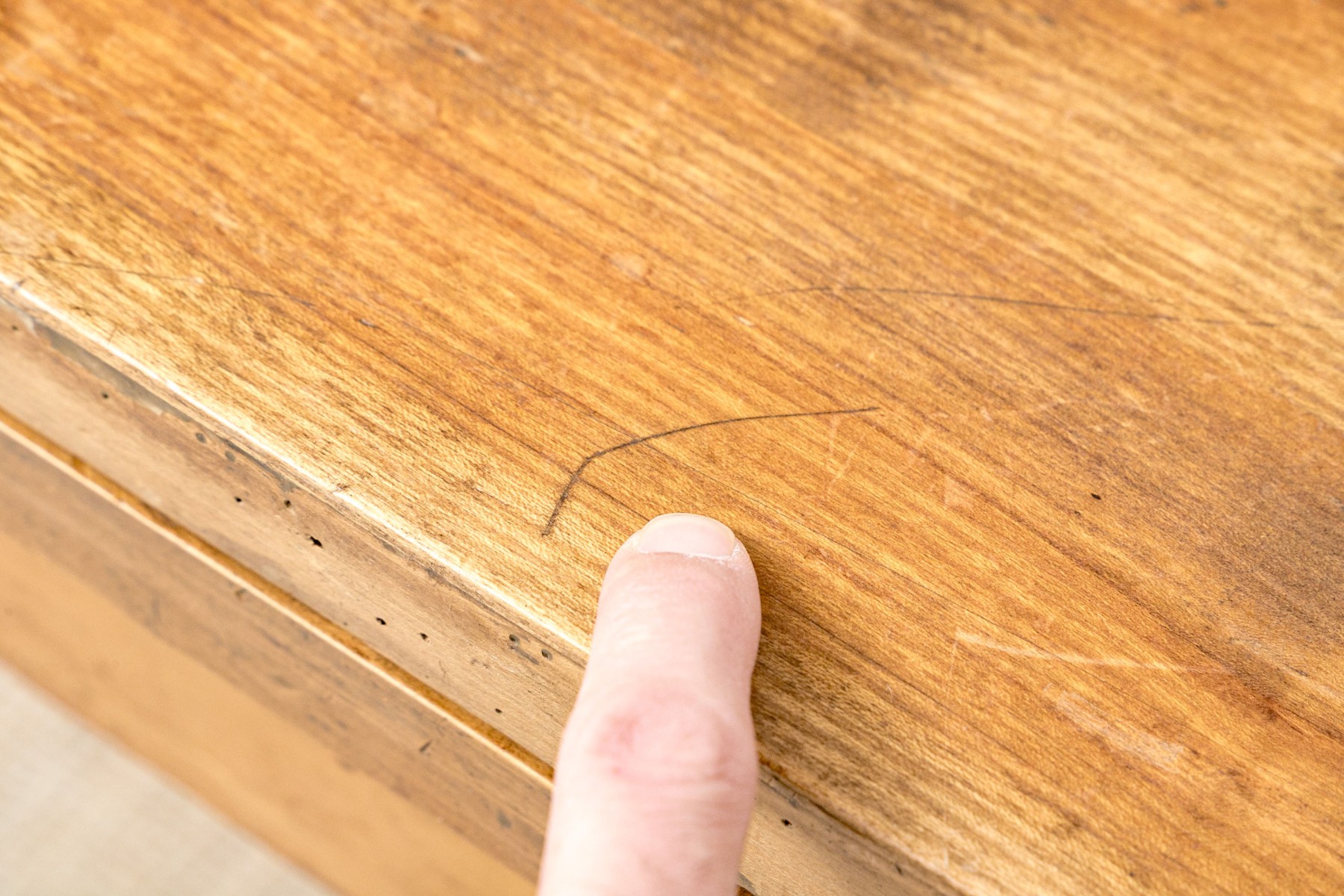 Condition: well- worn top with some spots on the planks, stains overall on the front. Please review the photos as they are part of the condition report.