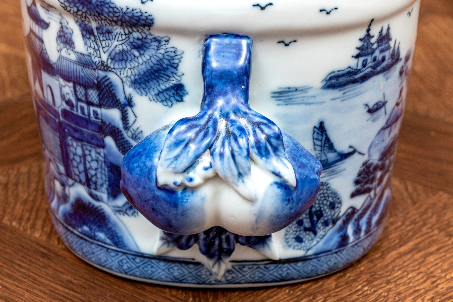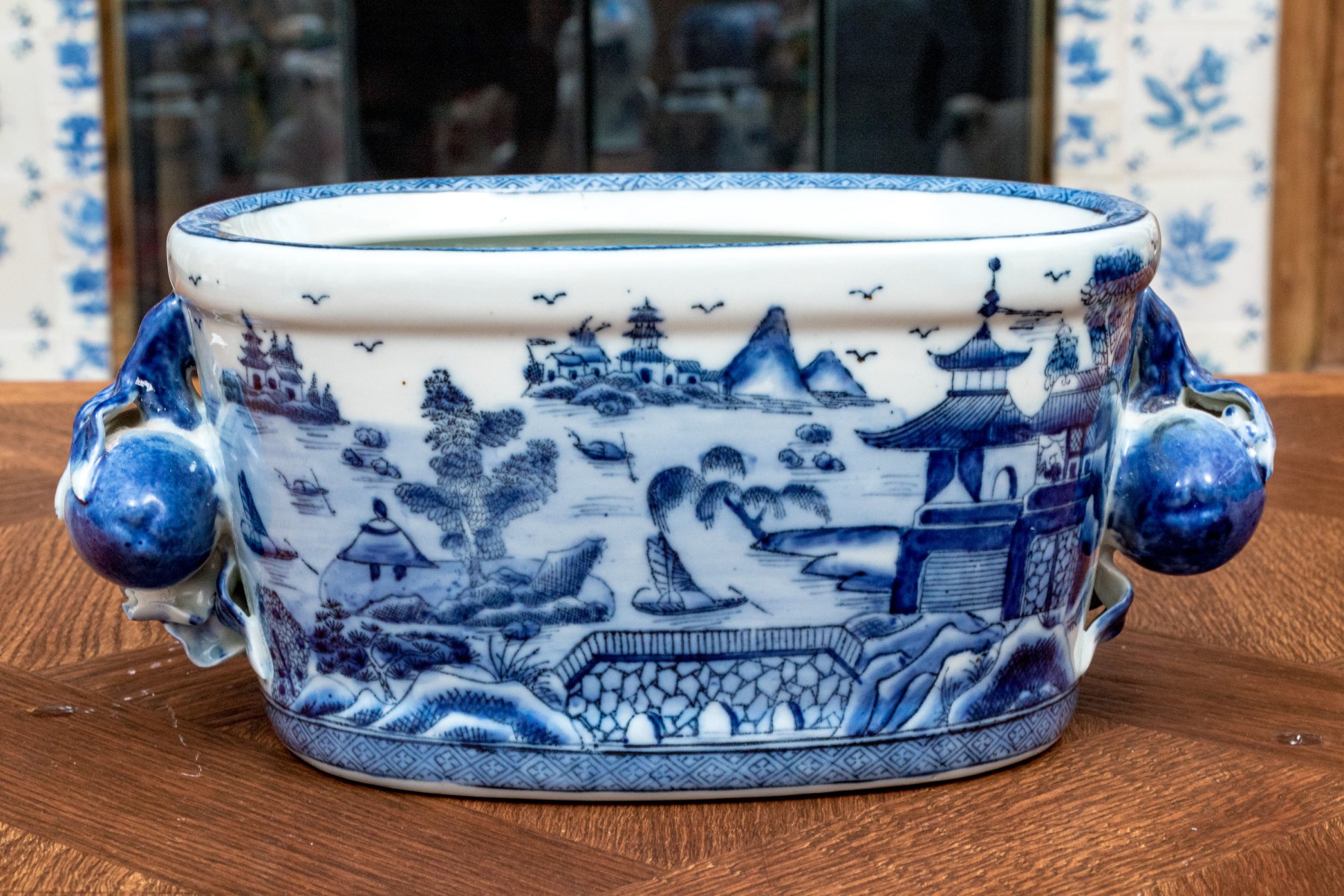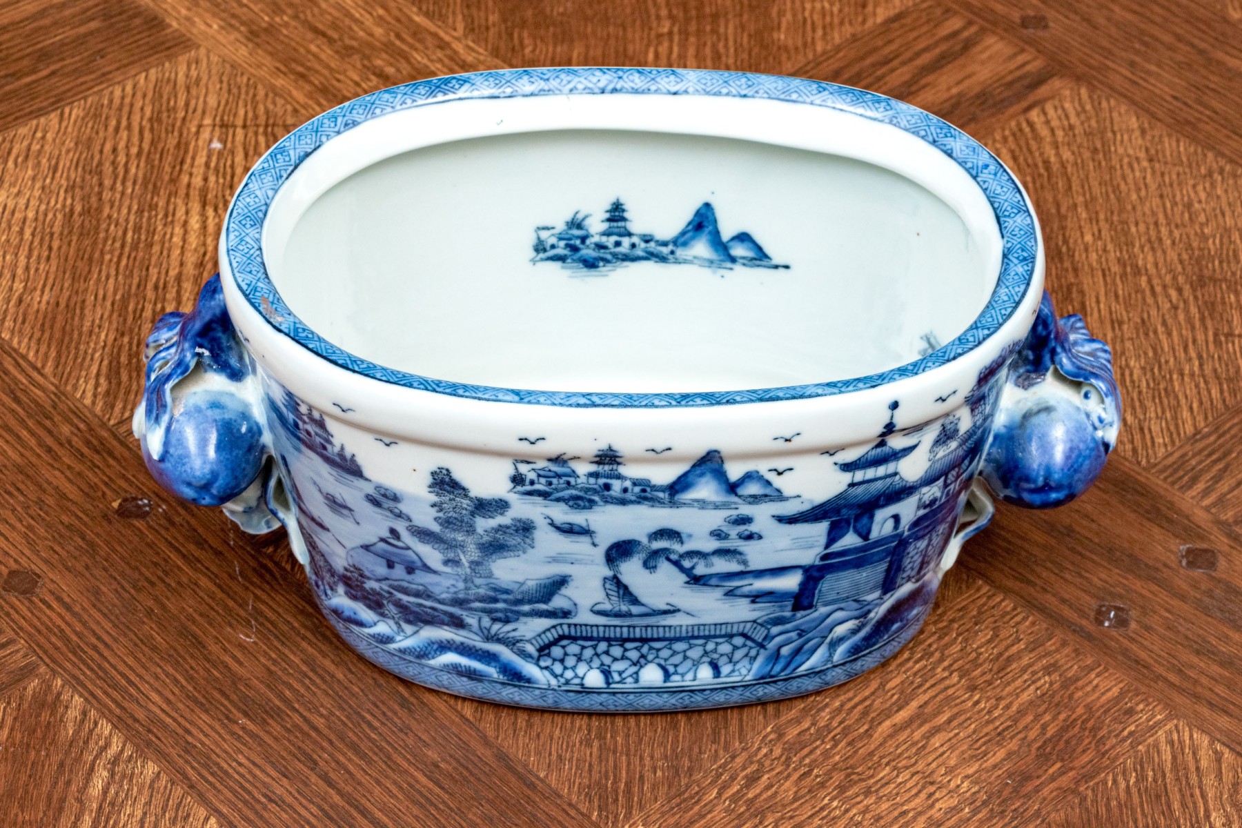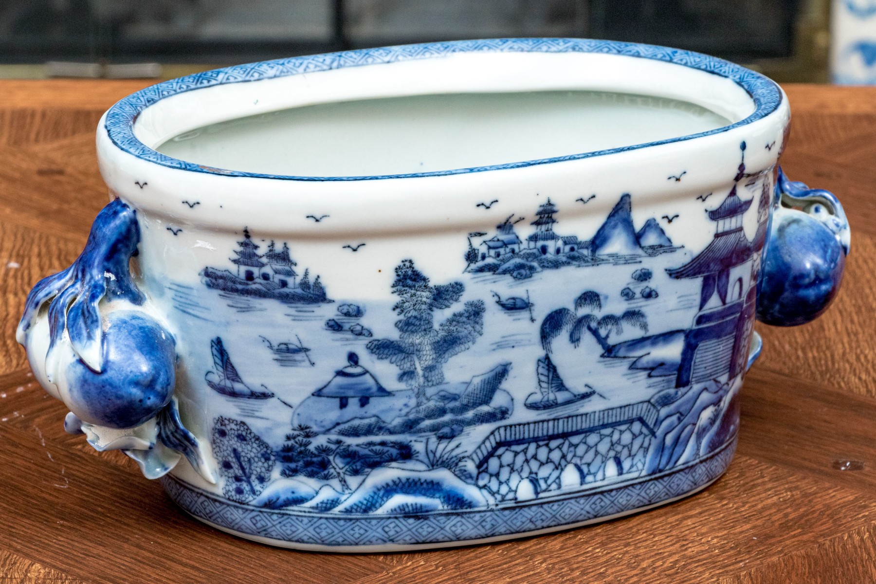 Traditional blue and white landscape painted, Chinese porcelain foot bath / small jardiniere, with applied fruit and flower handles, stamped beneath with crown inclusive of date 1897.