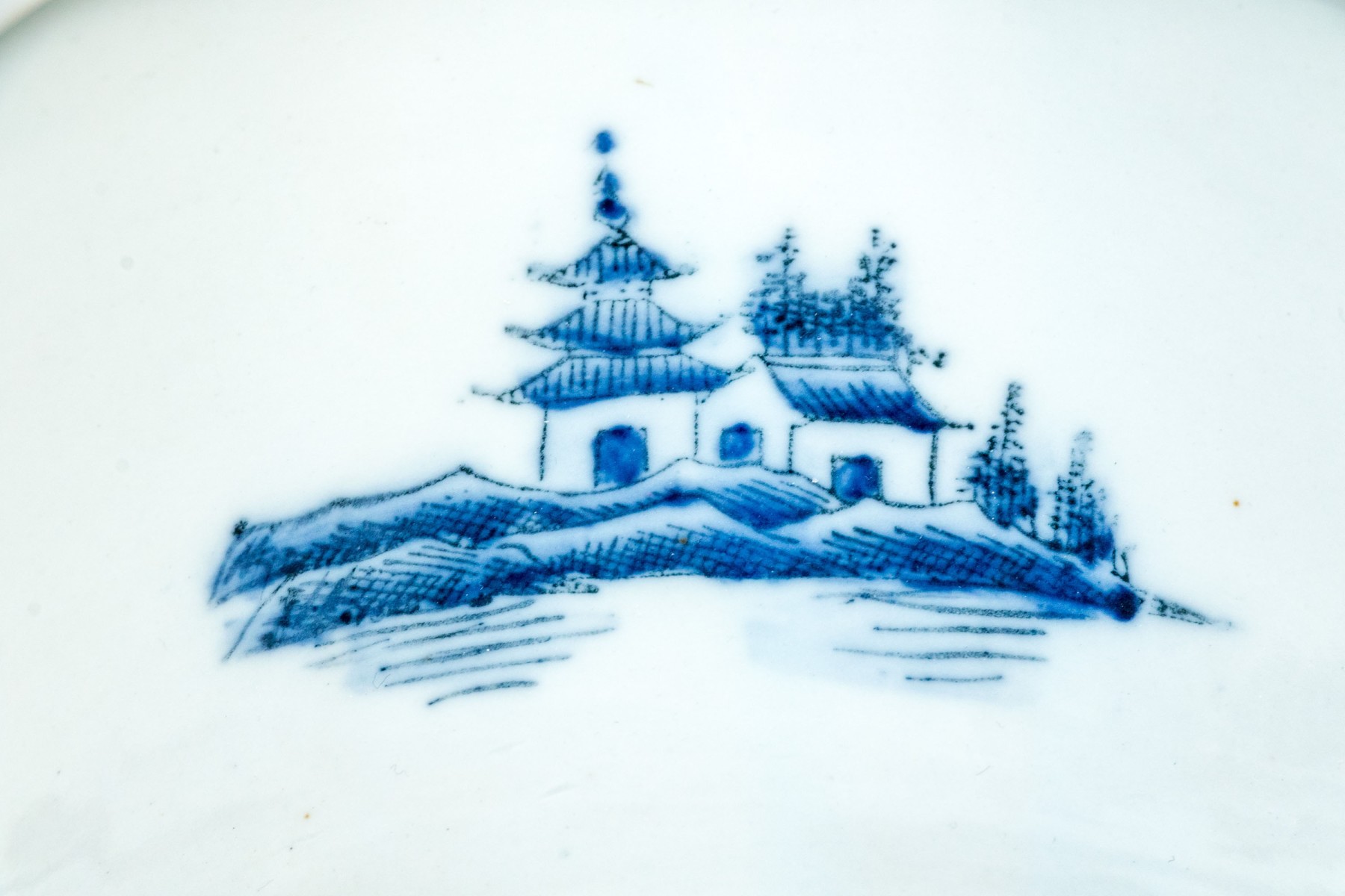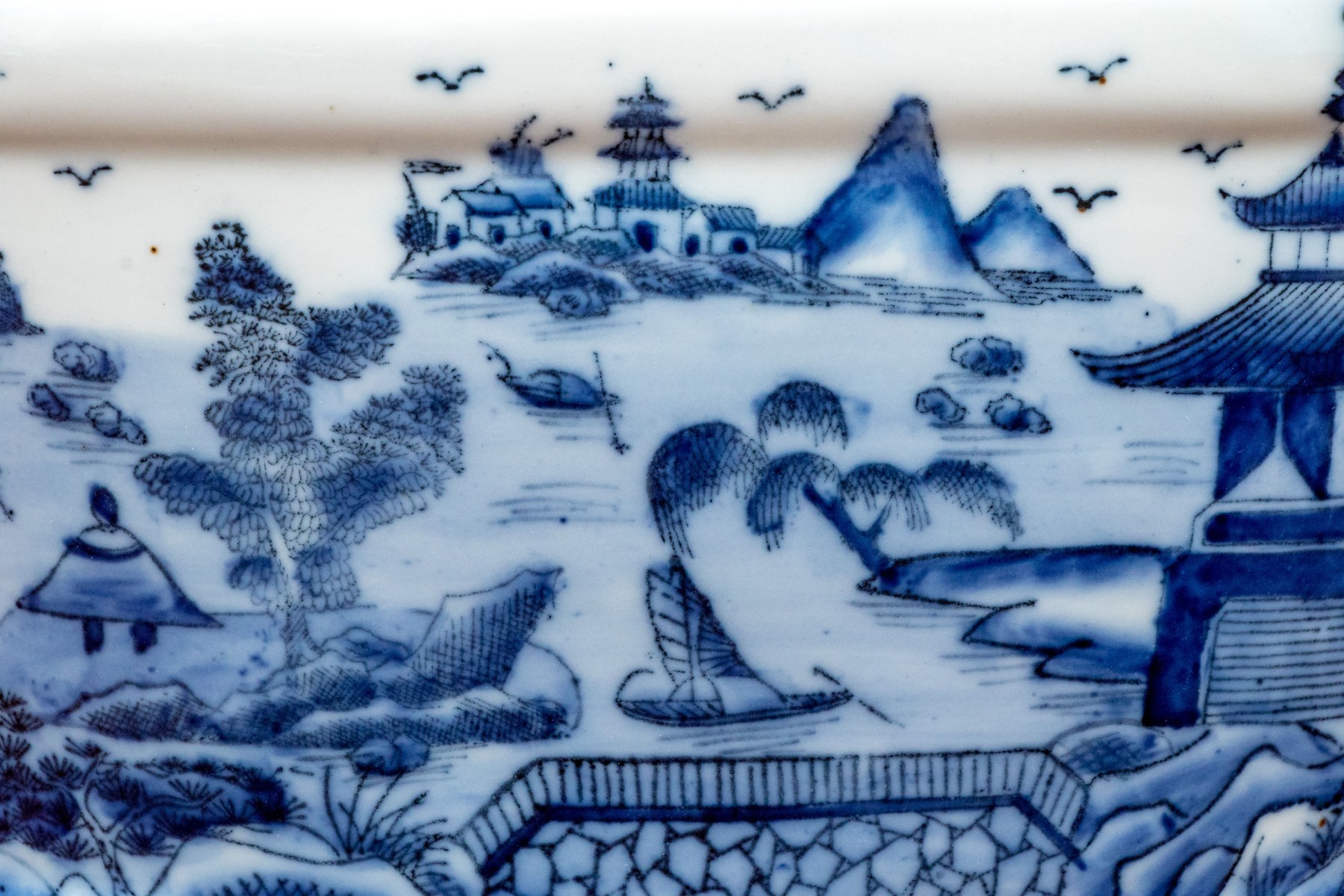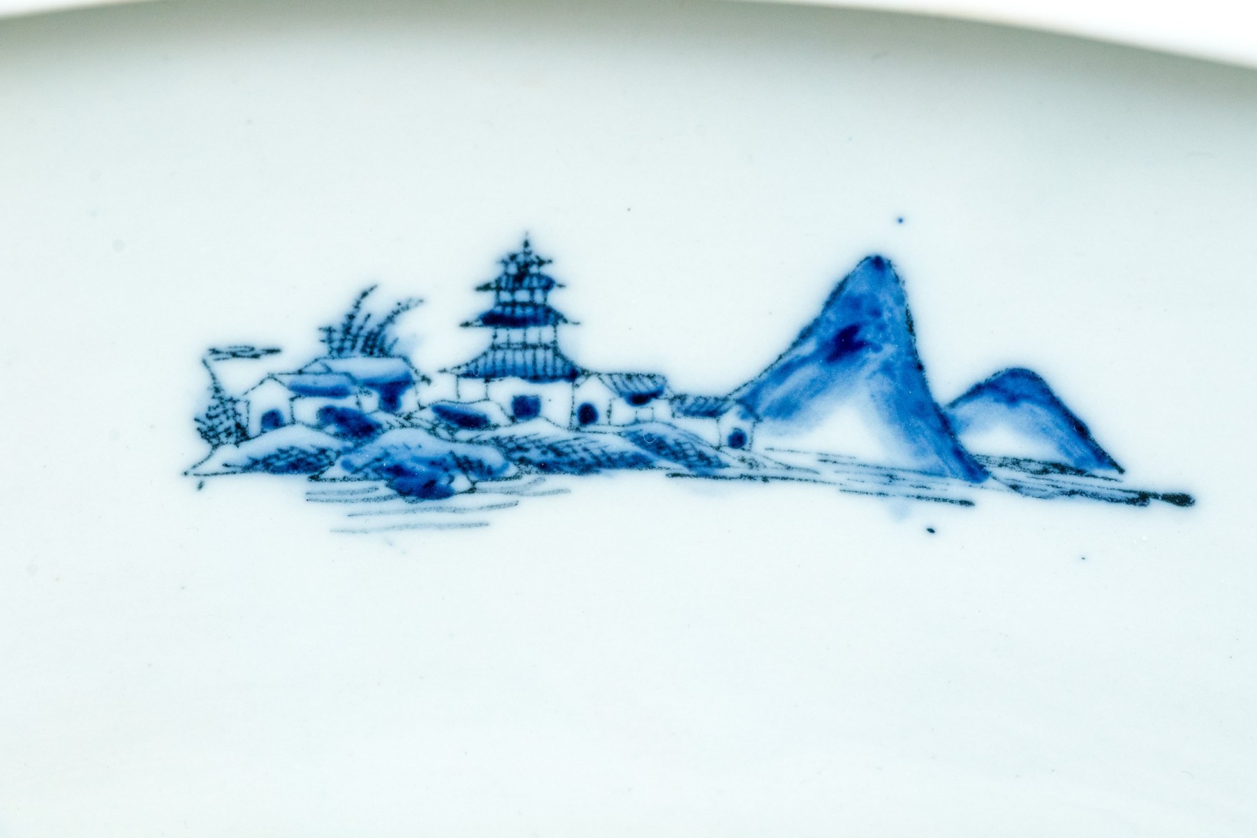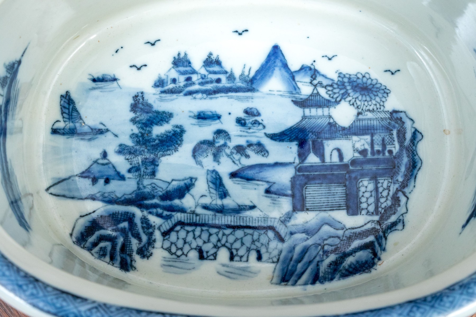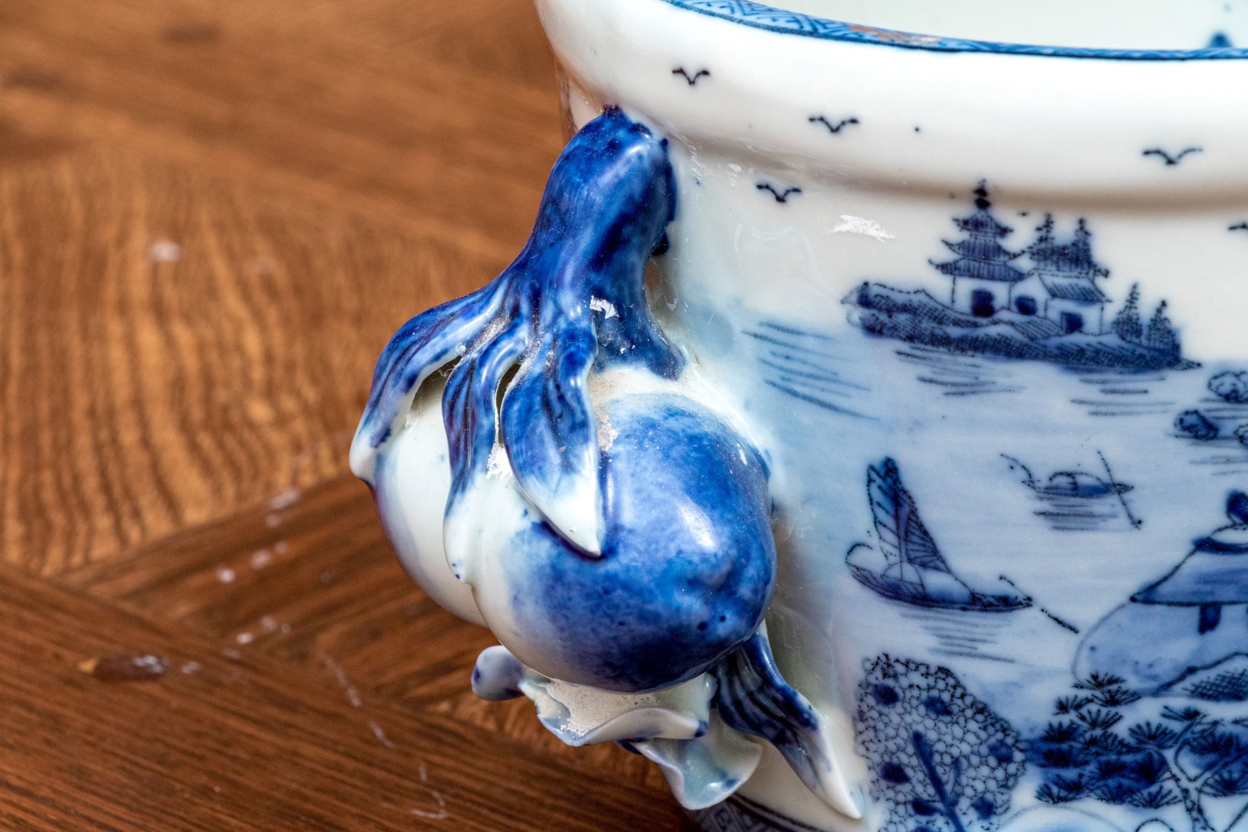 Traditional blue and white landscape painted, Chinese porcelain foot bath / small jardiniere, with applied fruit and flower handles, stamped beneath with crown inclusive of date 1897.