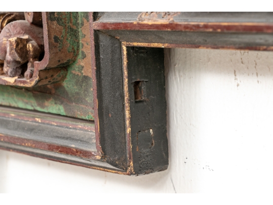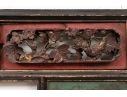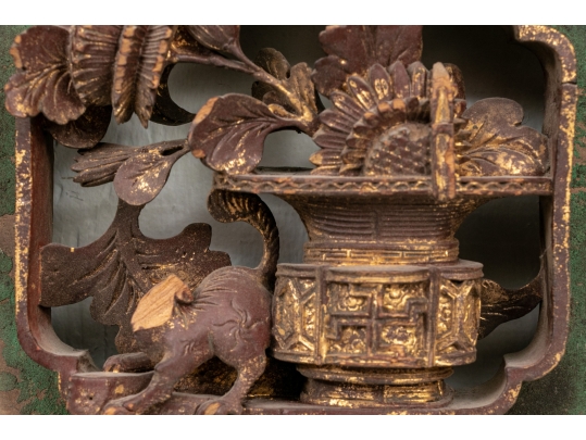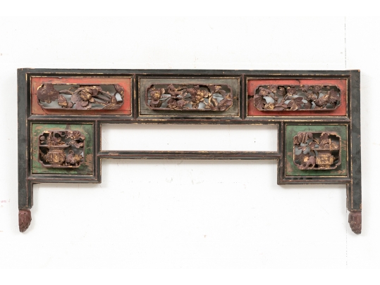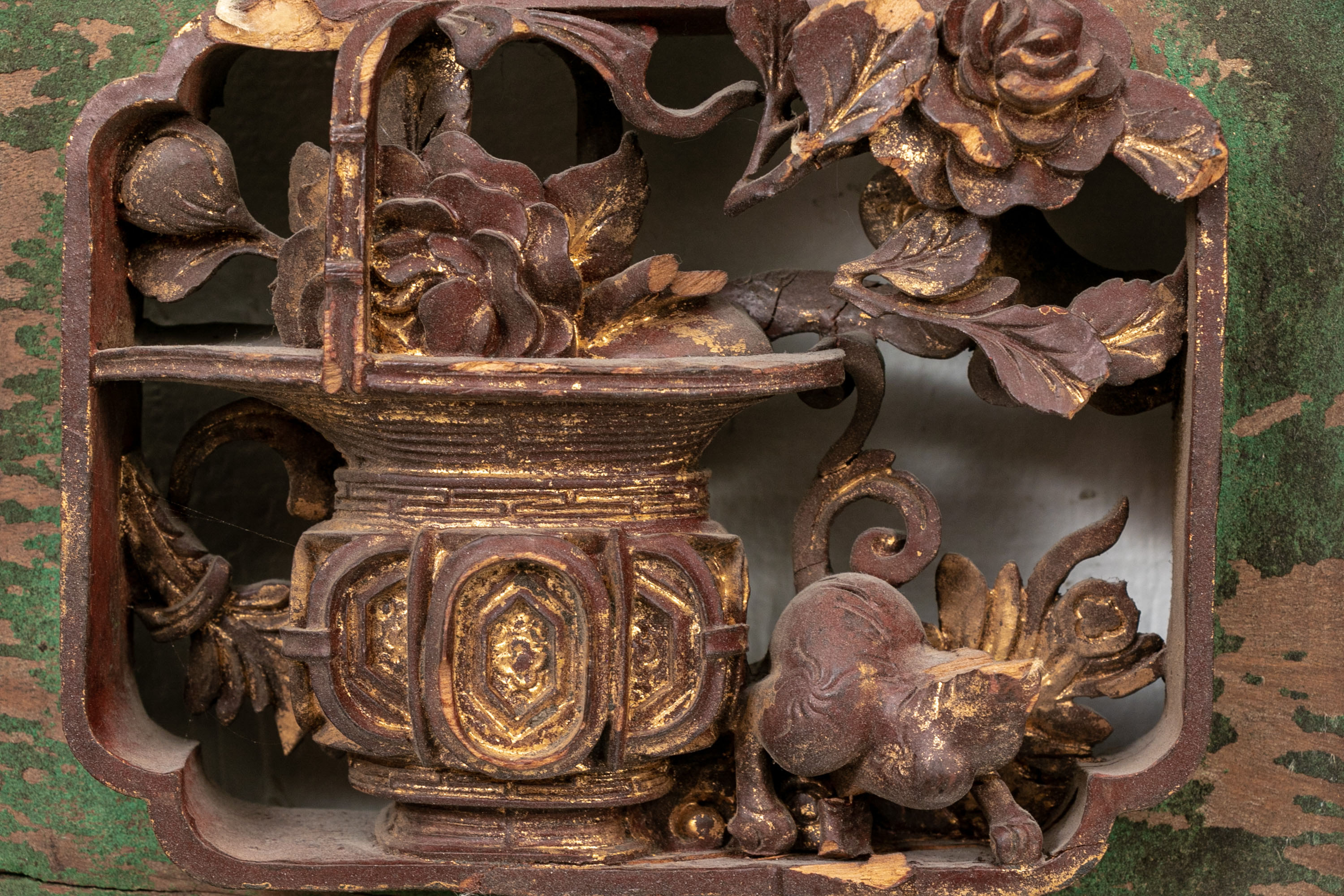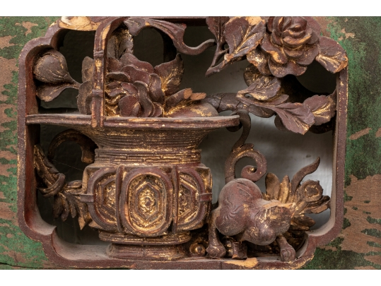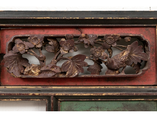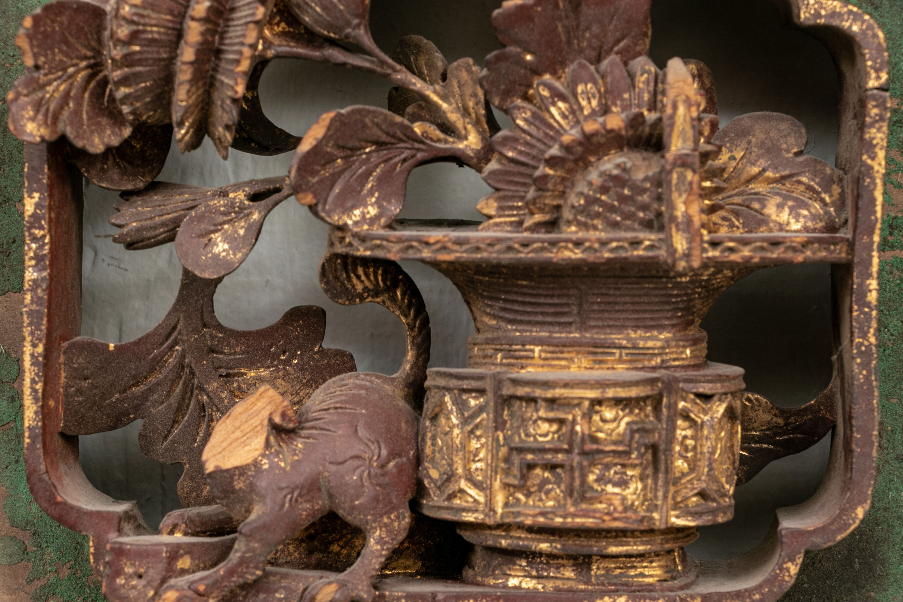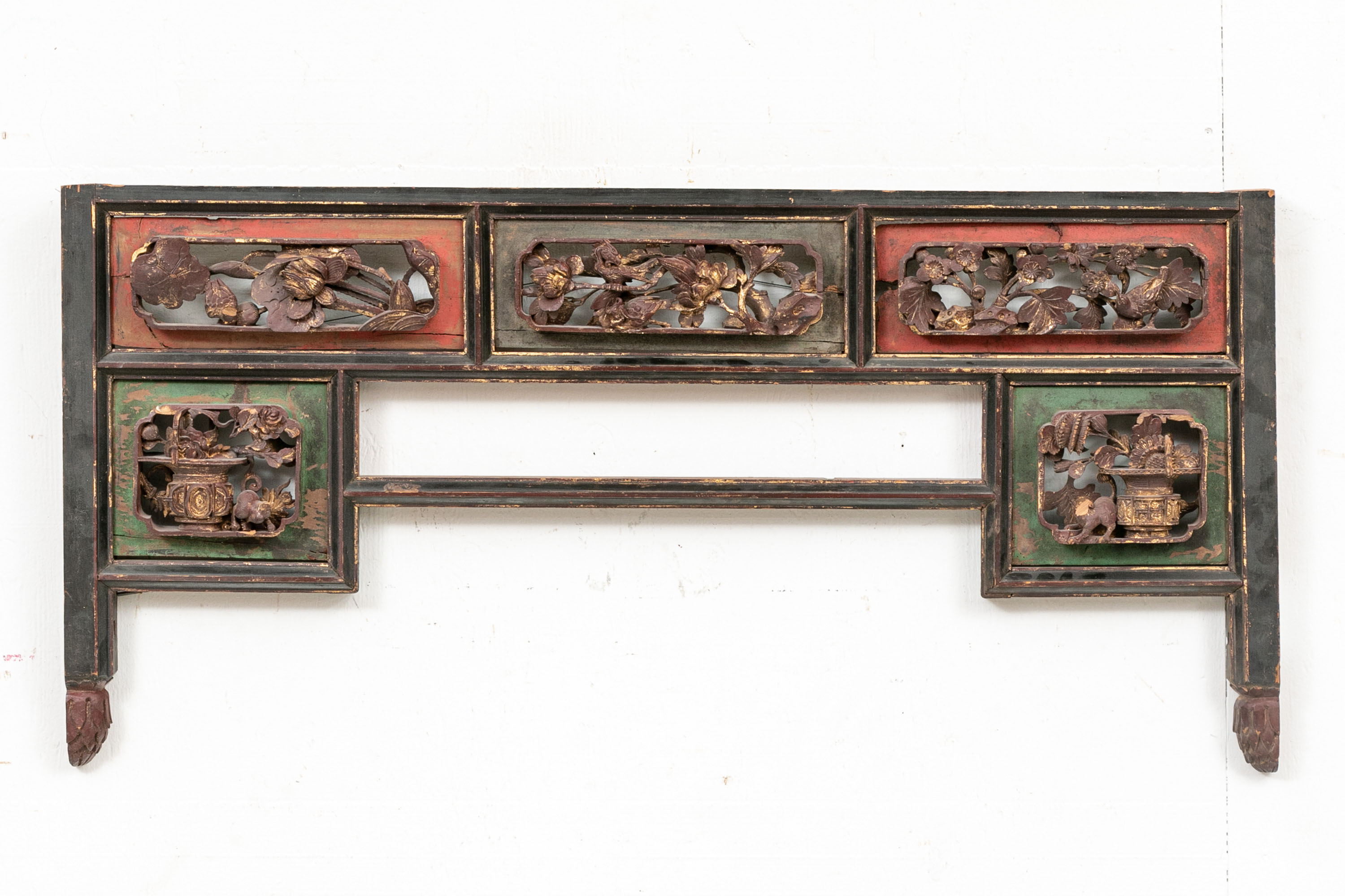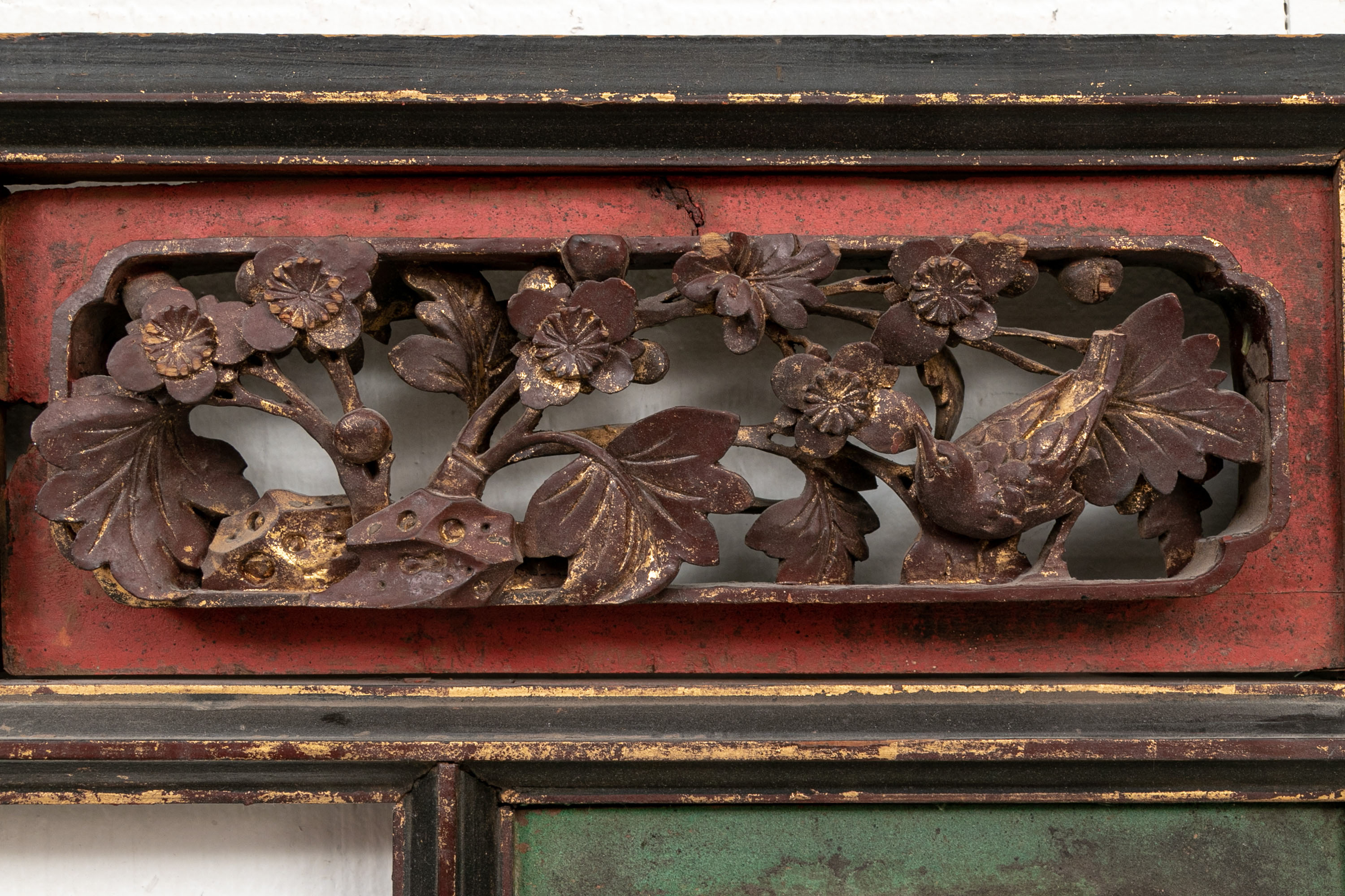 A rectangular stepped piece with high relief carved, gilt and painted shaped panels. With flowers on the top panels with birds and a phoenix on red and green backgrounds. The lower square shaped panels with opposing vases with flowers and monster figures below (the right one with loss to the head) on green backgrounds. The green painted frame with a stretcher and artichoke terminals on the sides. Unpainted back.