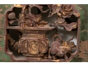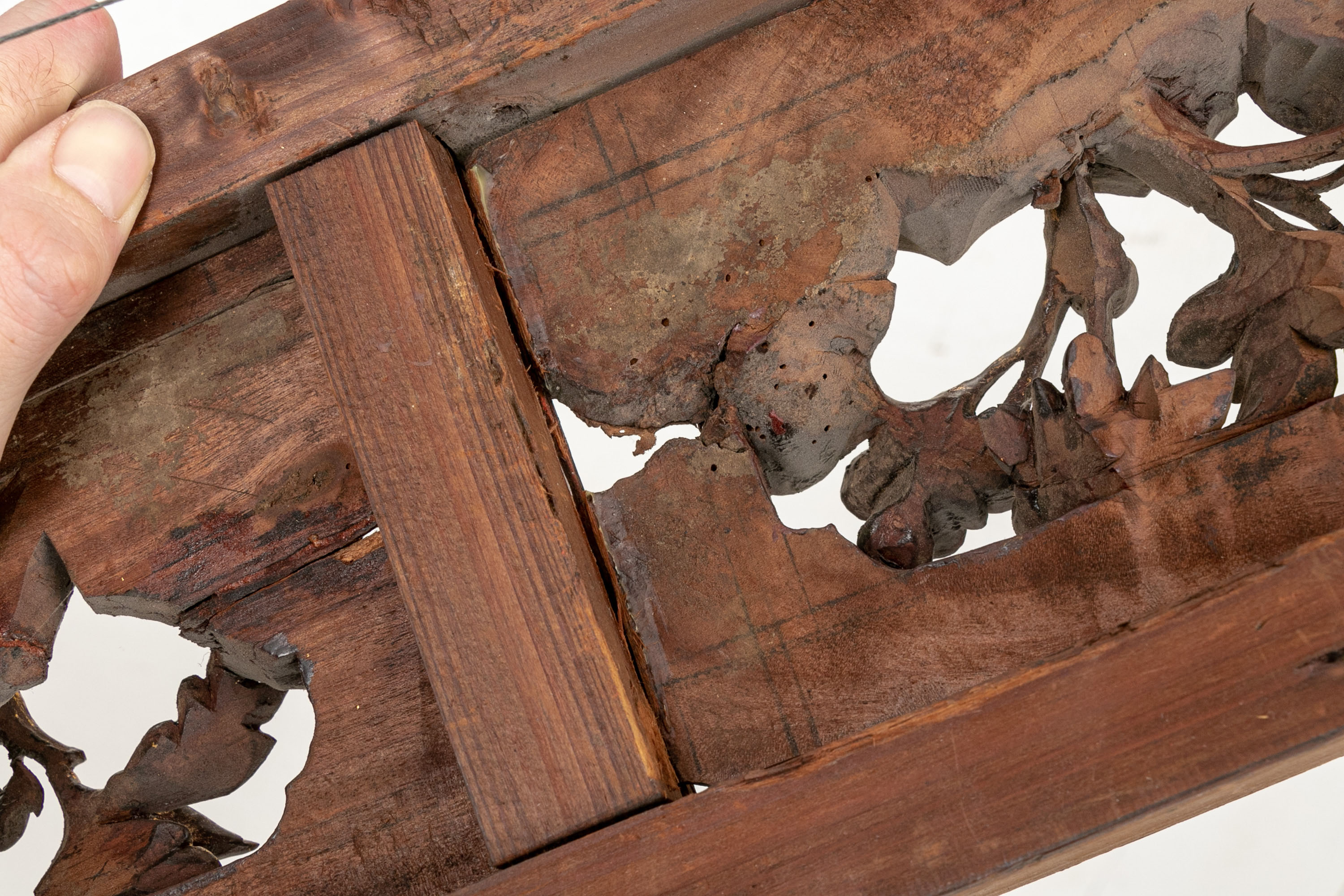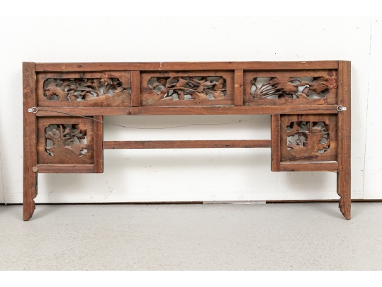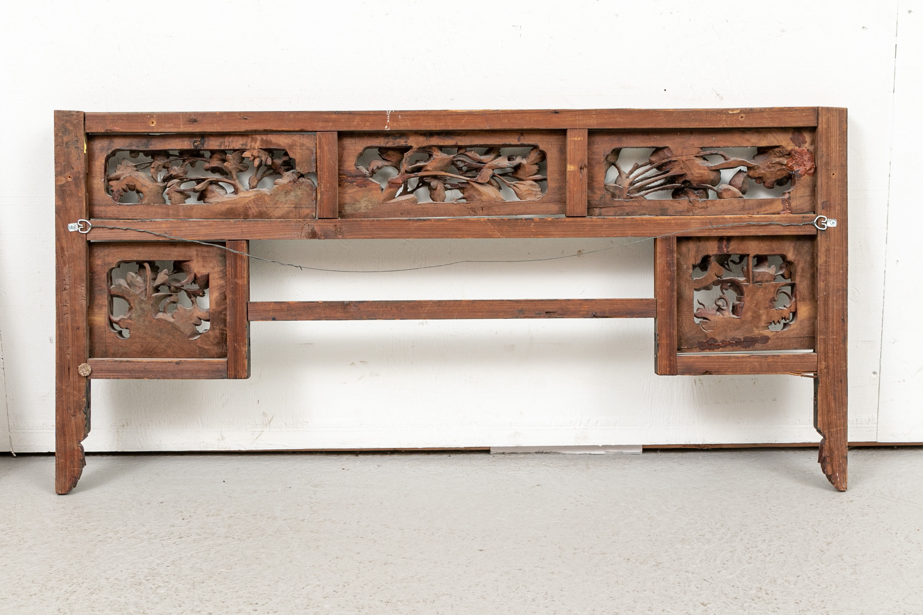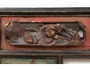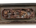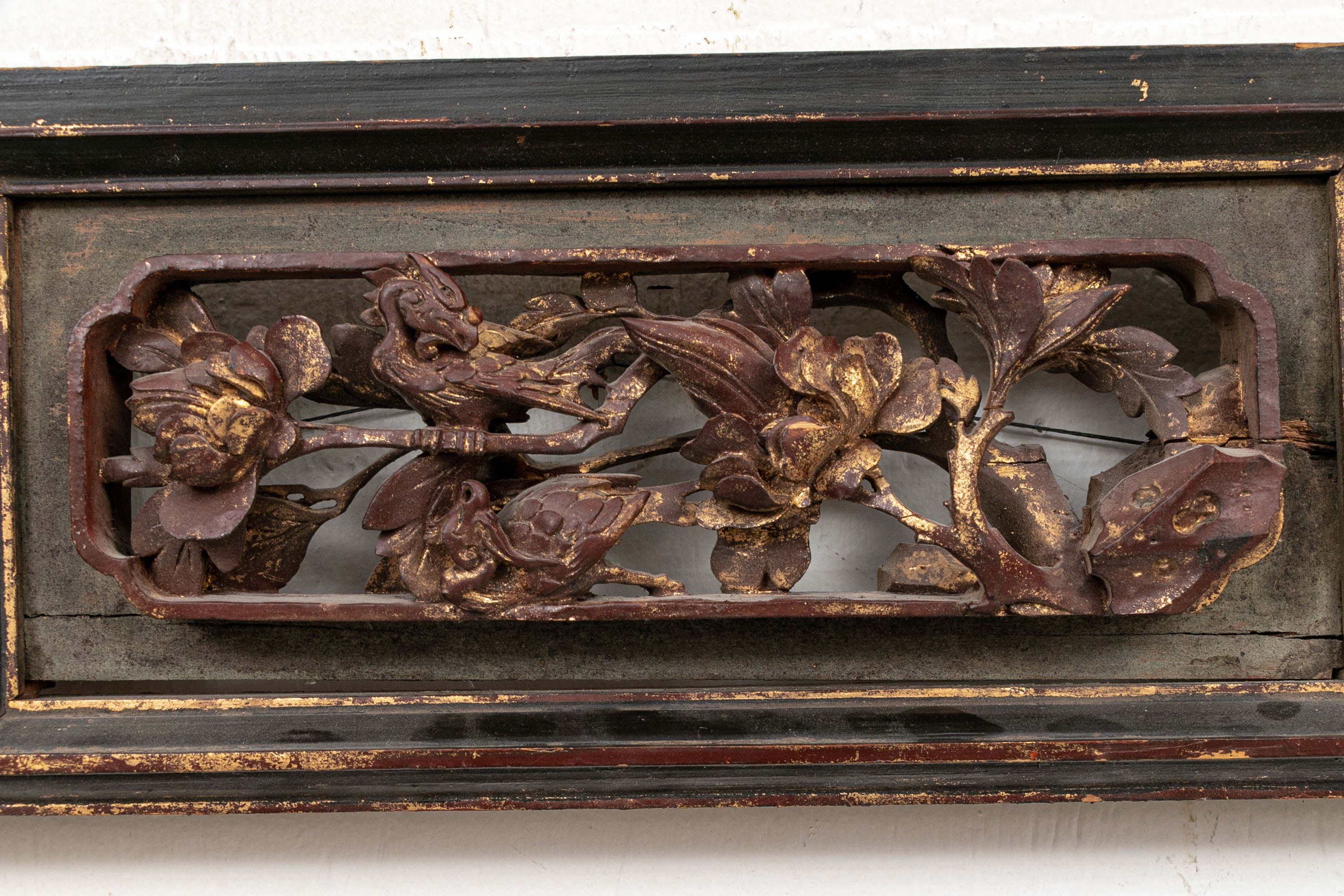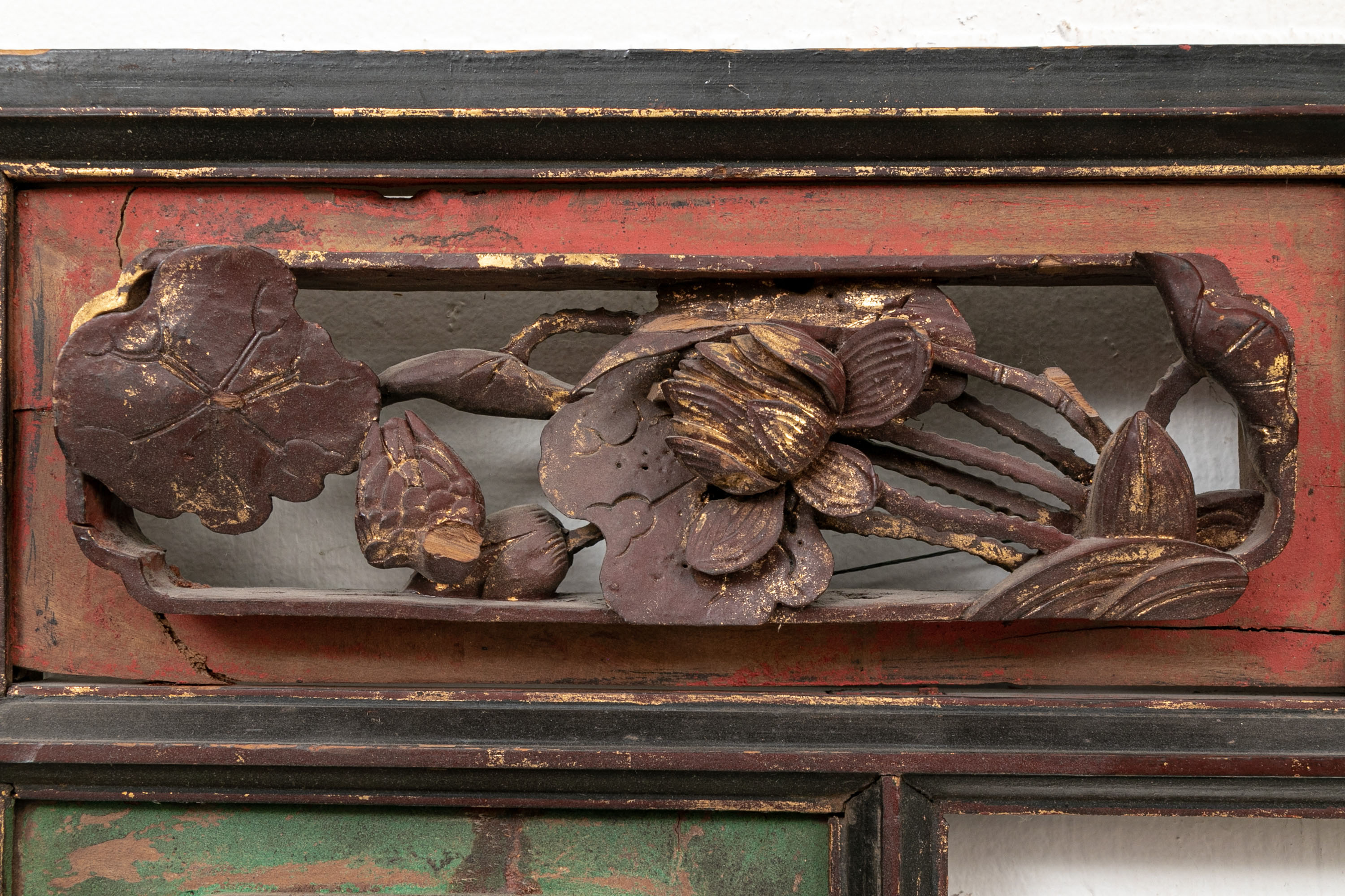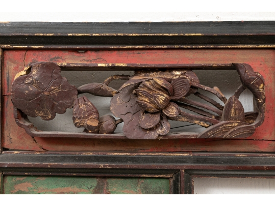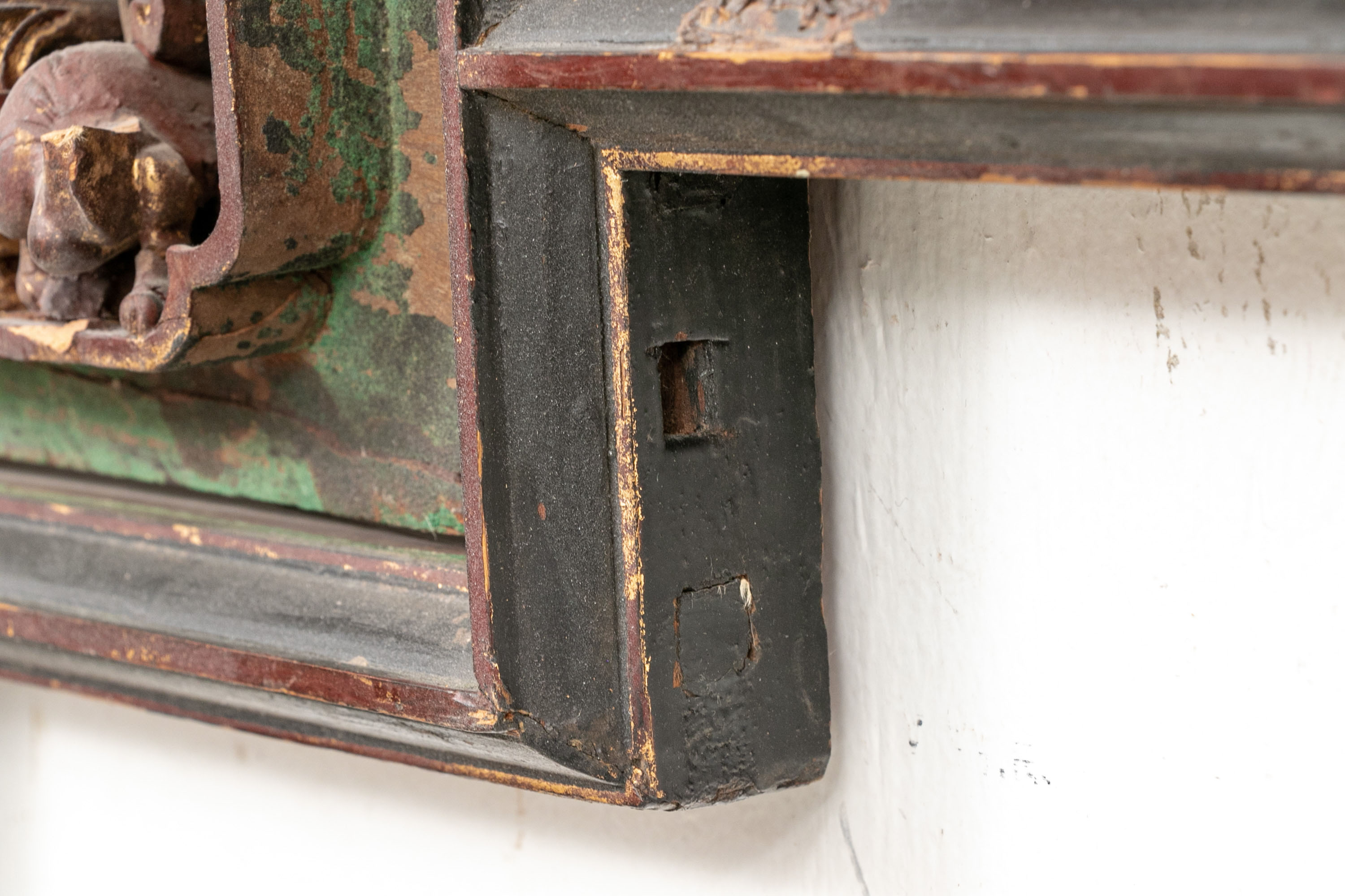 A rectangular stepped piece with high relief carved, gilt and painted shaped panels. With flowers on the top panels with birds and a phoenix on red and green backgrounds. The lower square shaped panels with opposing vases with flowers and monster figures below (the right one with loss to the head) on green backgrounds. The green painted frame with a stretcher and artichoke terminals on the sides. Unpainted back.