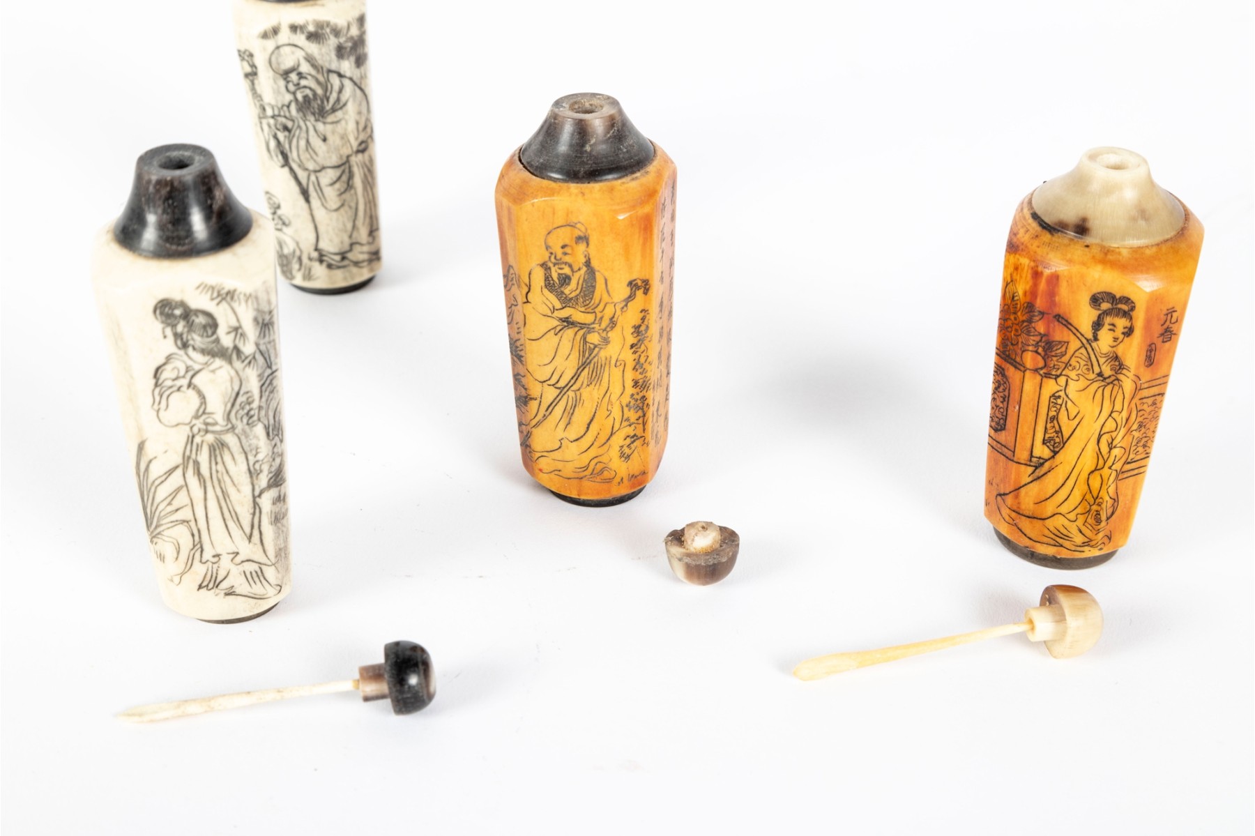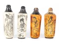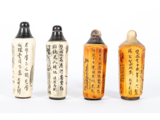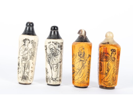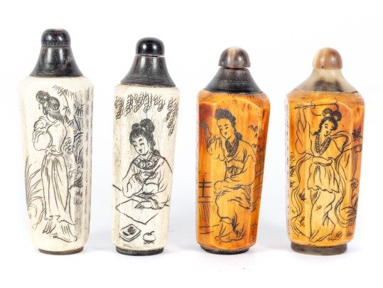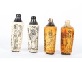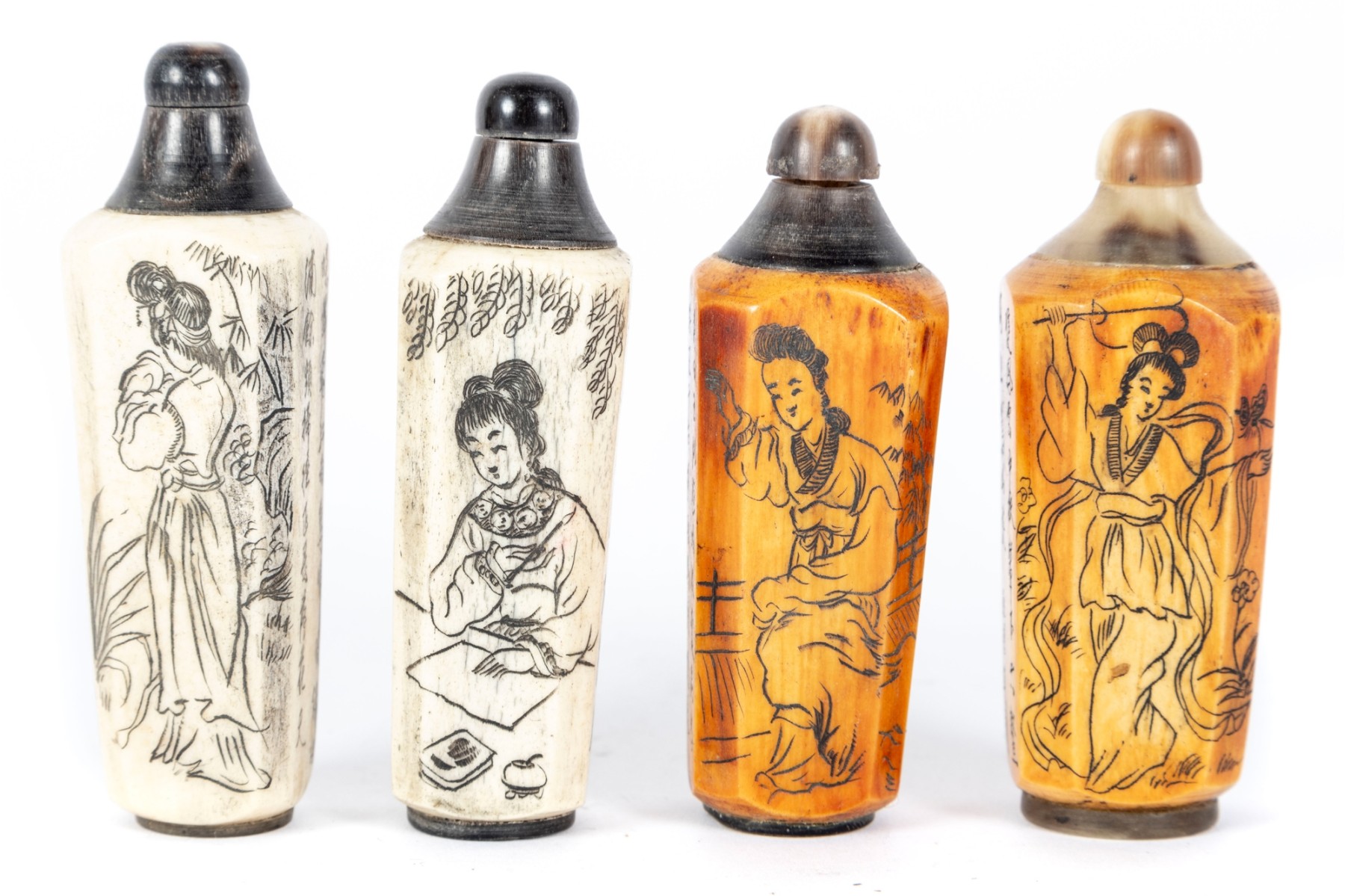This set of four antique (Circa 1900 - 1940's) Chinese snuff bottles features hand-carved and inked depictions of elegant women in traditional attire, each engaged in various activities. The bottles display rich patina variations, with two in a creamy ivory tone and two in a warm stained amber hue. All examples are topped with horn stoppers.