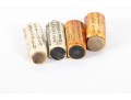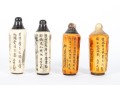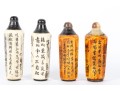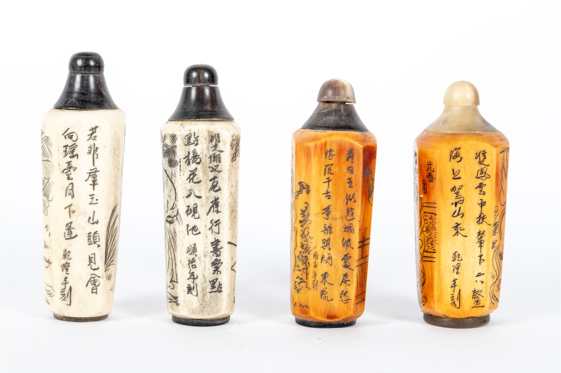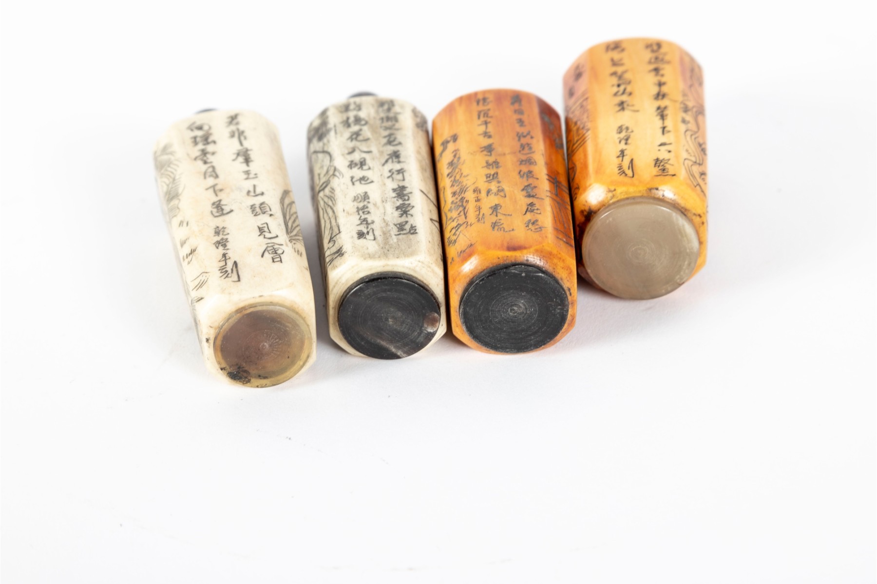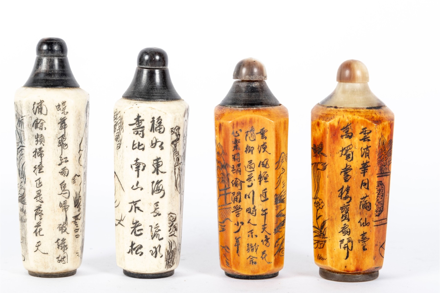 This set of four antique (Circa 1900 - 1940's) Chinese snuff bottles features hand-carved and inked depictions of elegant women in traditional attire, each engaged in various activities. The bottles display rich patina variations, with two in a creamy ivory tone and two in a warm stained amber hue. All examples are topped with horn stoppers.