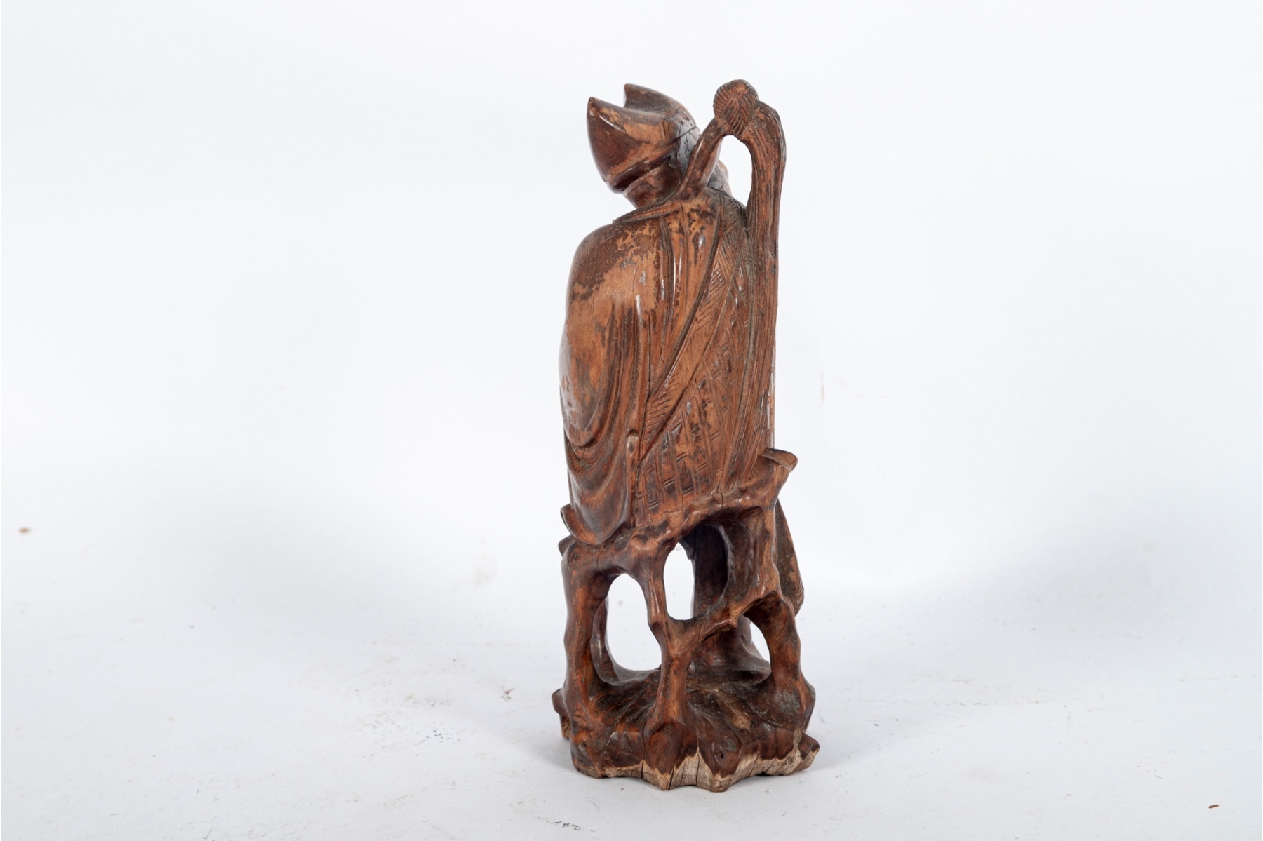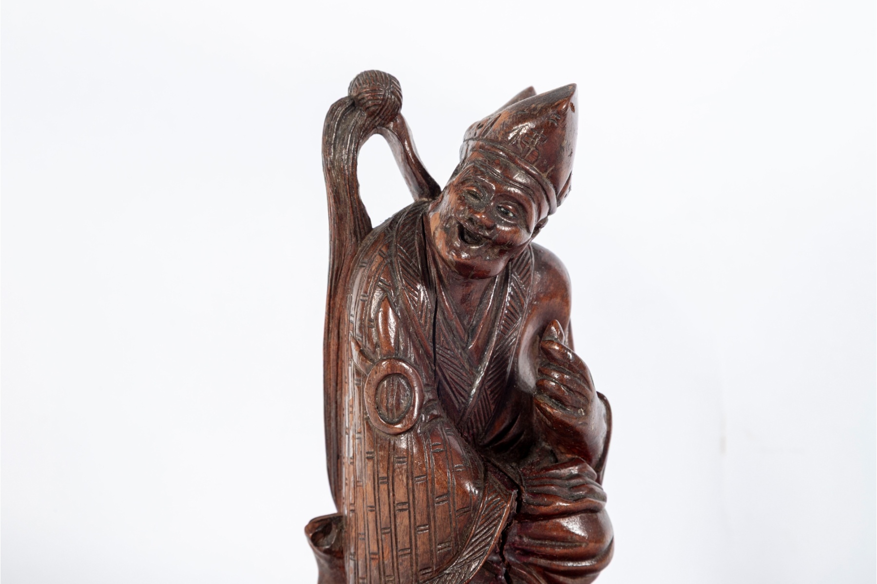 Finely hand-carved Chinese hardwood figure depicting a seated, robed scholar. Detailed with expressive facial features and flowing robes, showing rich patina and intricate carving throughout. Likely early to mid-20th century