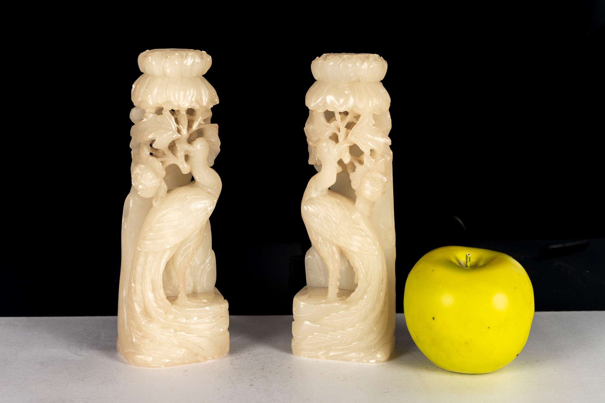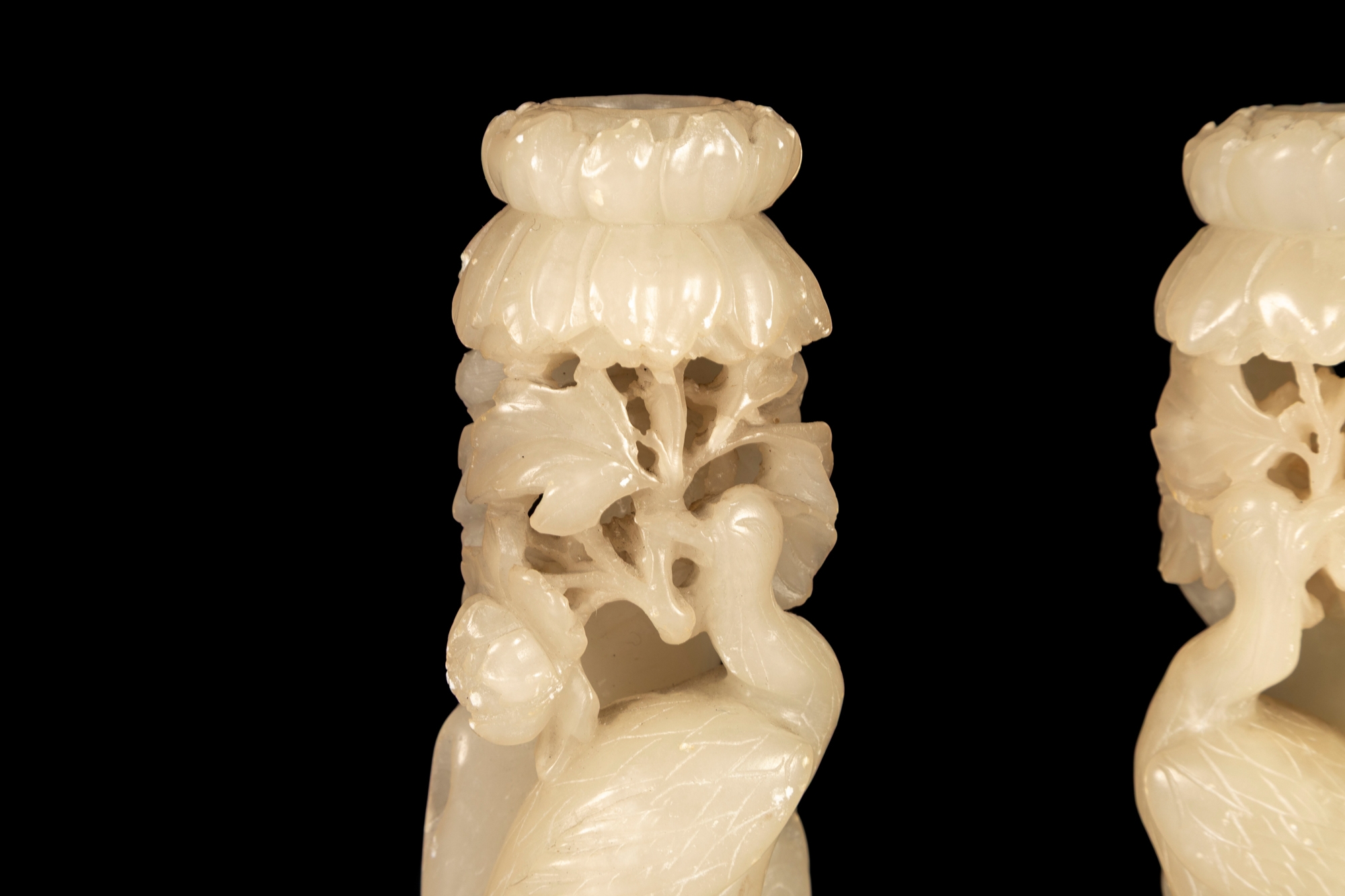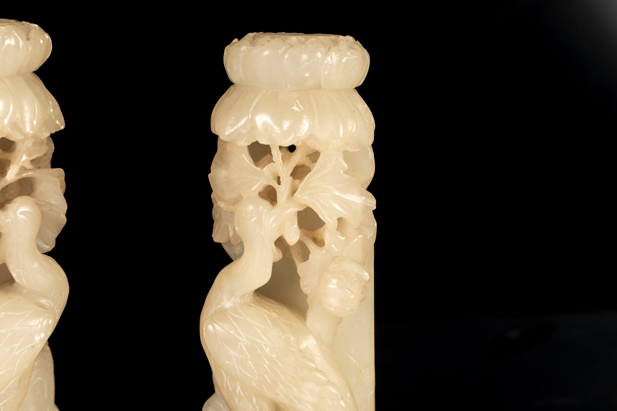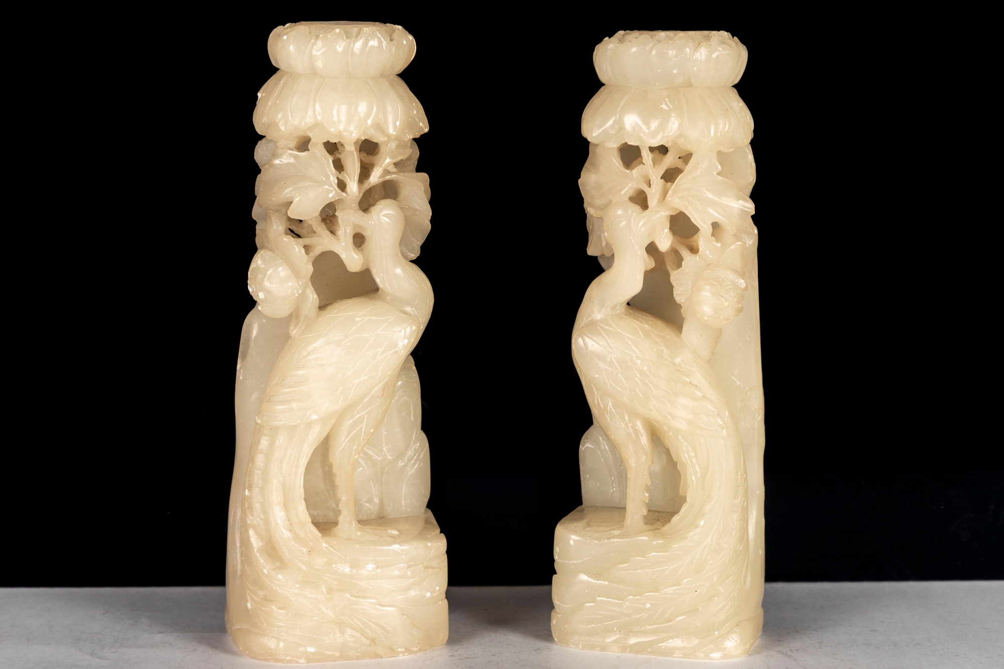 Elegant pair of antique Chinese candle holders finely carved from nephrite jade, each depicting a majestic peacock with detailed plumage.
