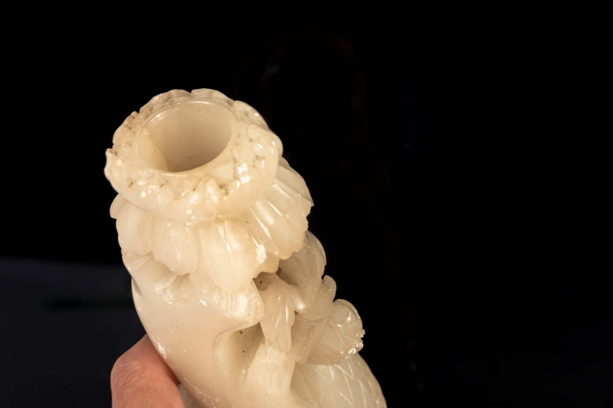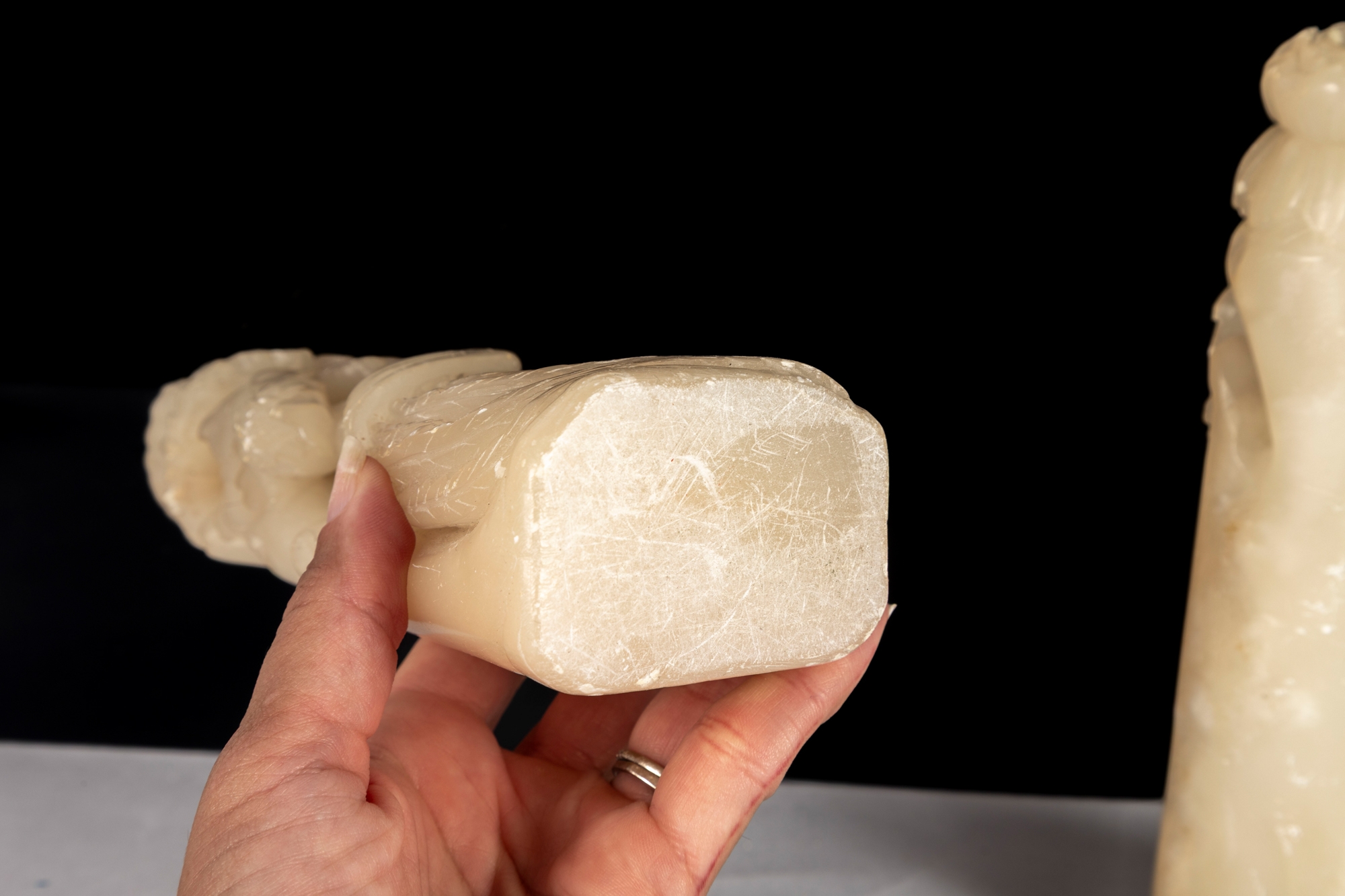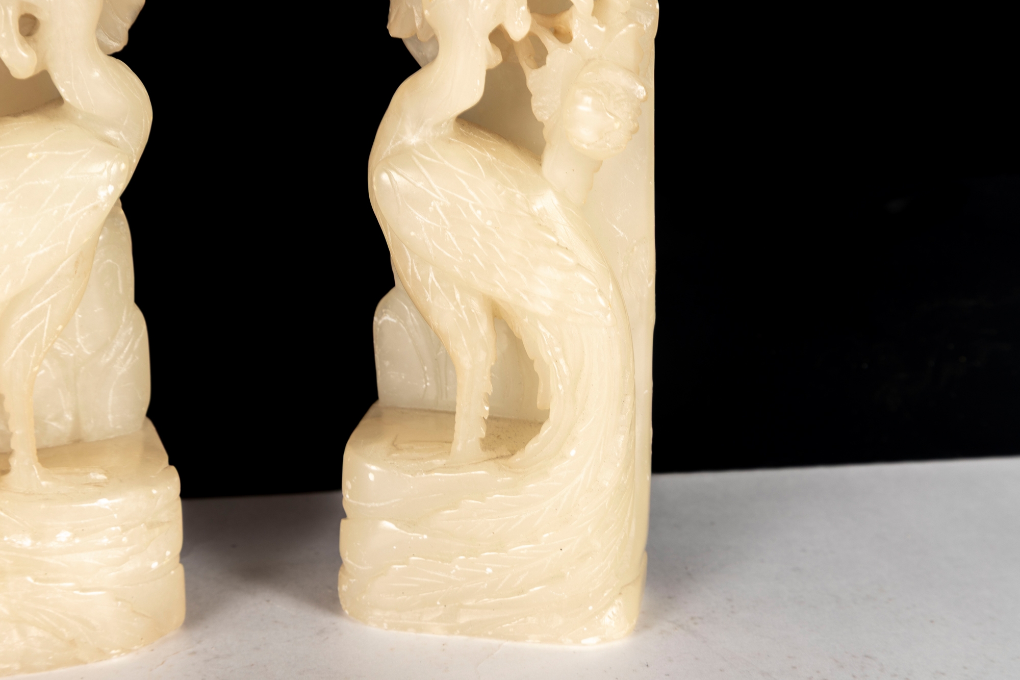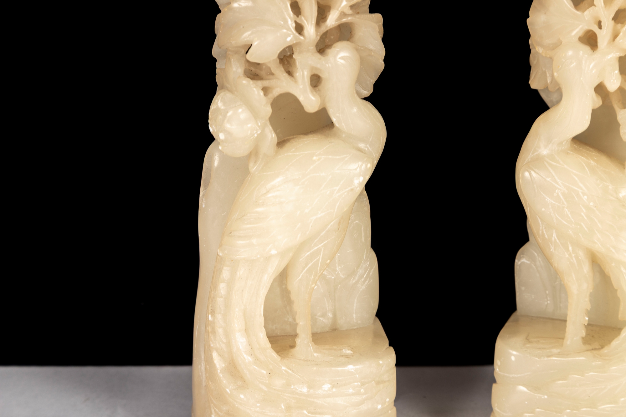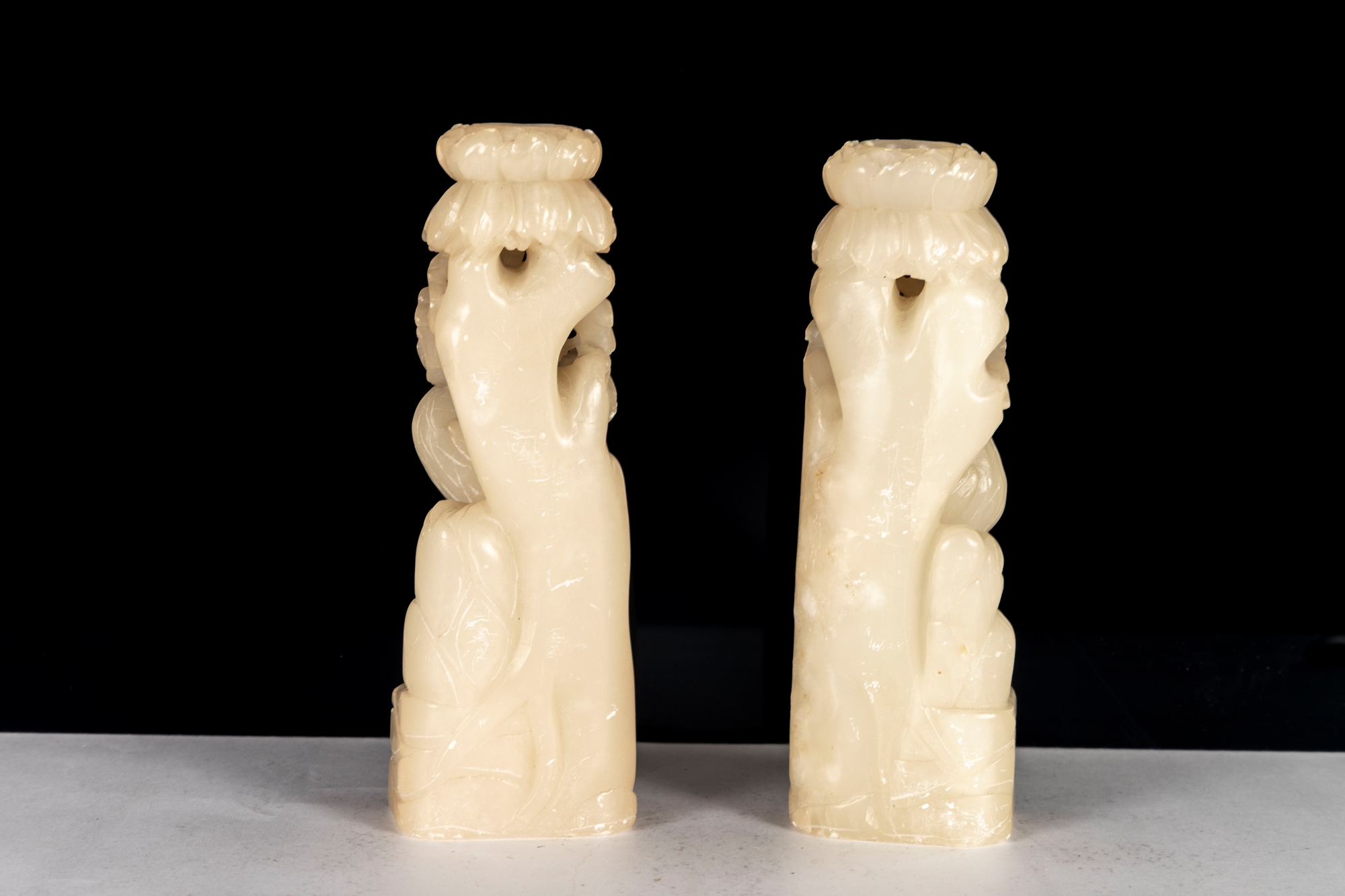 Elegant pair of antique Chinese candle holders finely carved from nephrite jade, each depicting a majestic peacock with detailed plumage.