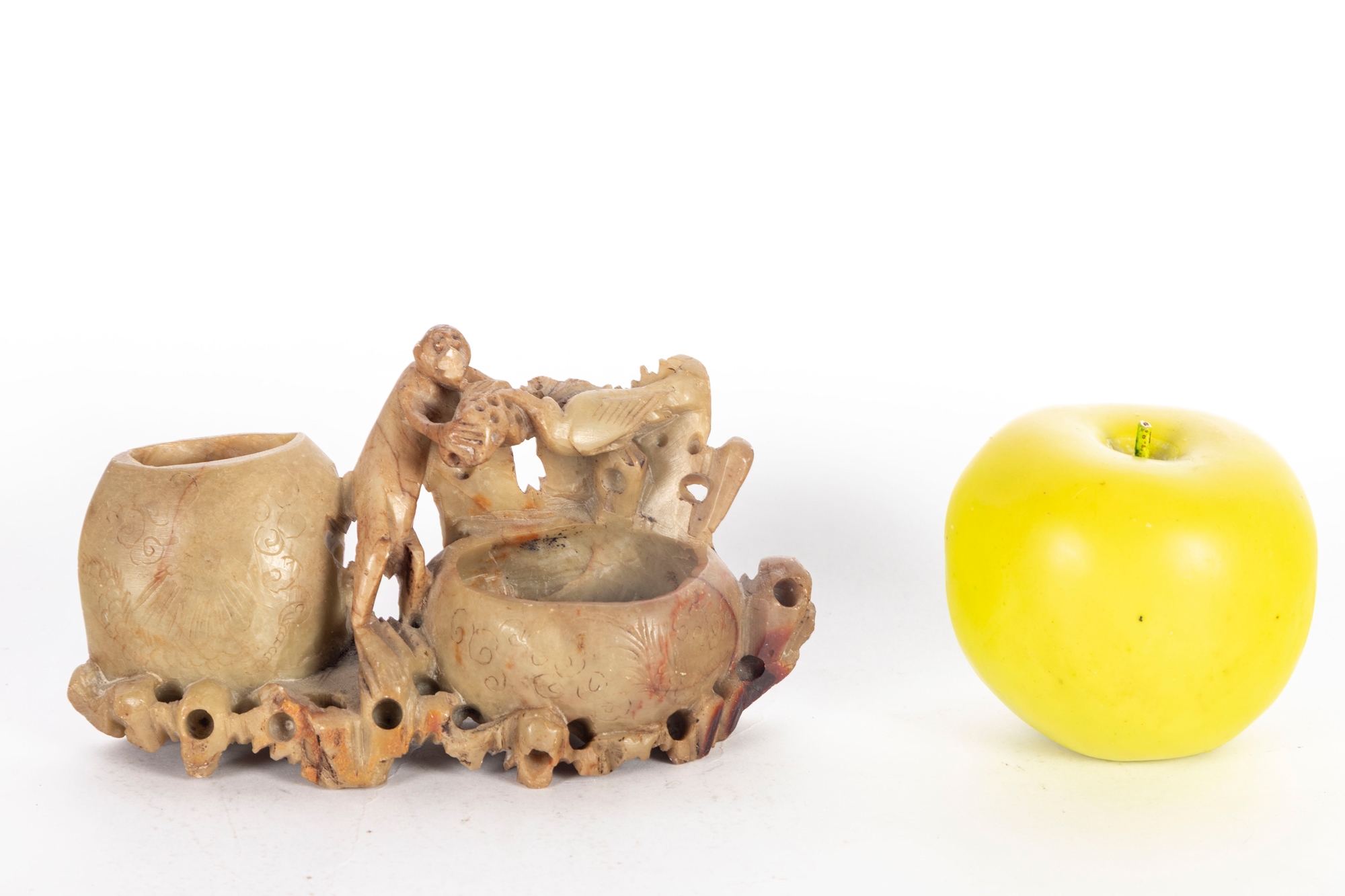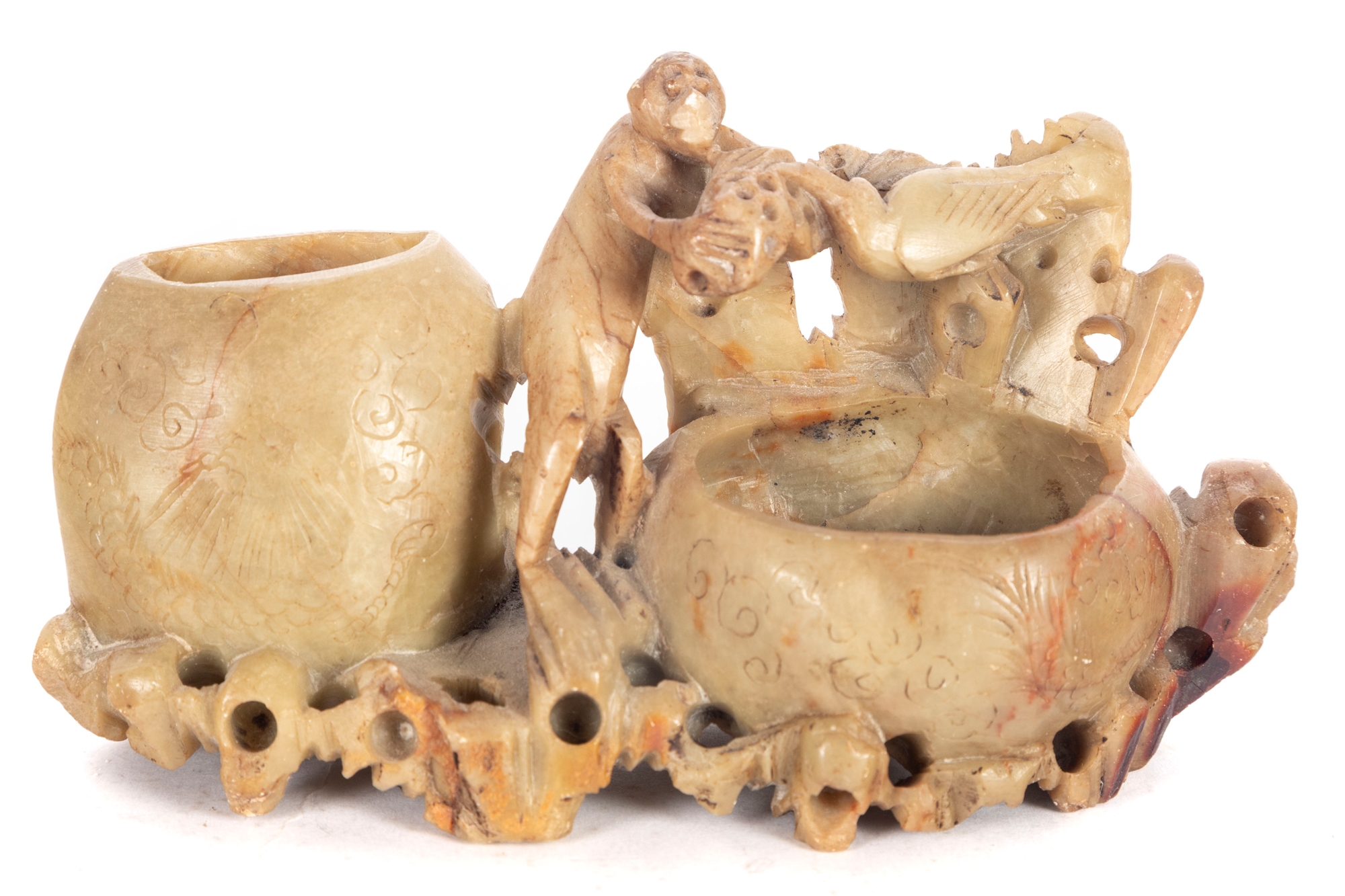 A carved soapstone display originating from China, displaying two large vessels with a monkey and bird sharing what appears to be a bundle of grapes.