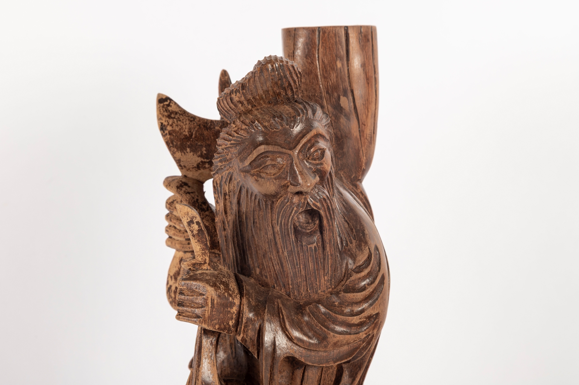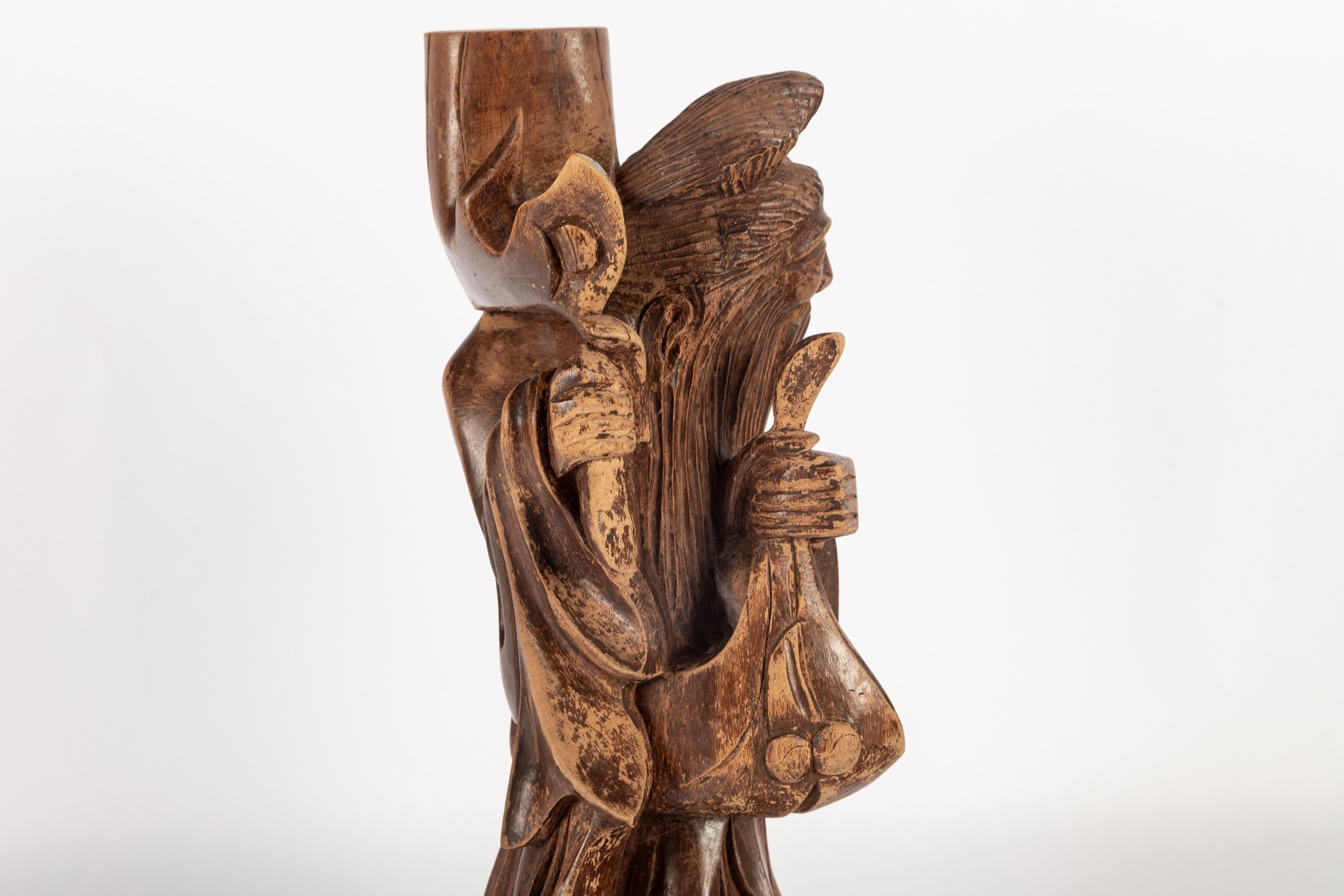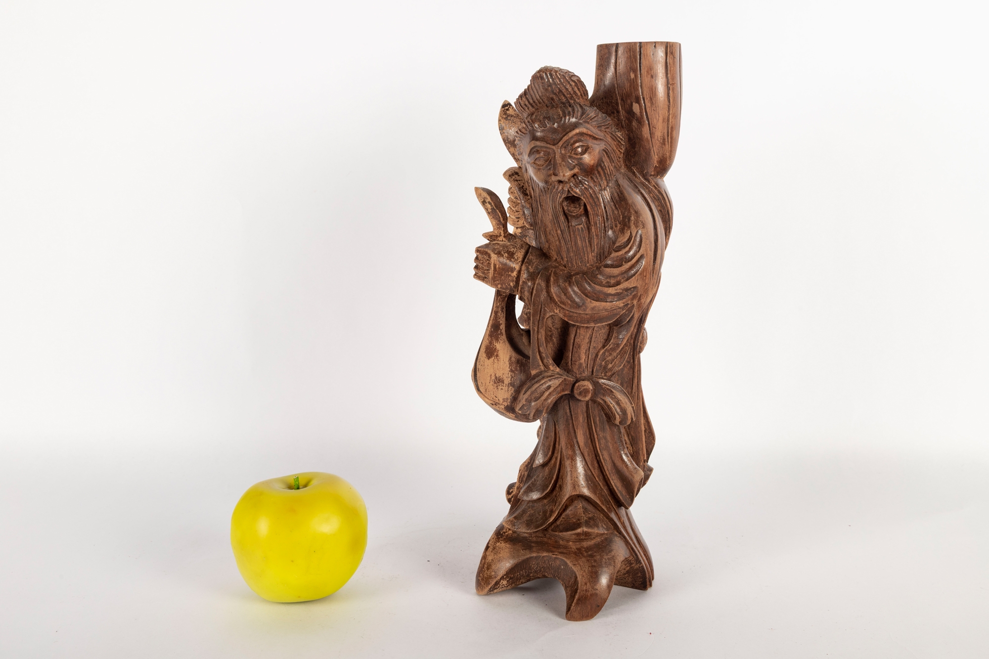 Antique hand-carved Chinese wood figure depicting a bearded scholar or immortal in expressive motion, finely detailed with flowing robes and dynamic gesture.