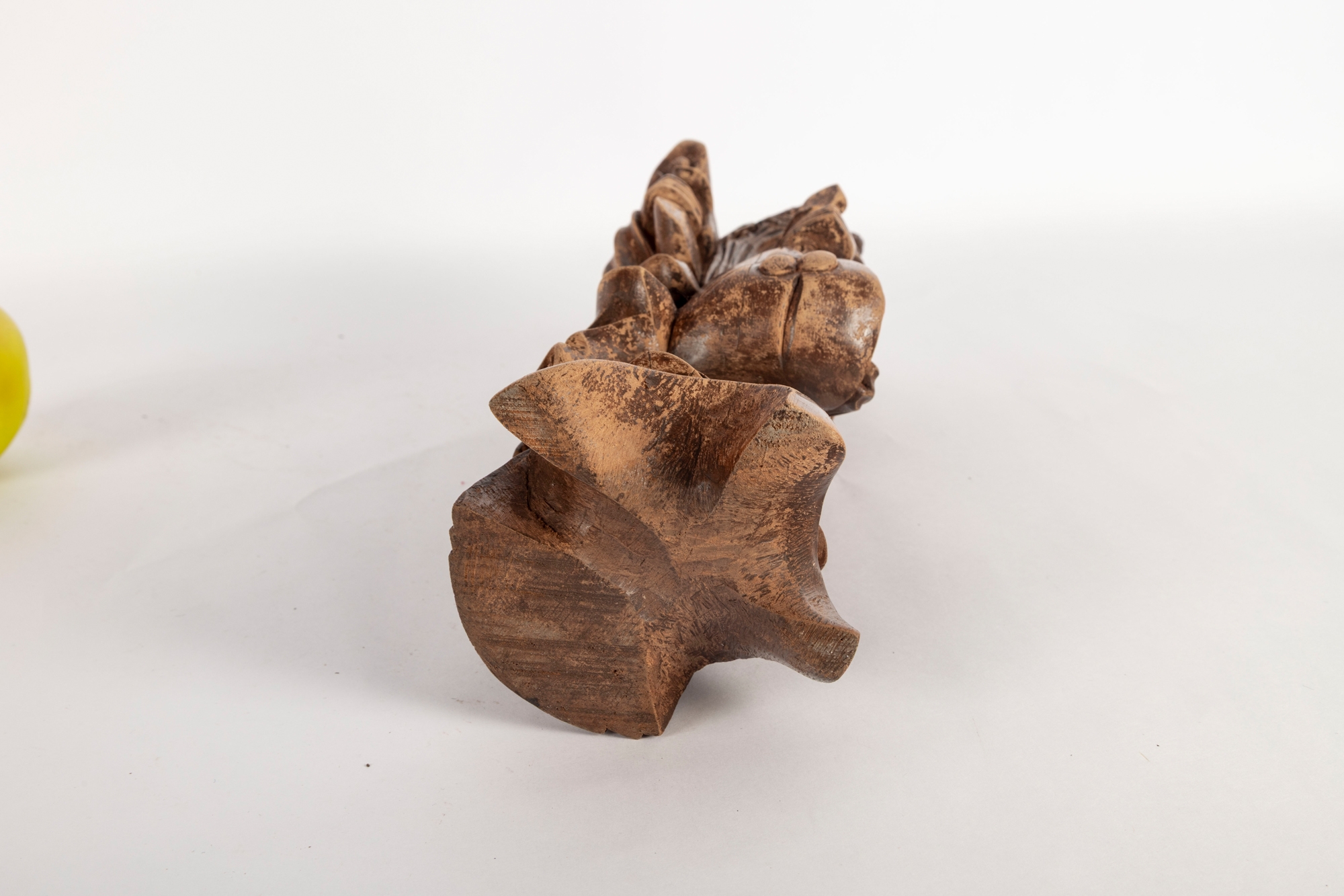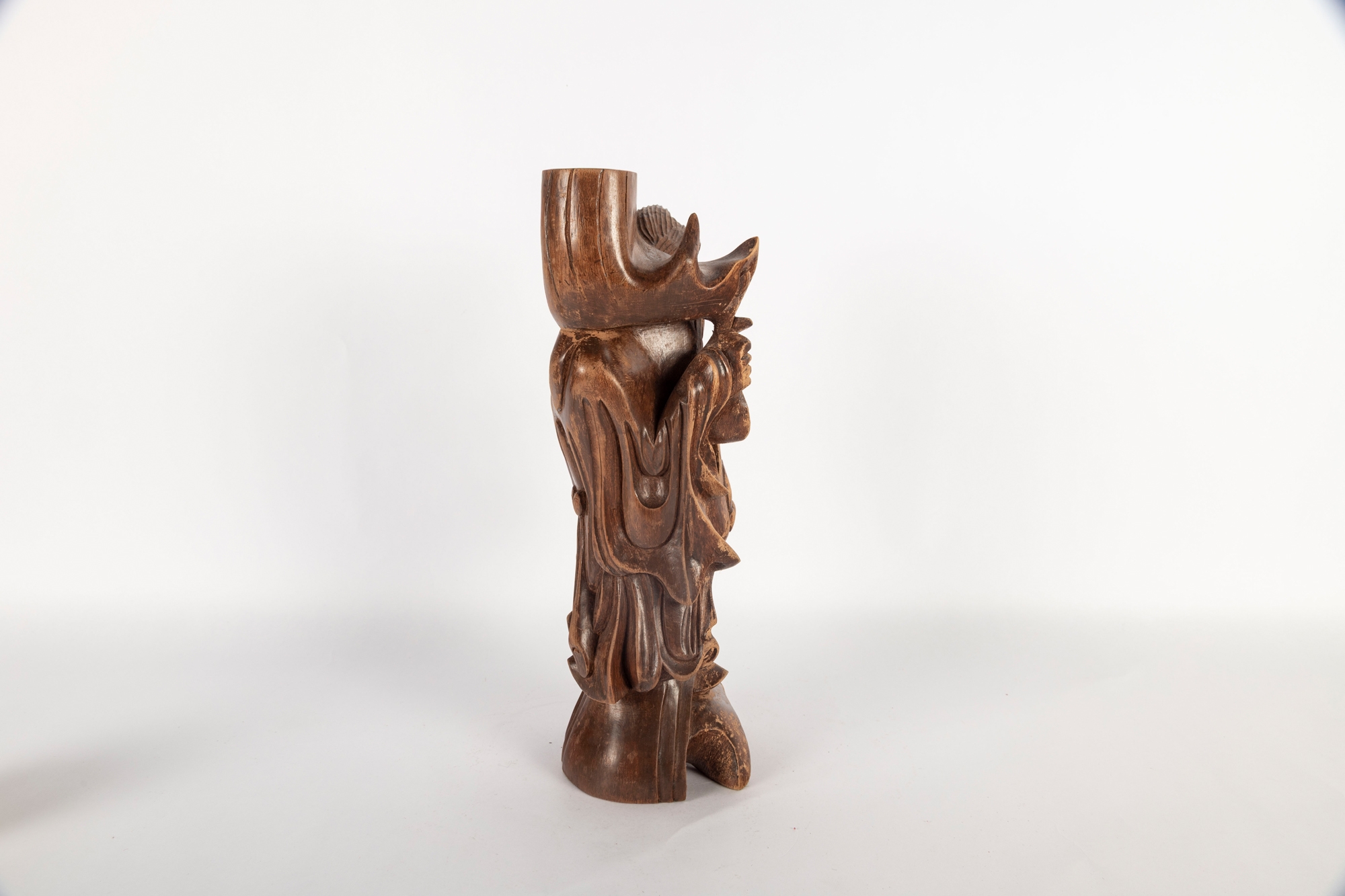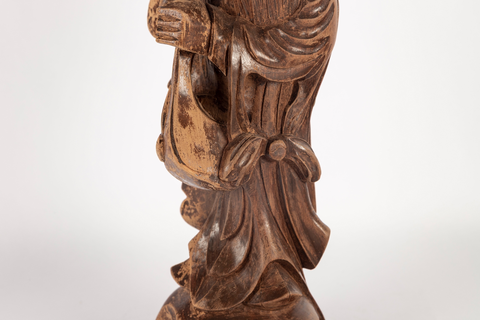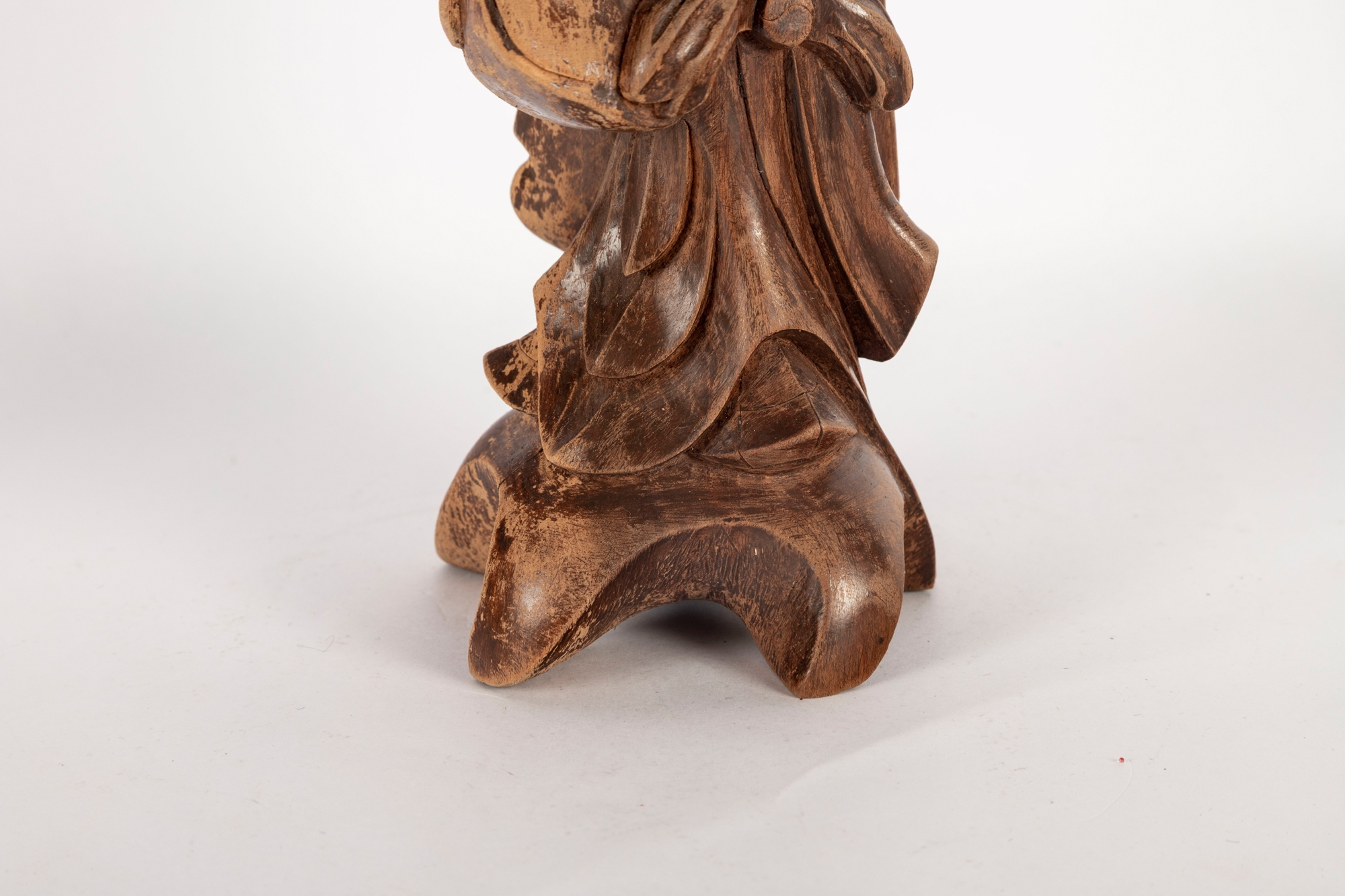 Antique hand-carved Chinese wood figure depicting a bearded scholar or immortal in expressive motion, finely detailed with flowing robes and dynamic gesture.