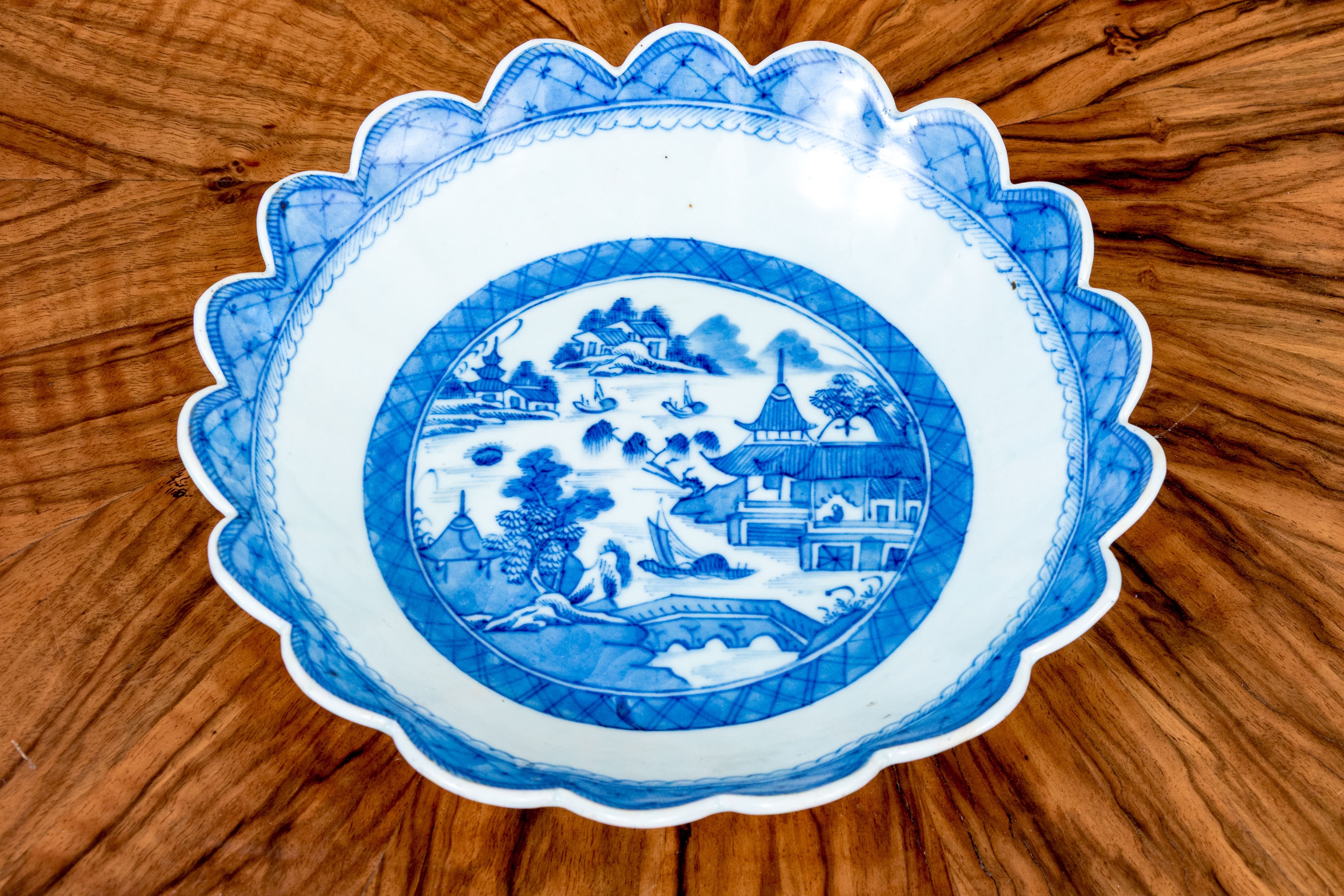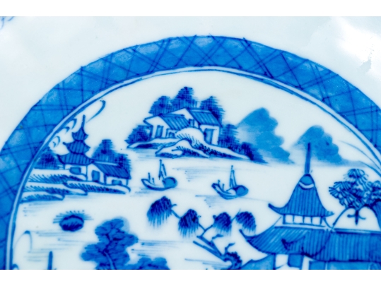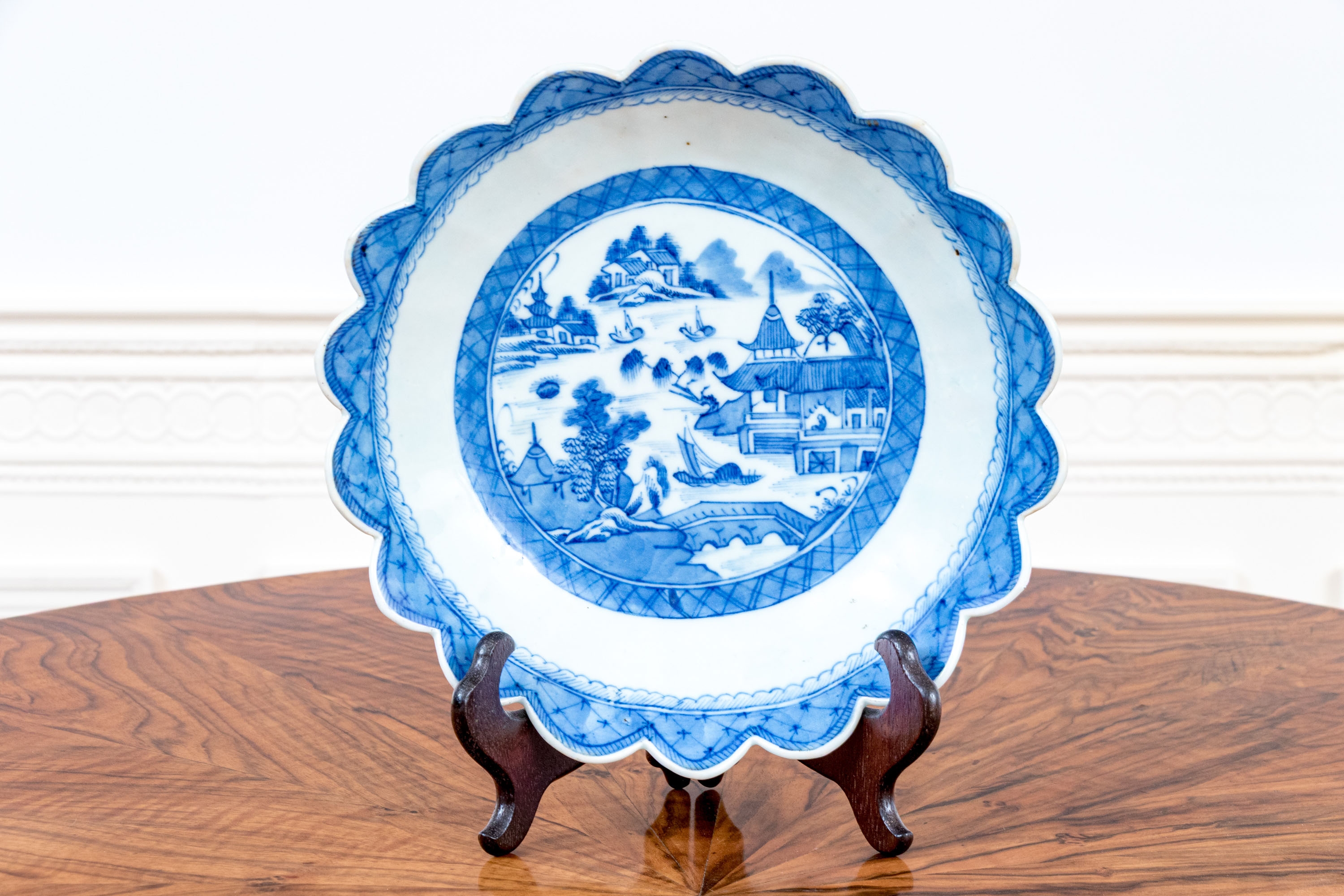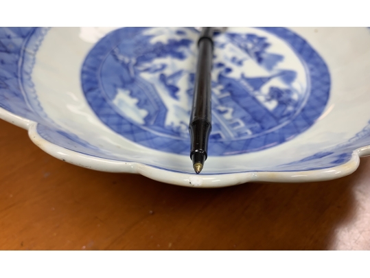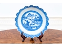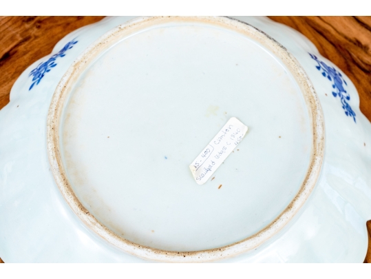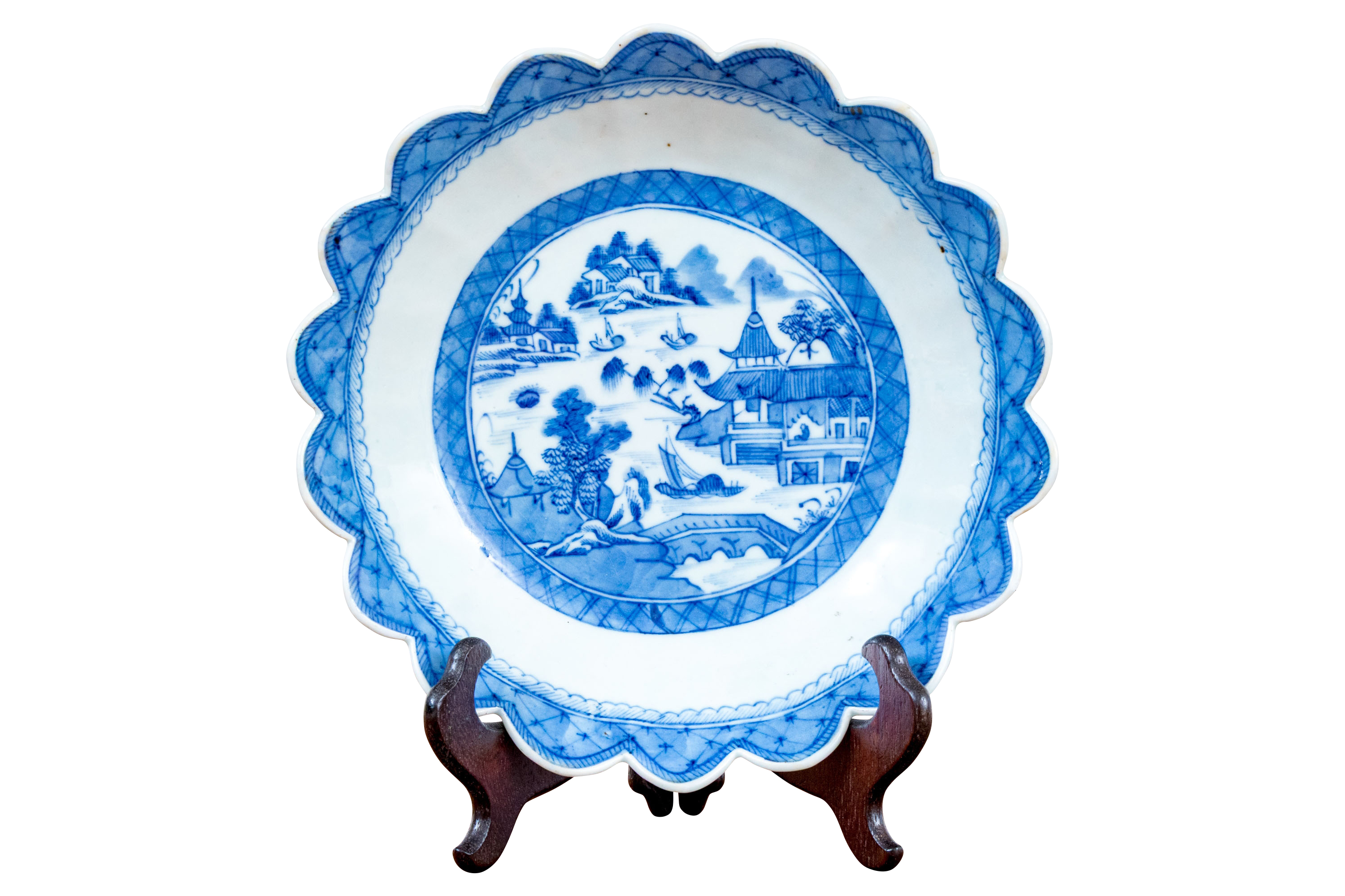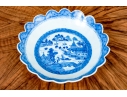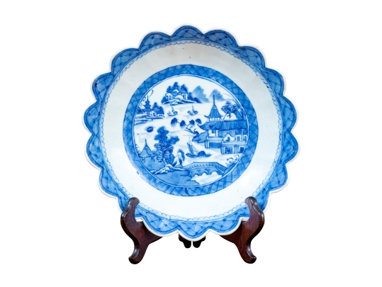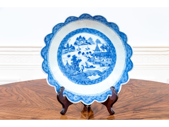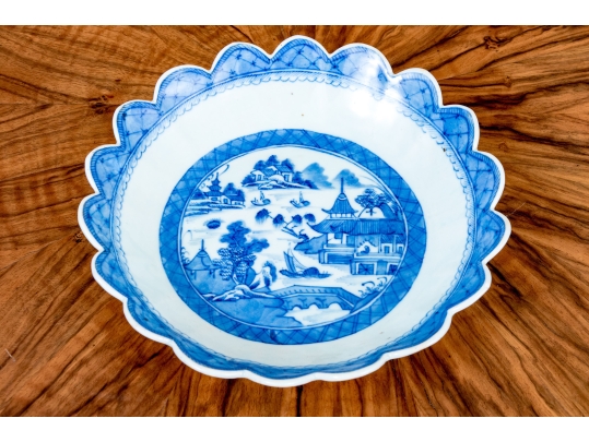 An antique blue and white Chinese Export Canton scalloped bowl with circular foot with foliate form central Canton River landscape scene. The exterior with floral motifs. Circa 1840. Stand is for display only and not included.