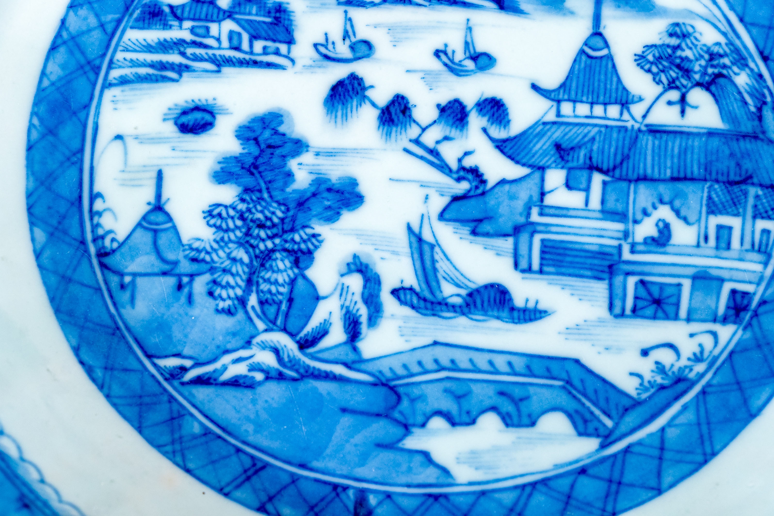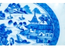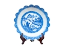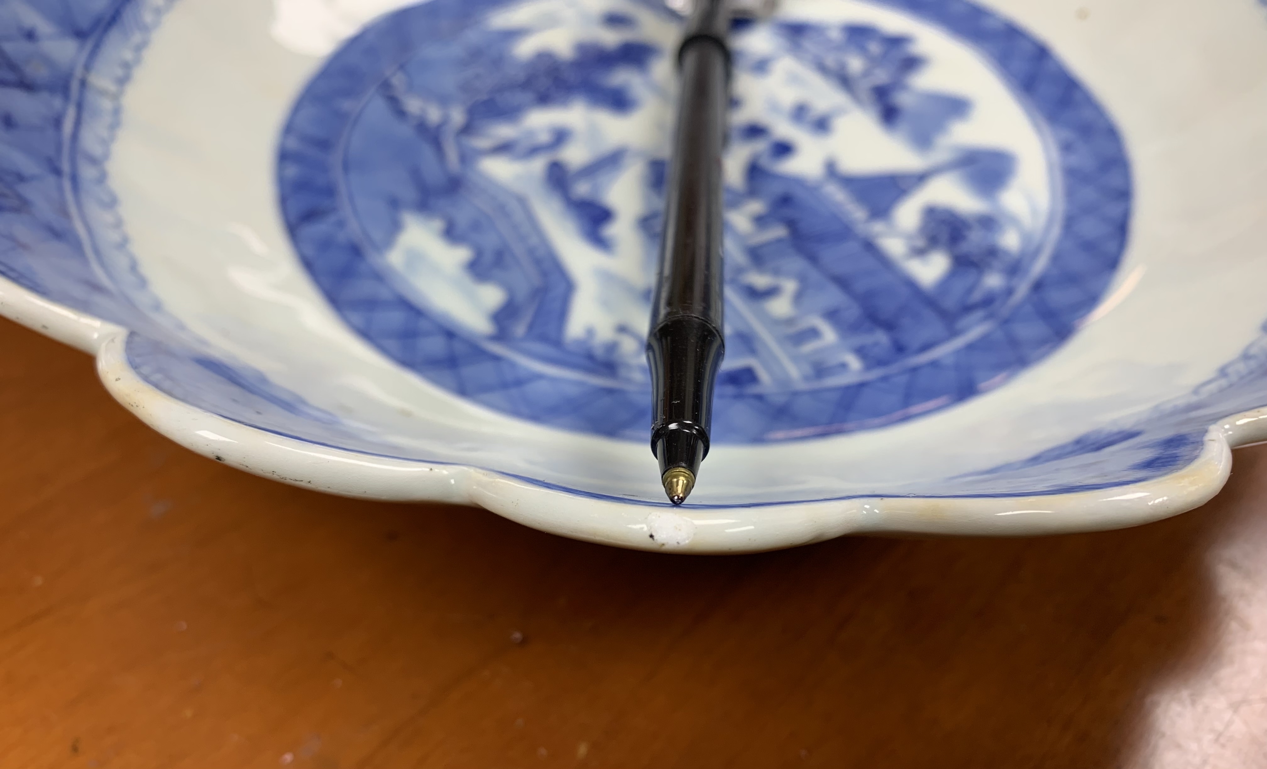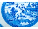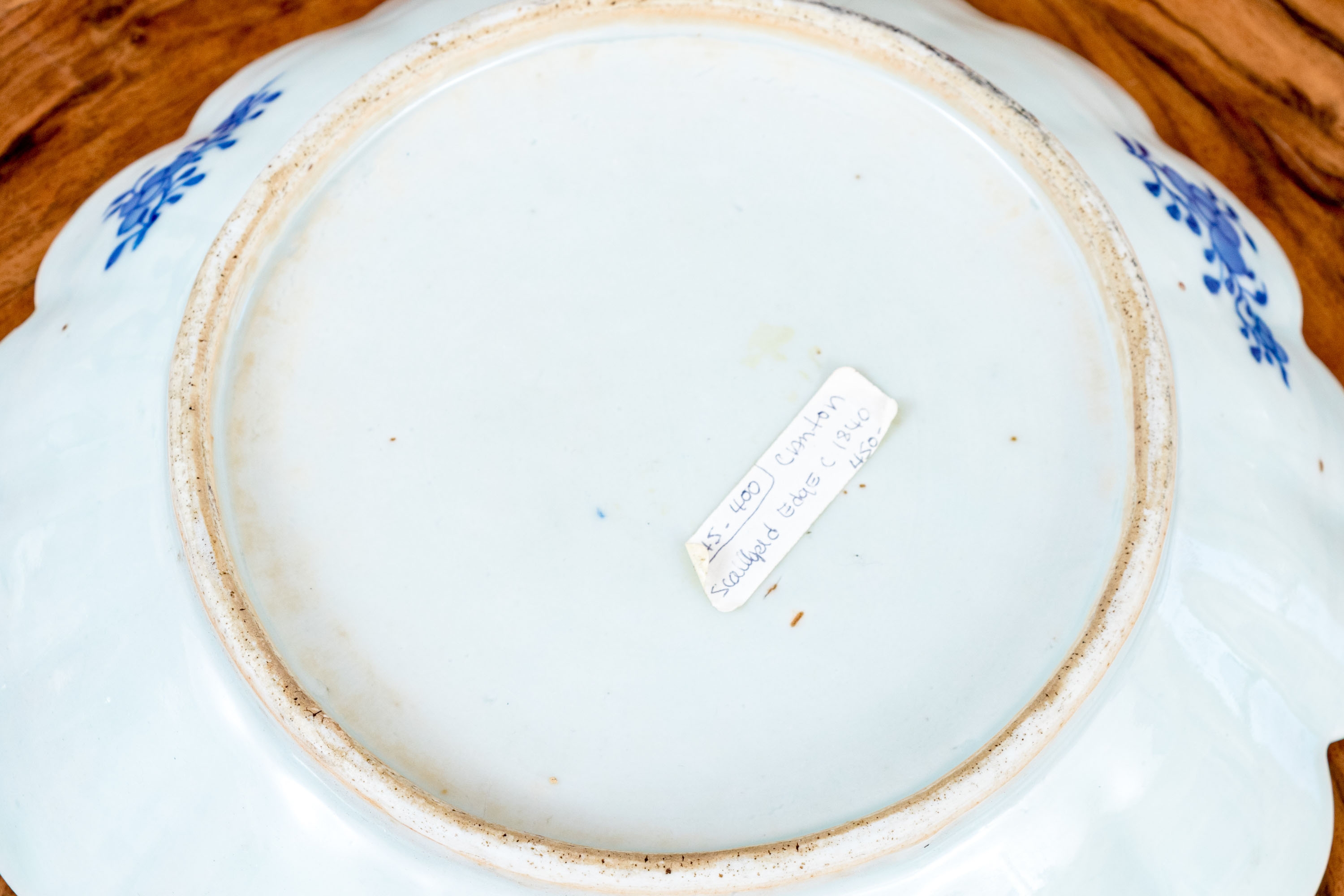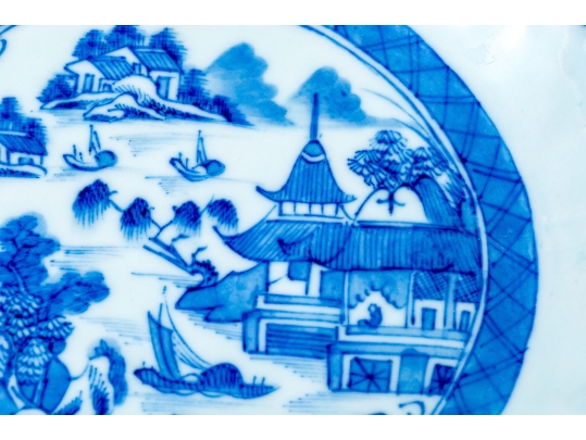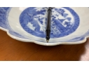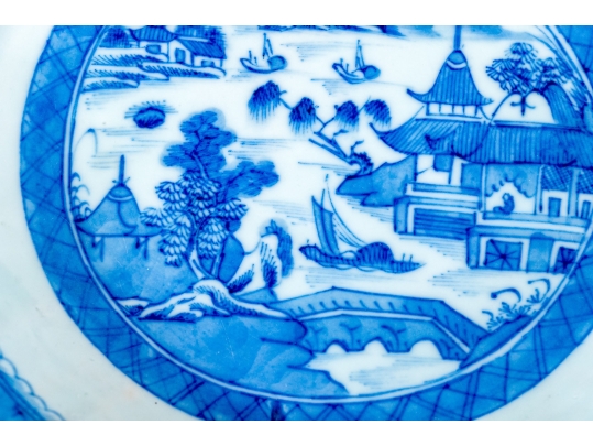 An antique blue and white Chinese Export Canton scalloped bowl with circular foot with foliate form central Canton River landscape scene. The exterior with floral motifs. Circa 1840. Stand is for display only and not included.