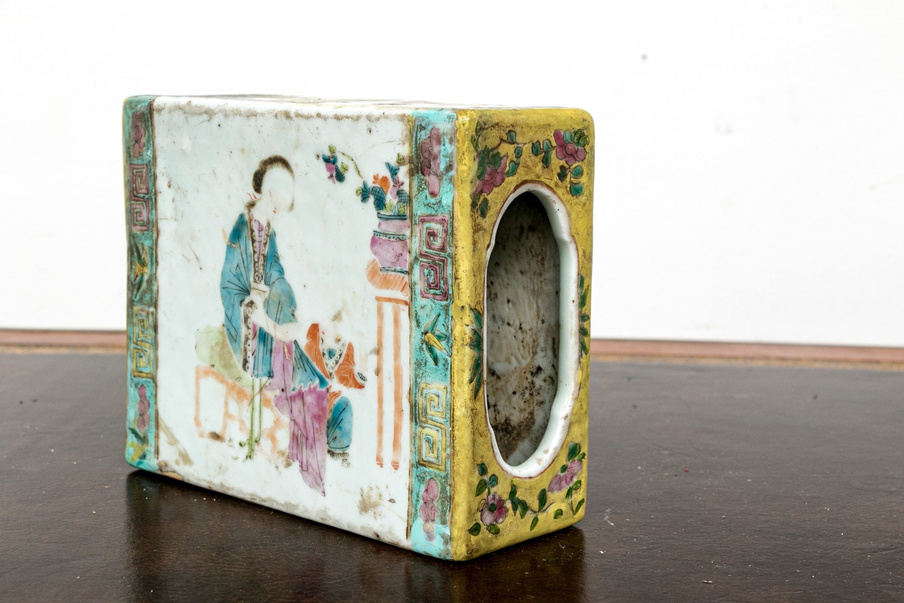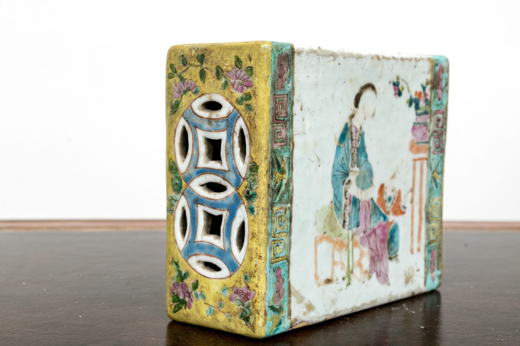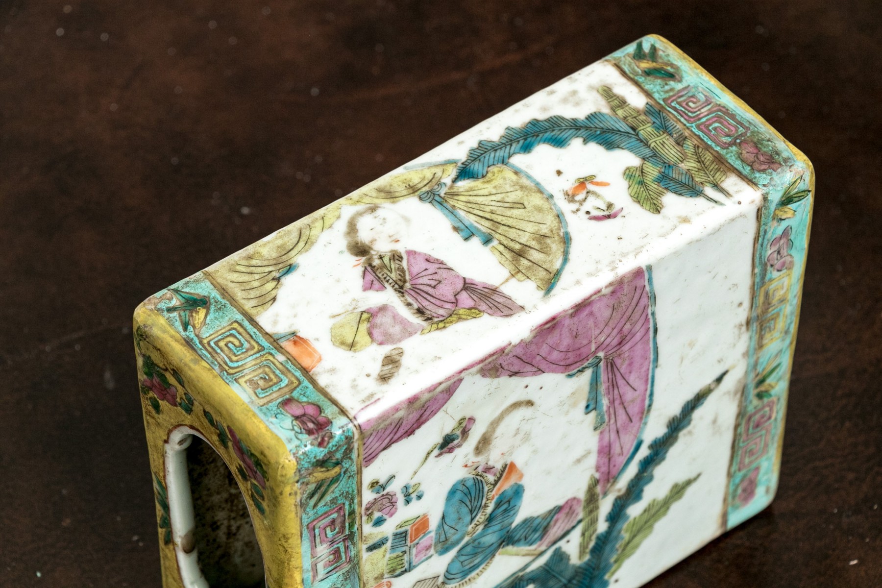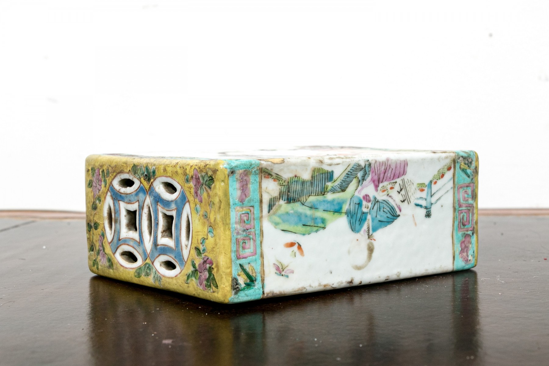 An antique Chinese famille rose enameled porcelain rectangular pillow.