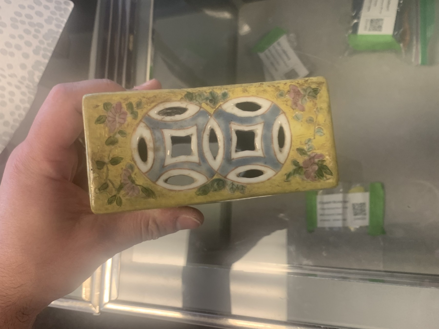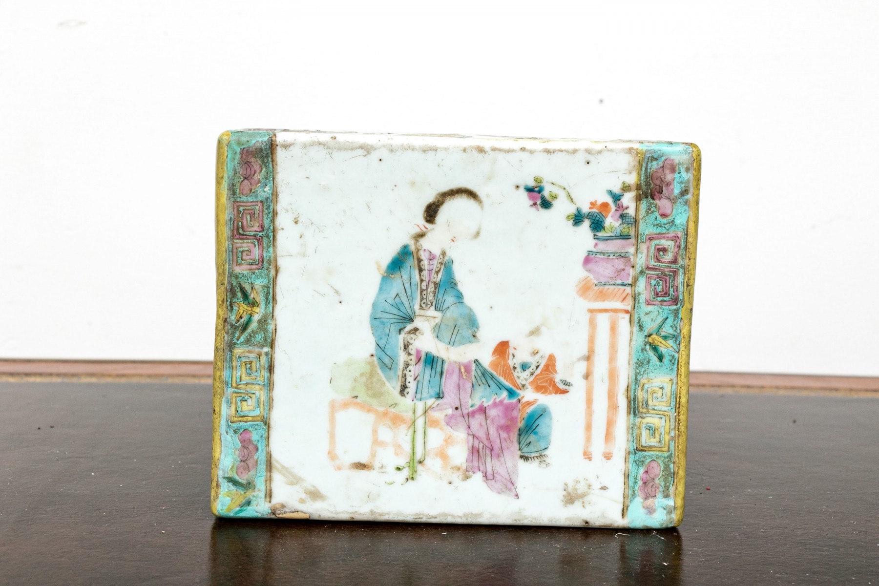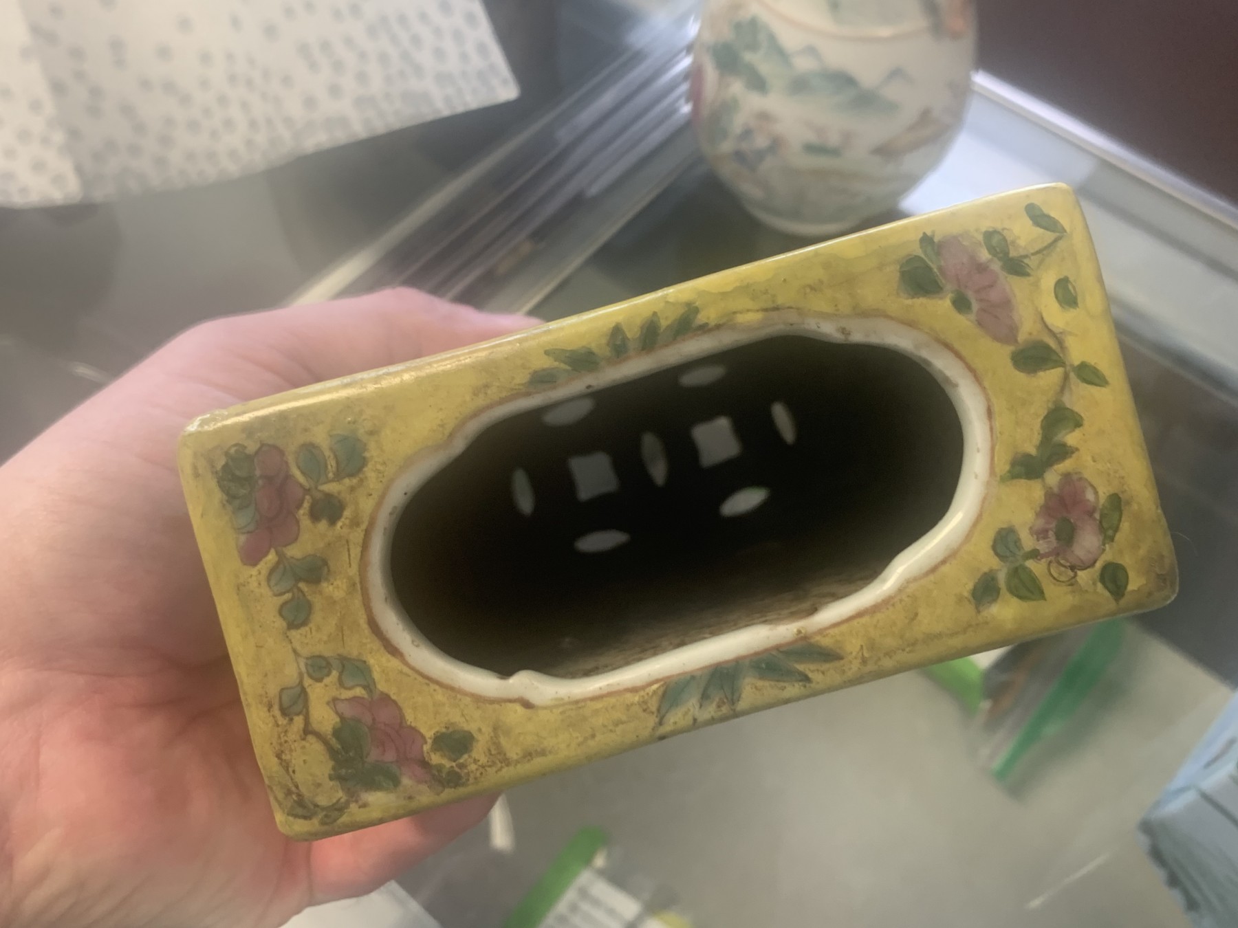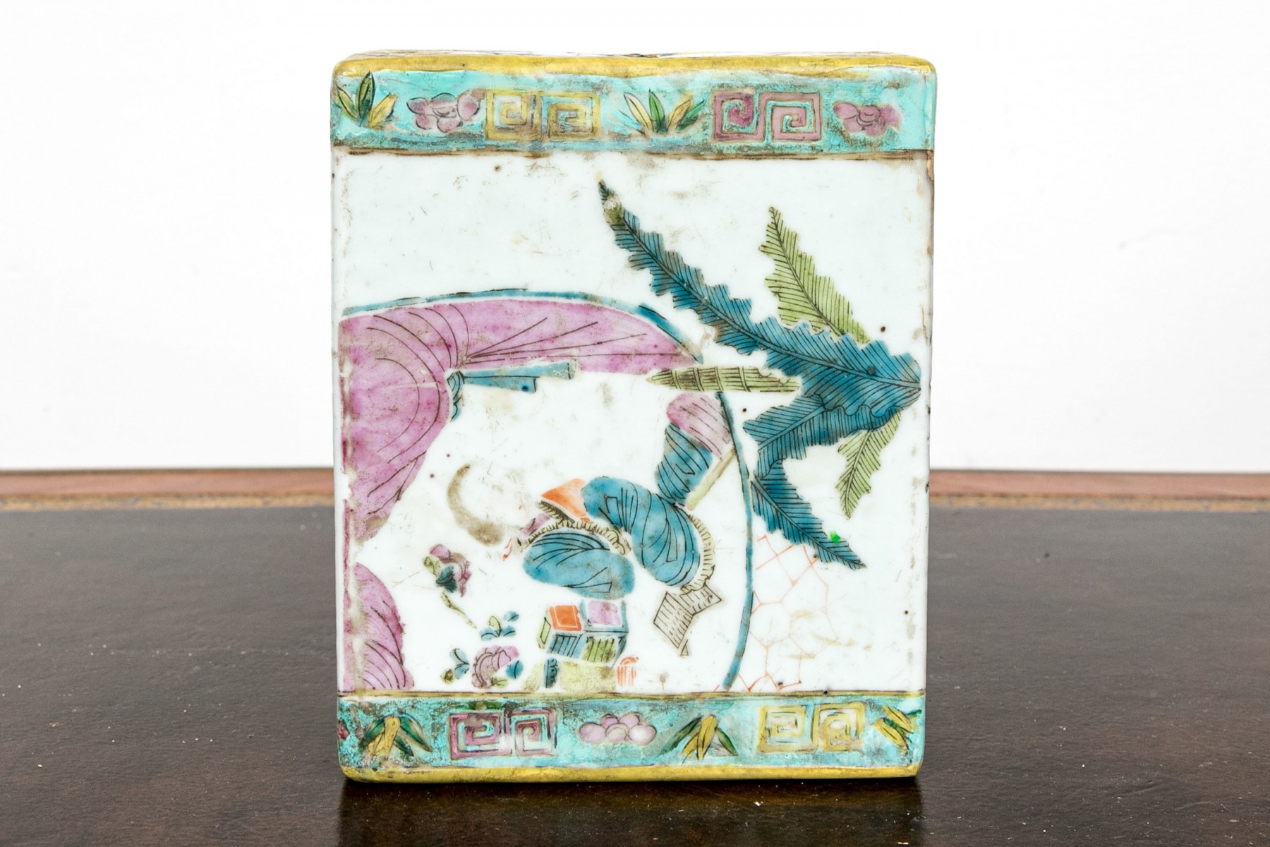 An antique Chinese famille rose enameled porcelain rectangular pillow.