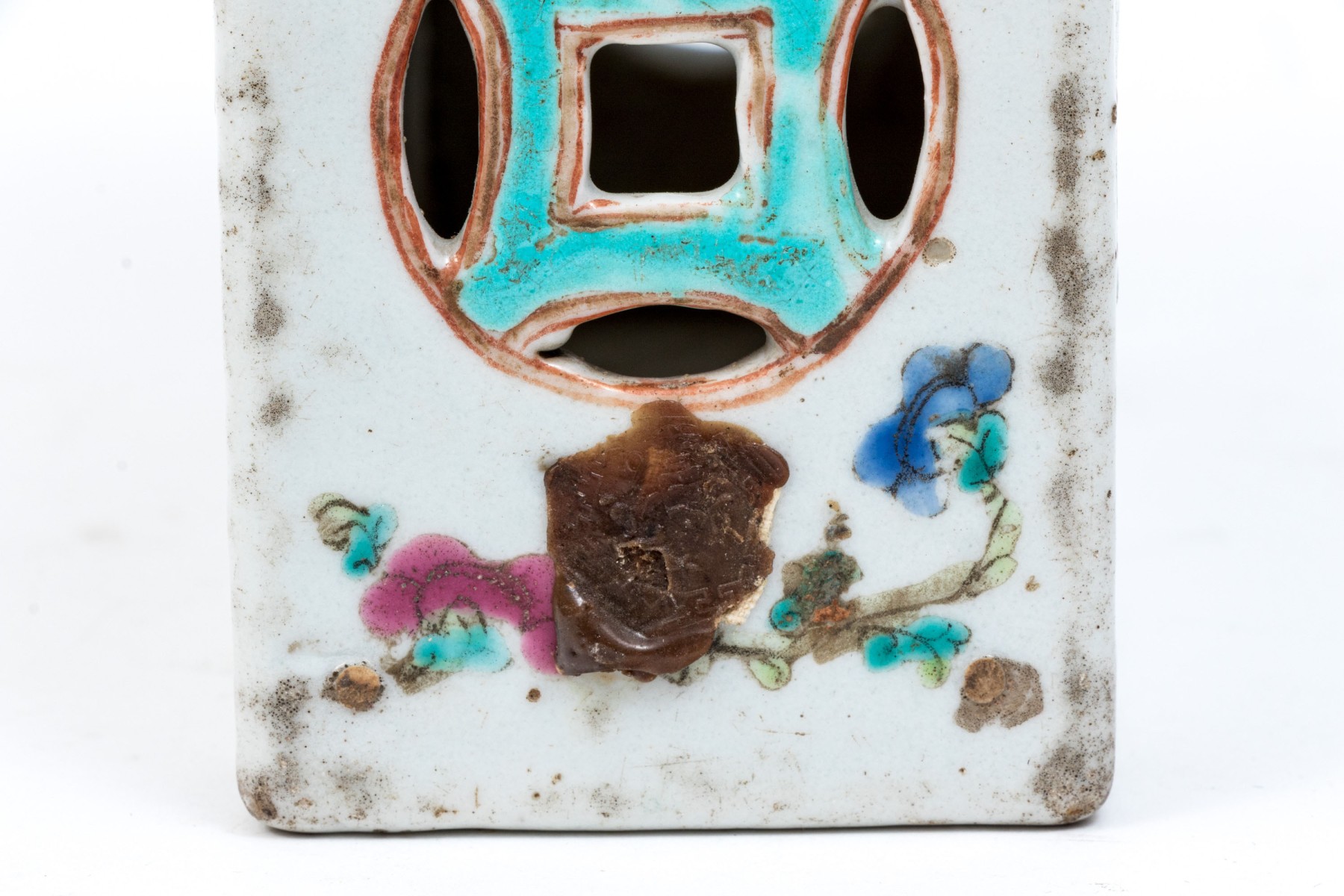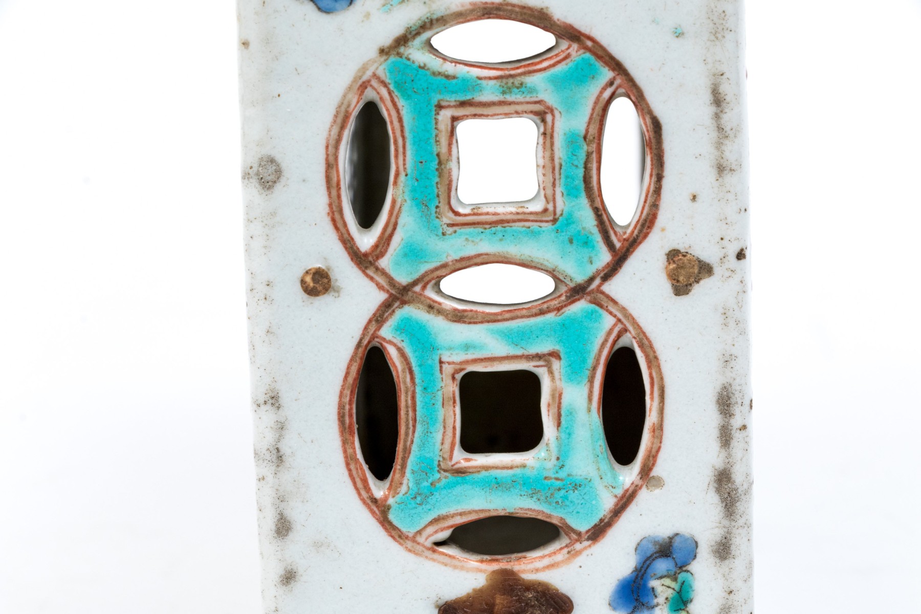 Pierced on either end. Decorated with with pierced and enameled cash coin form motif to one end.
