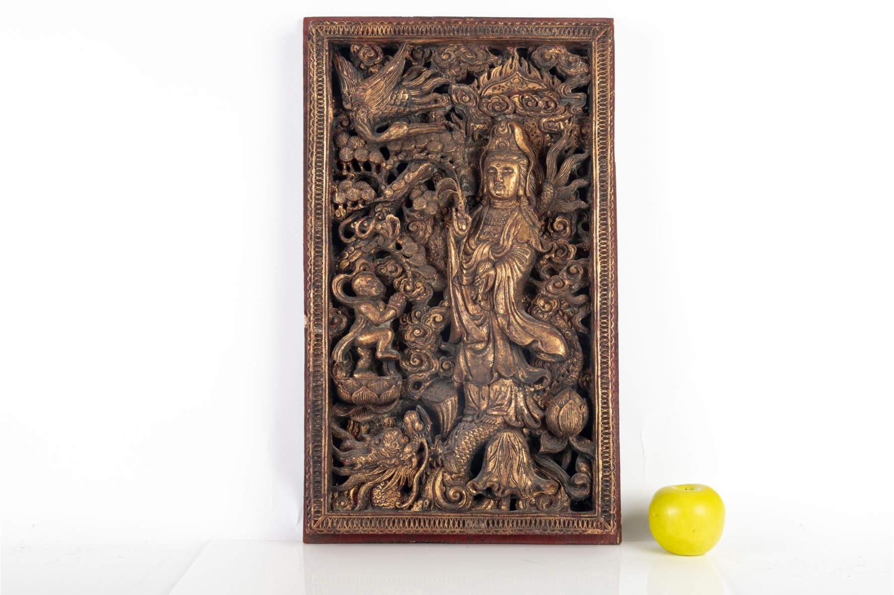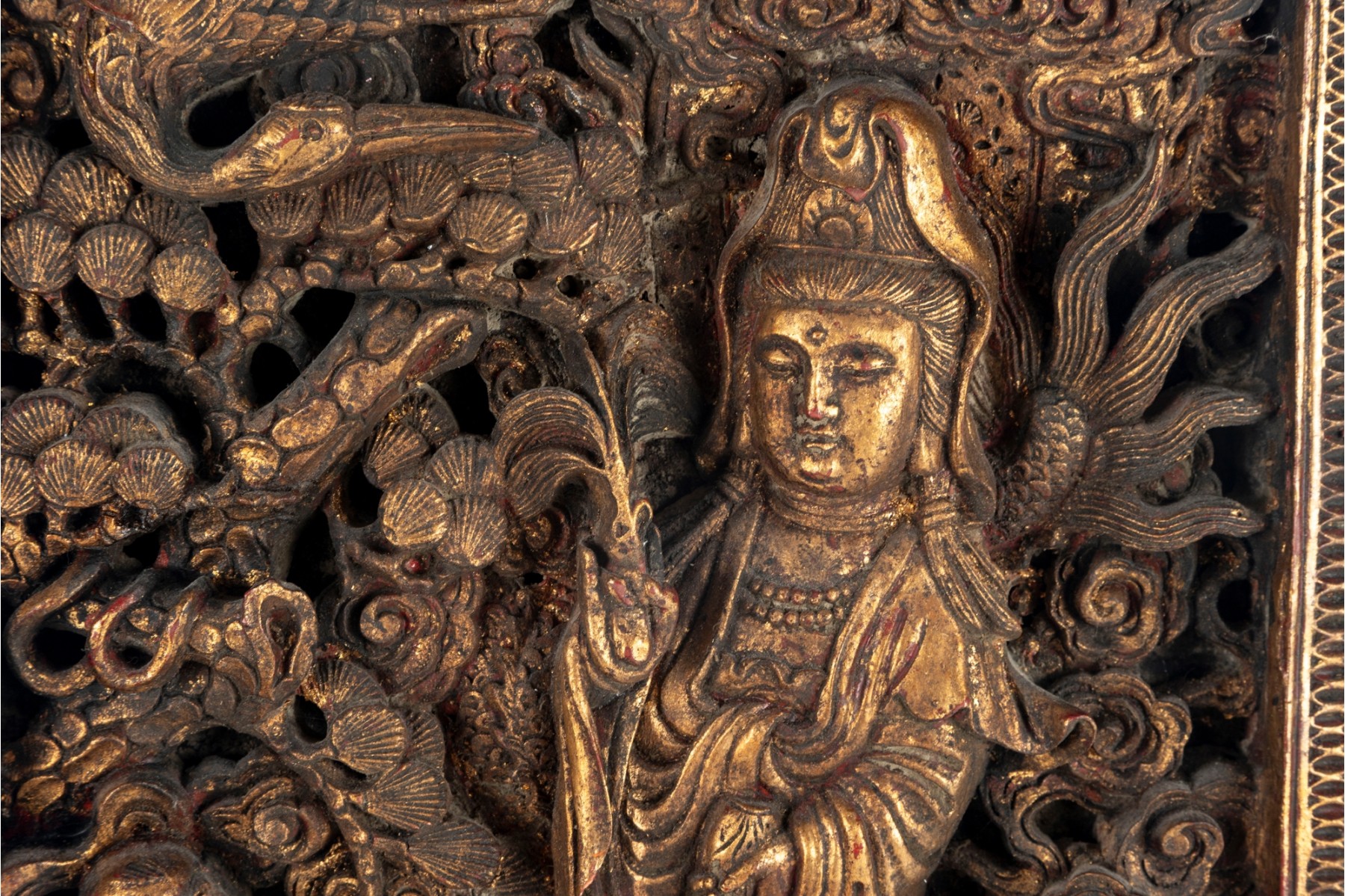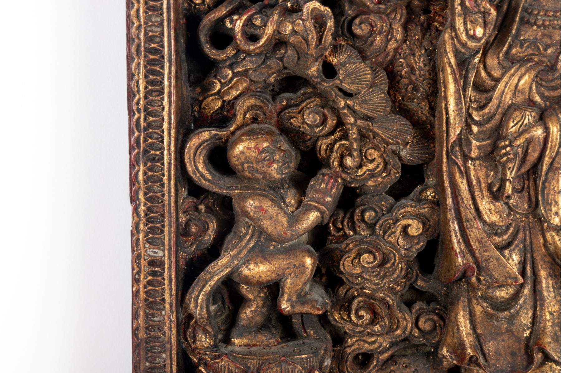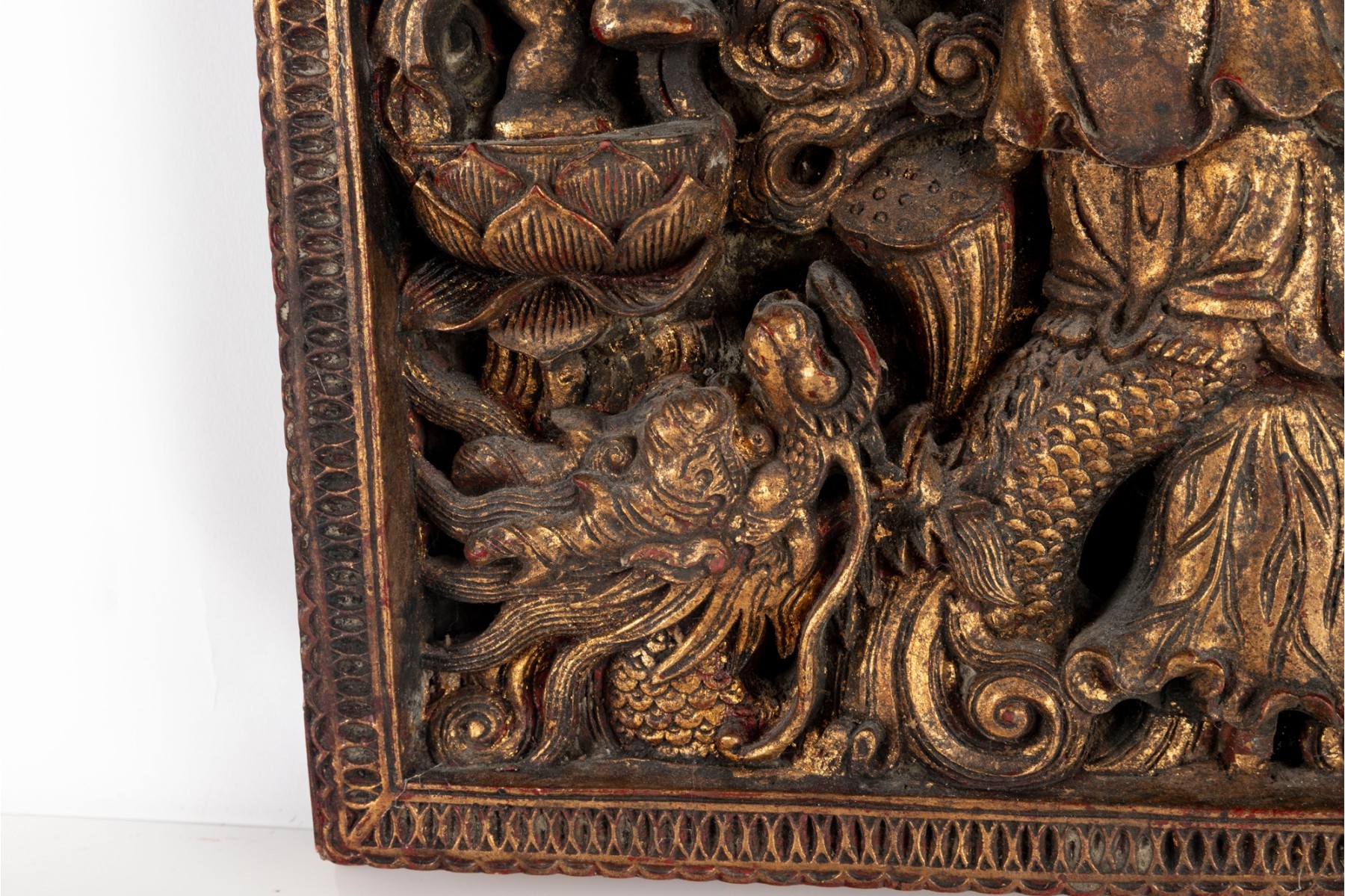 An intricately carved and gilt wooden panel depicting a robed celestial figure surrounded by mythical creatures, clouds, and floral motifs. The detailed relief work showcases traditional Chinese artistry, with symbolic imagery including a phoenix, dragon, and noble figues.