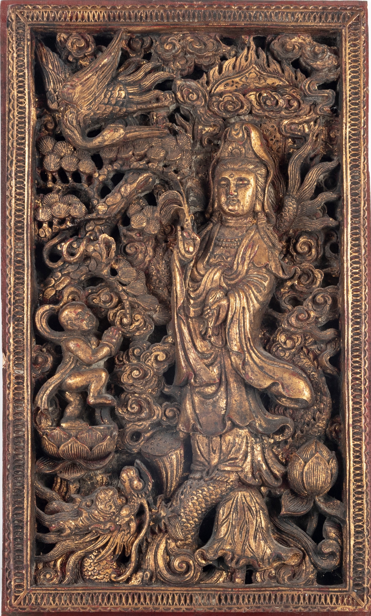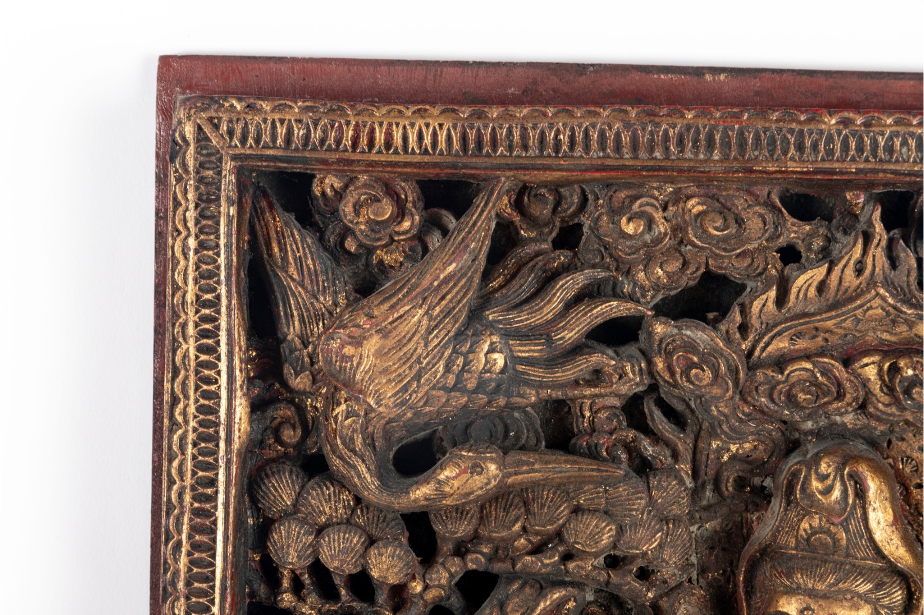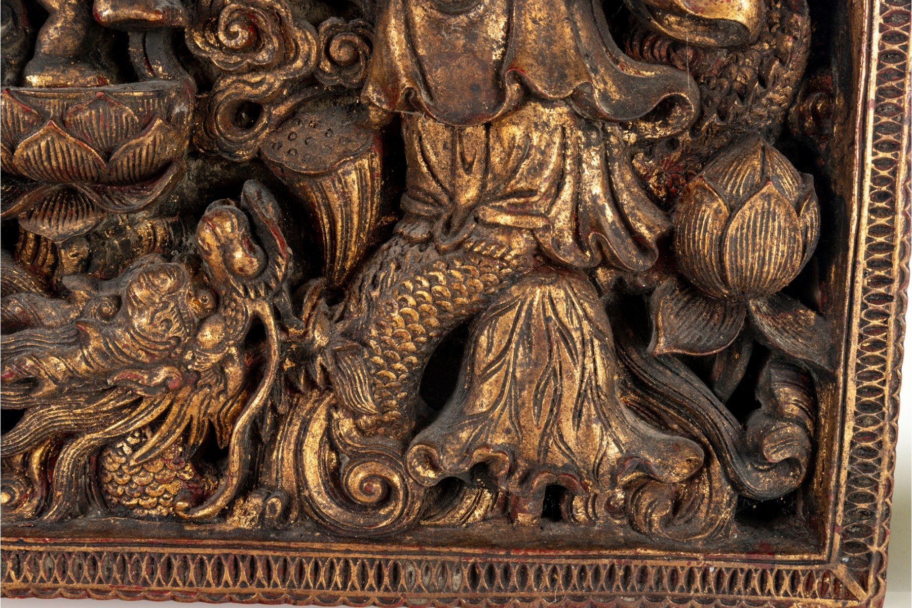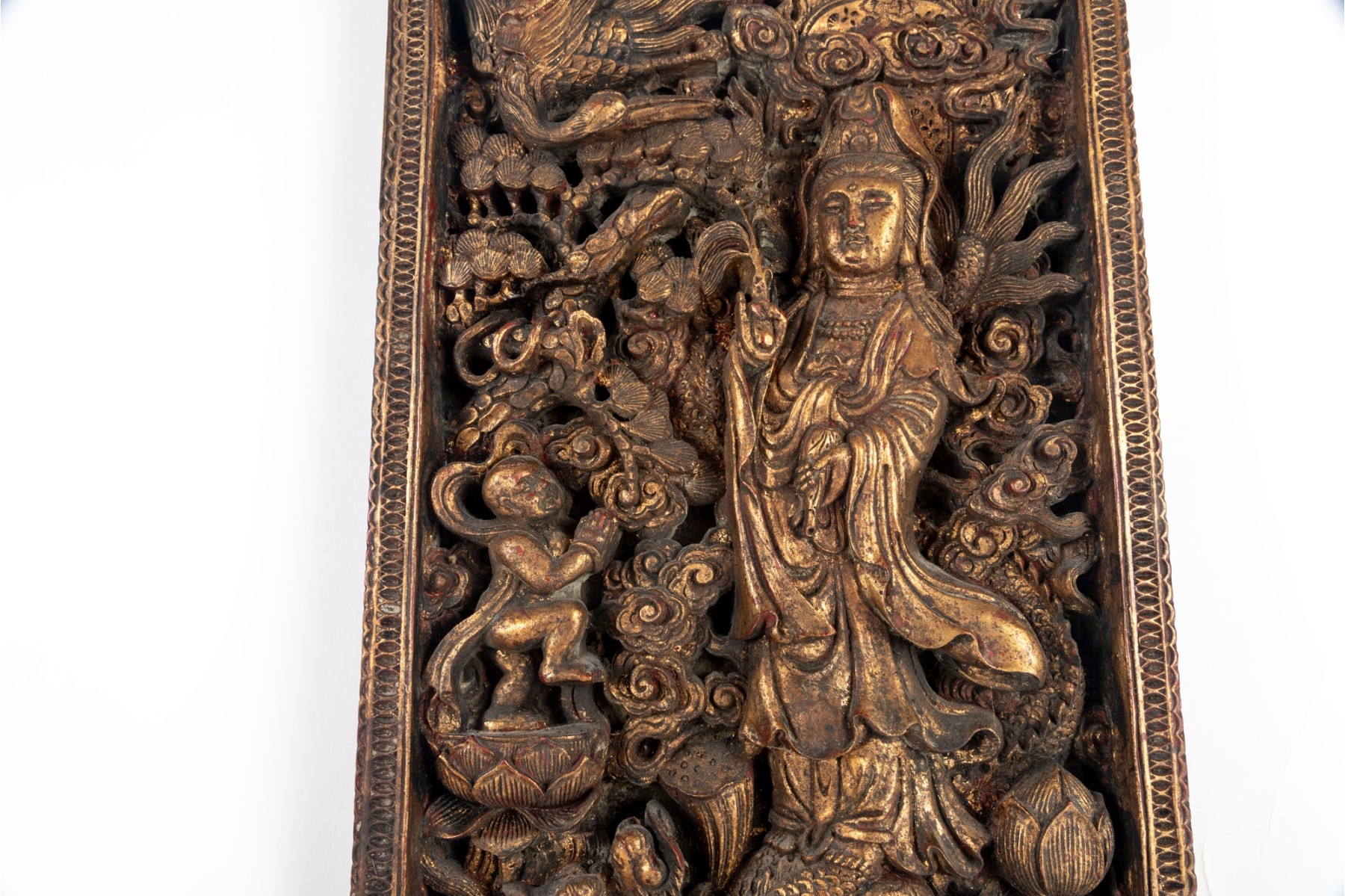 An intricately carved and gilt wooden panel depicting a robed celestial figure surrounded by mythical creatures, clouds, and floral motifs. The detailed relief work showcases traditional Chinese artistry, with symbolic imagery including a phoenix, dragon, and noble figues.
