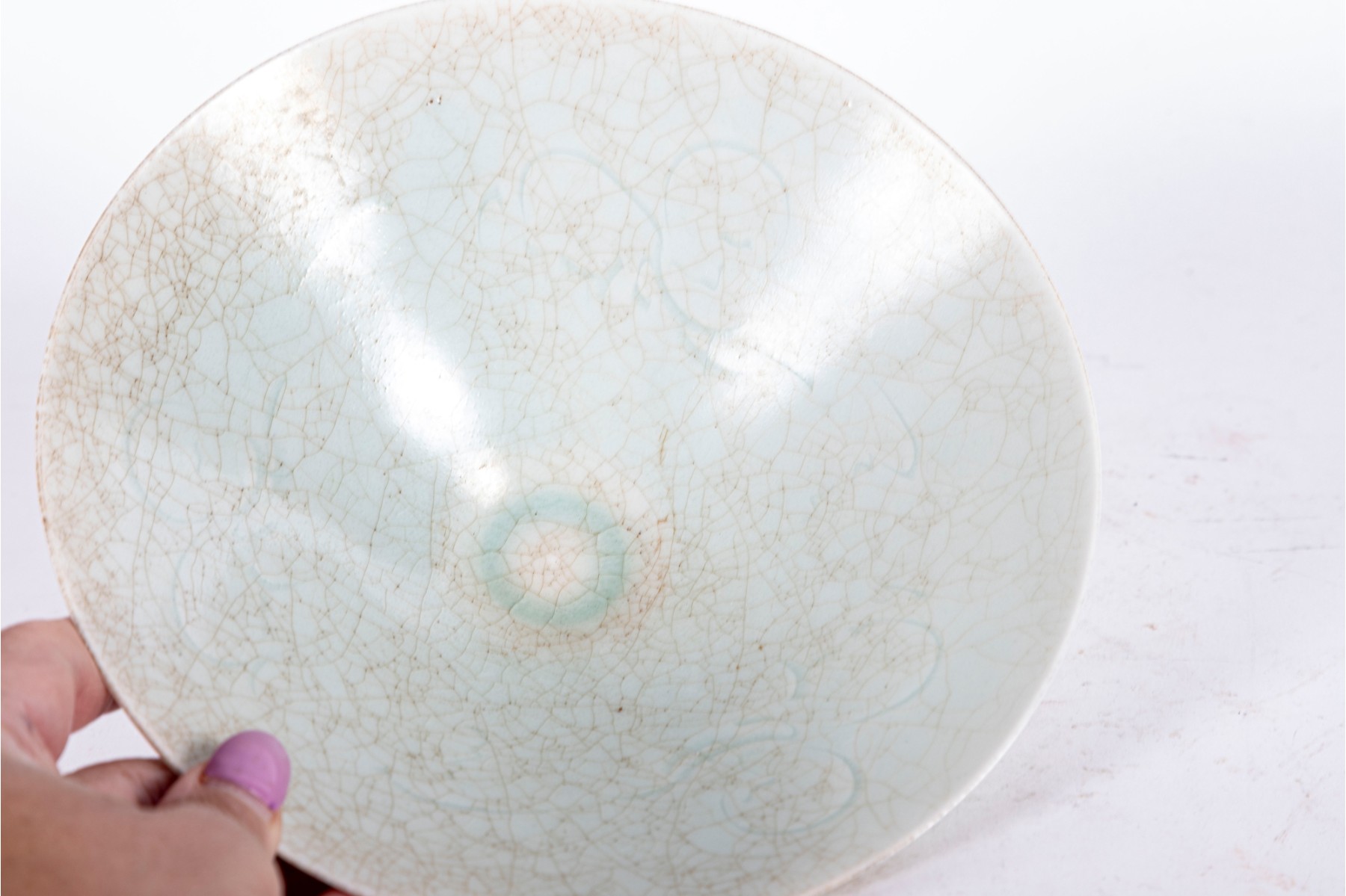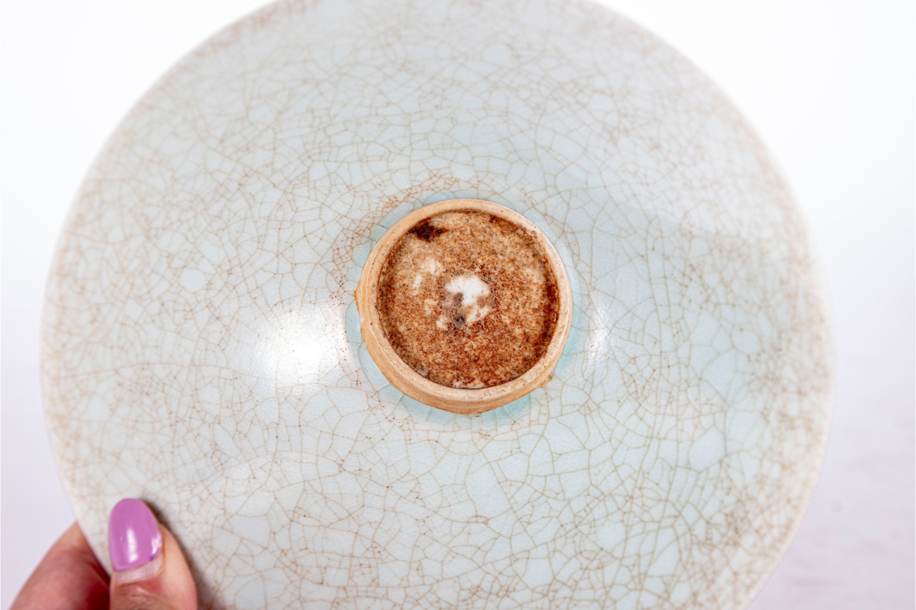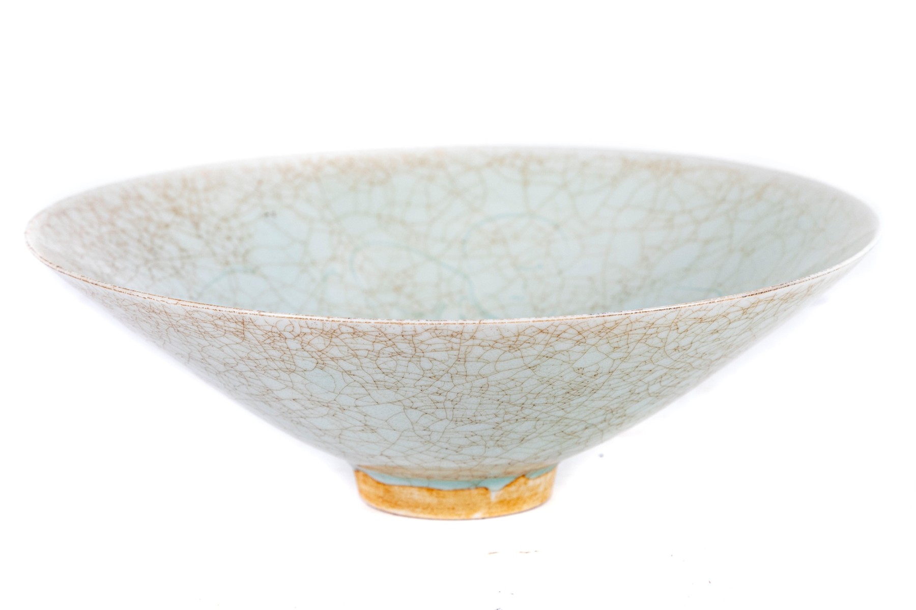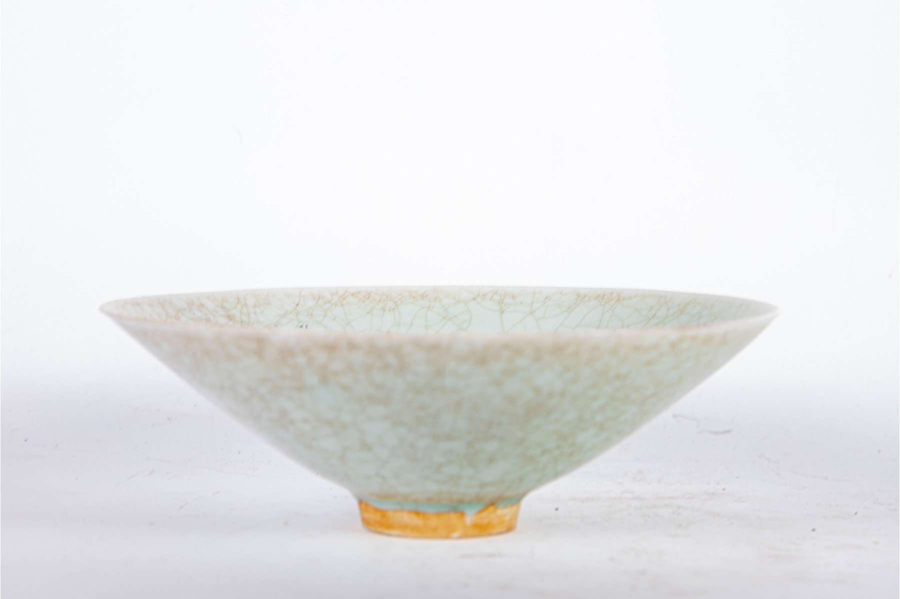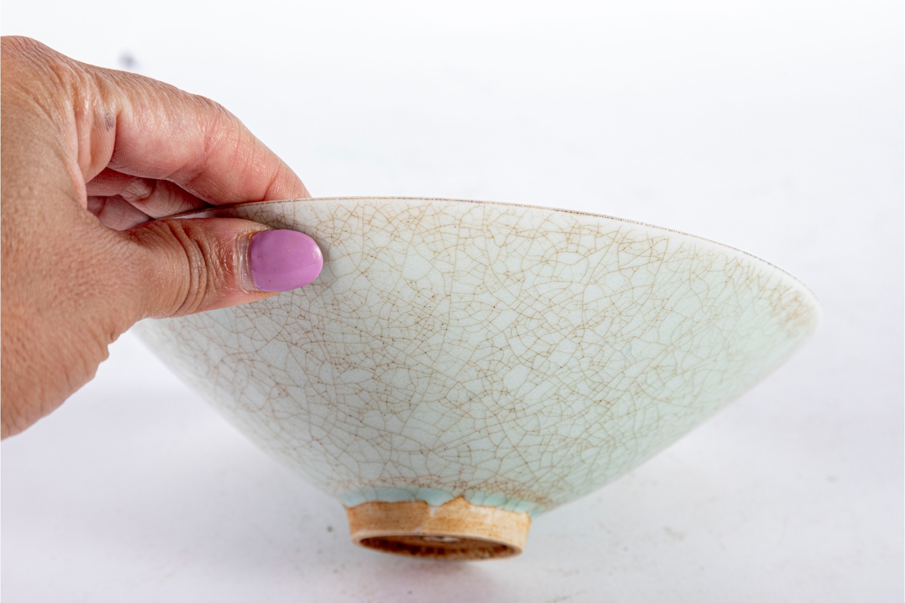 This elegant conical bowl features a classic Guan-style celadon glaze with a fine network of brown crackle lines.