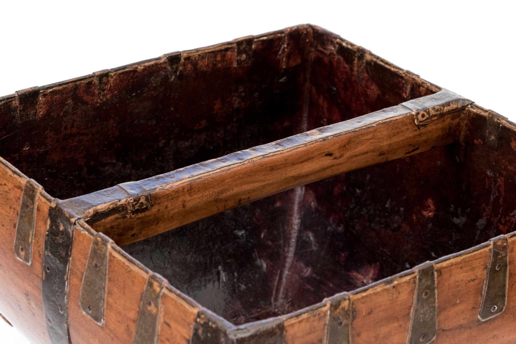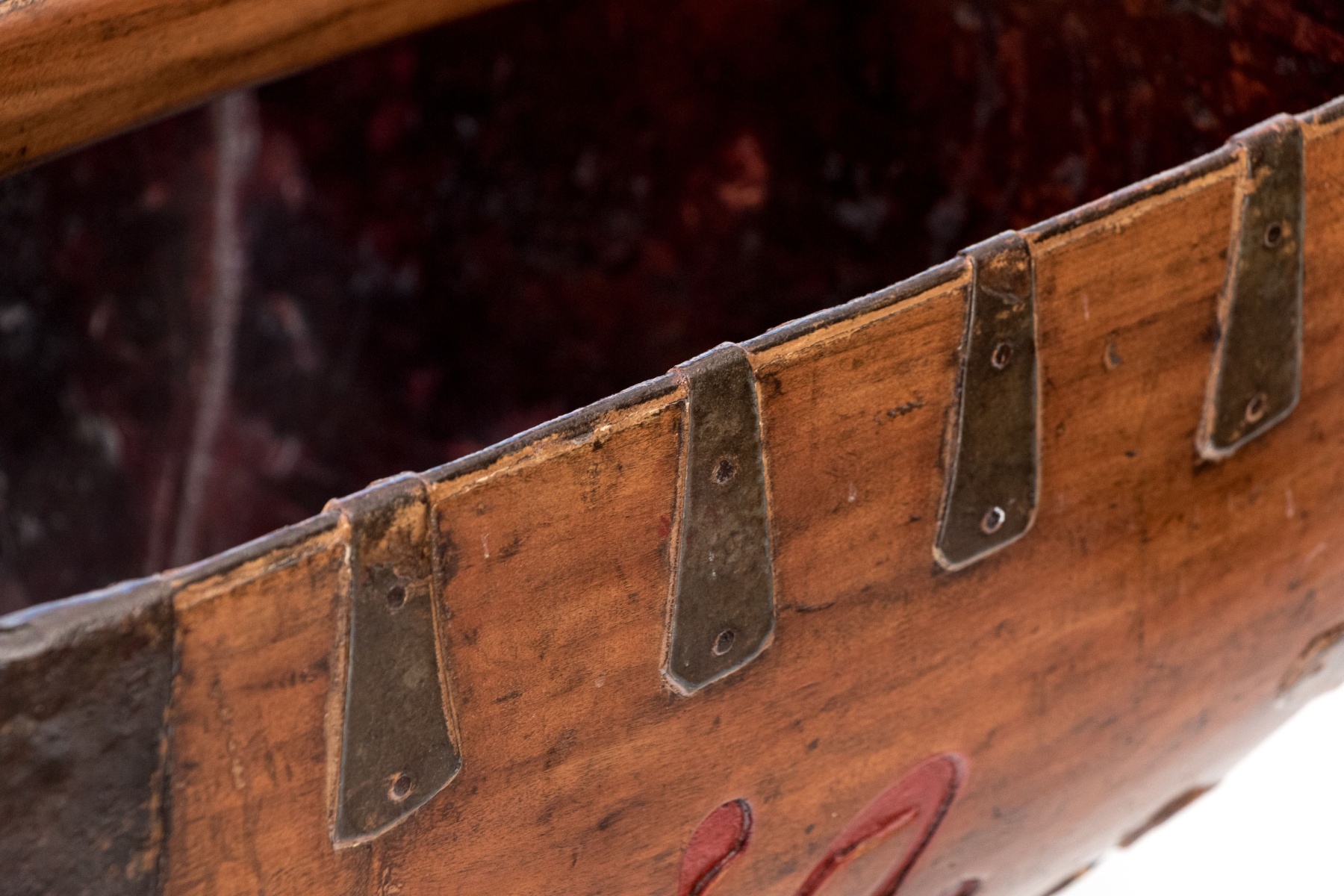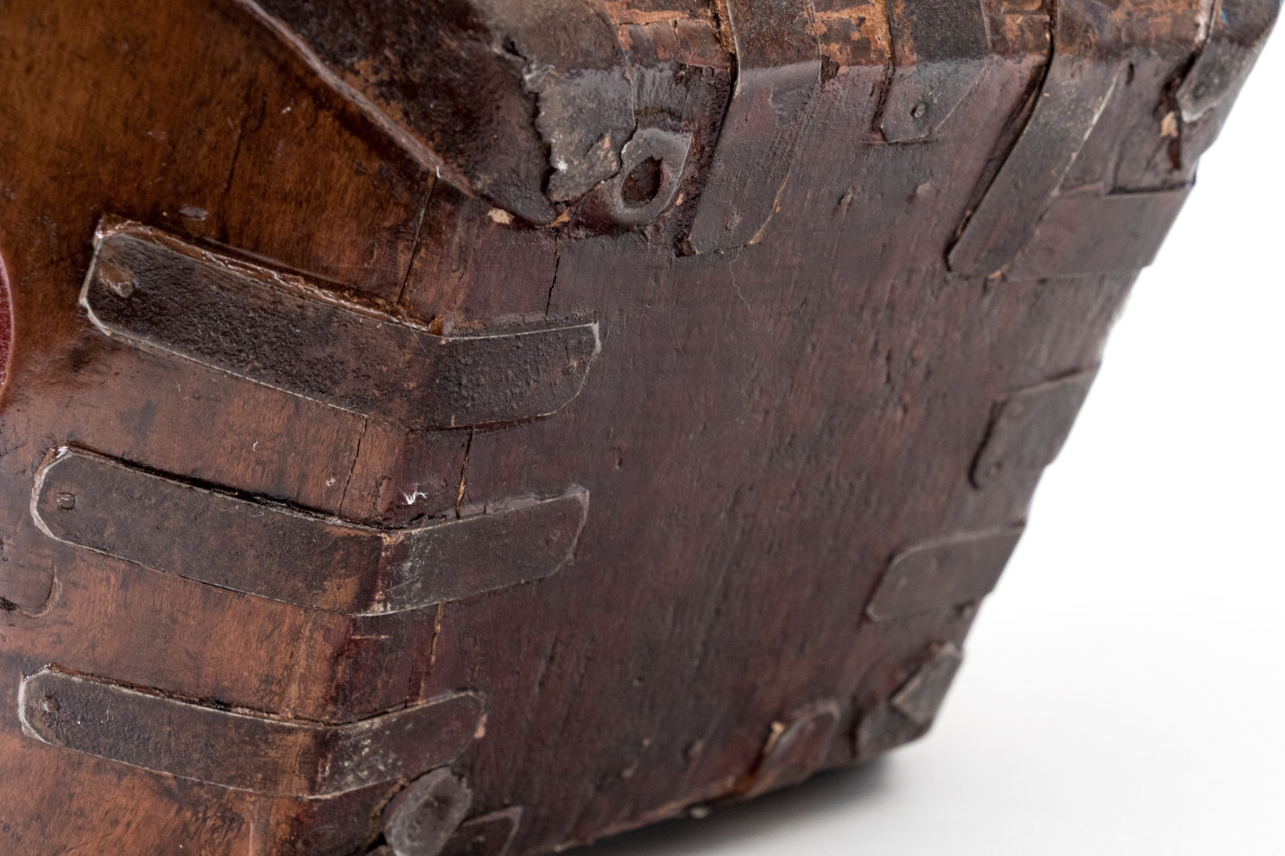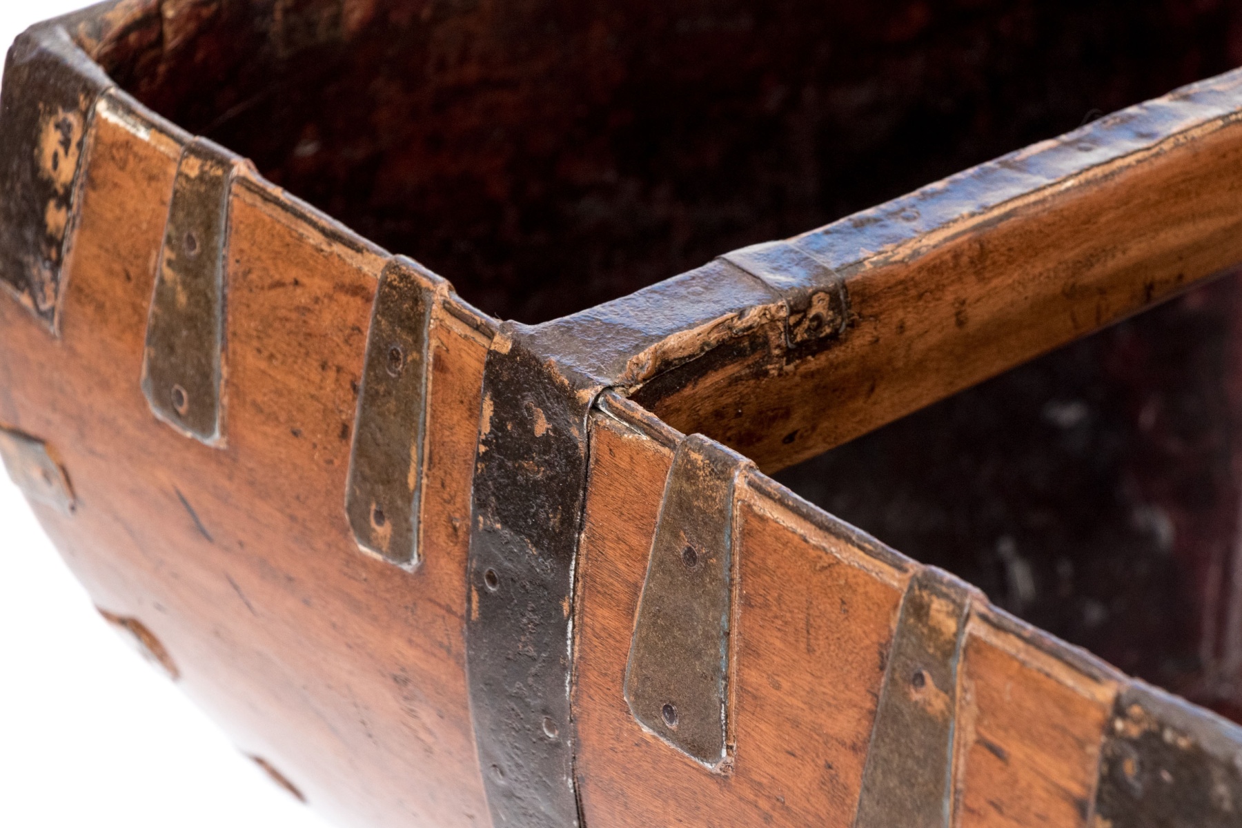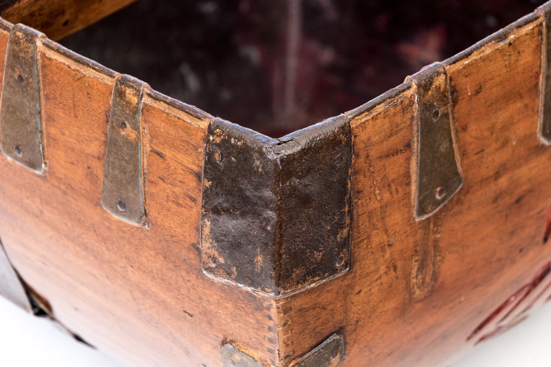 Good overall however, some iron straps are slacking and pitting and wear to the finish commensurate with age and use. A great decorative piece.