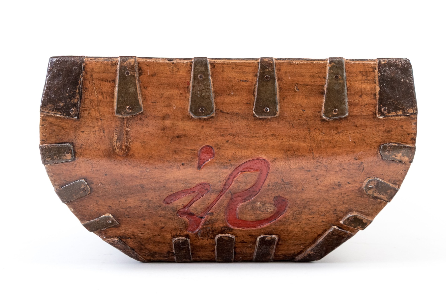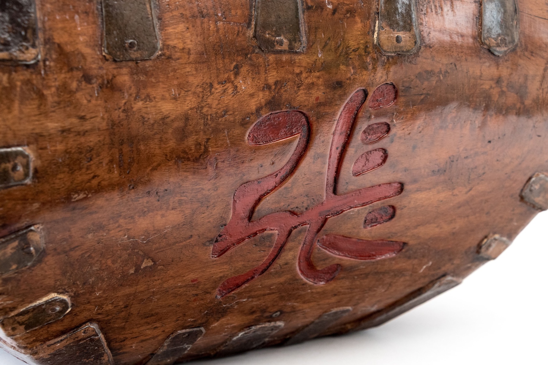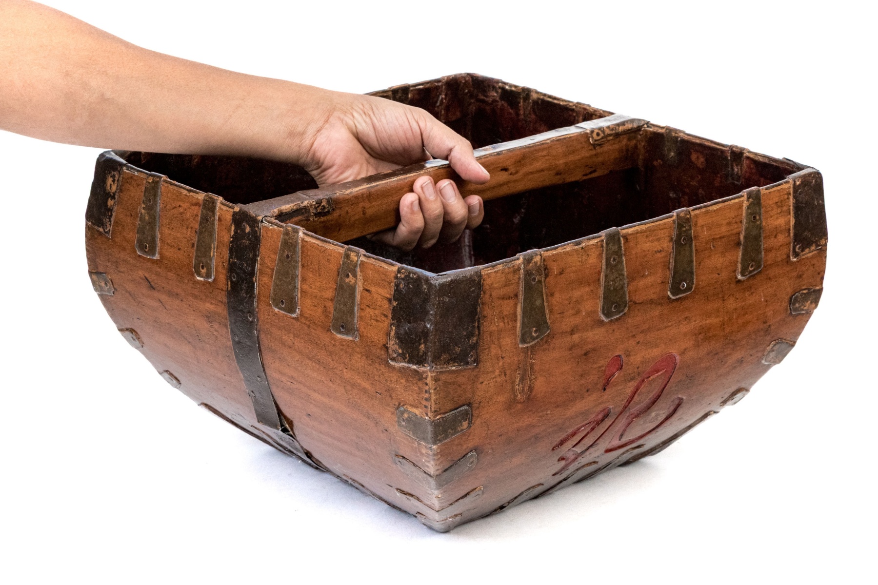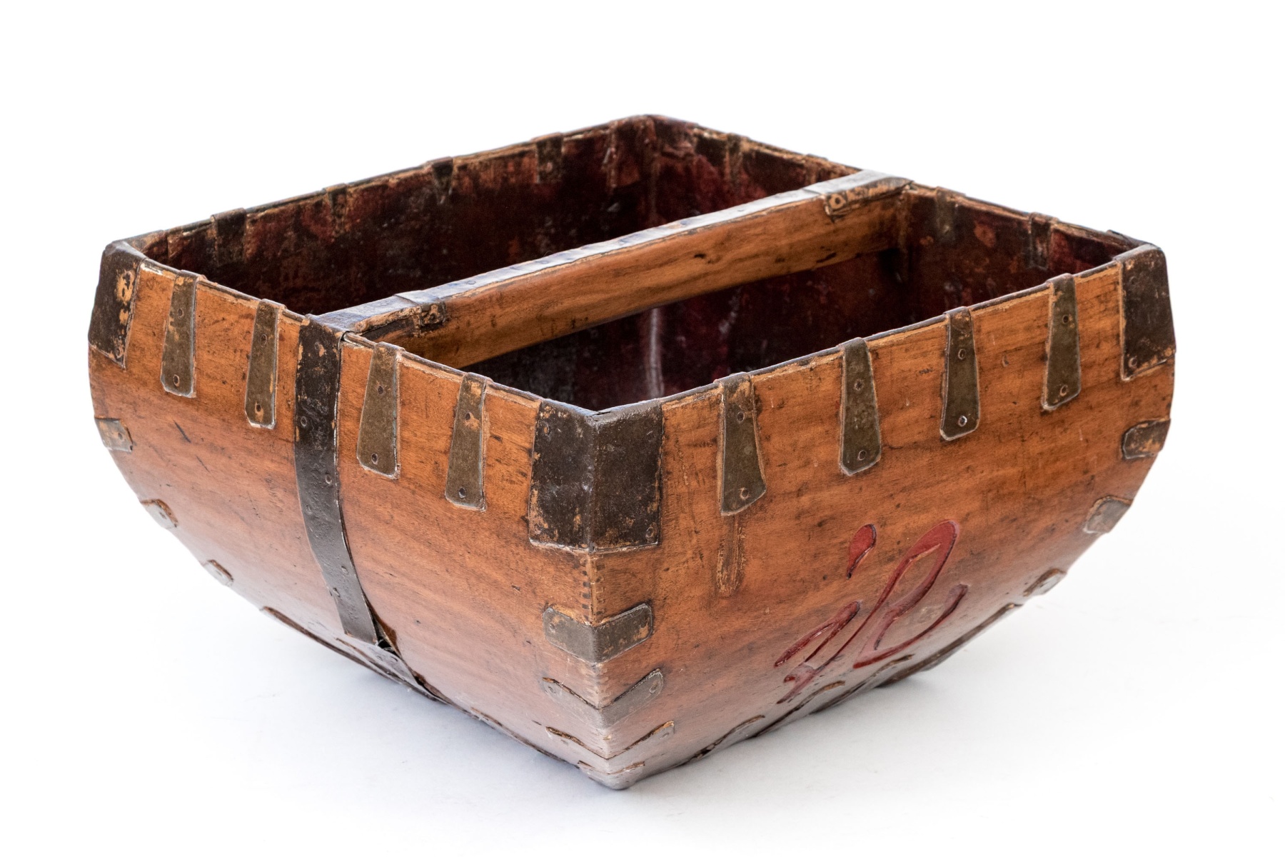 The bowl of square form top with tapered lower body and single central handle. Iron bound with carved and lacquered calligraphic figure.