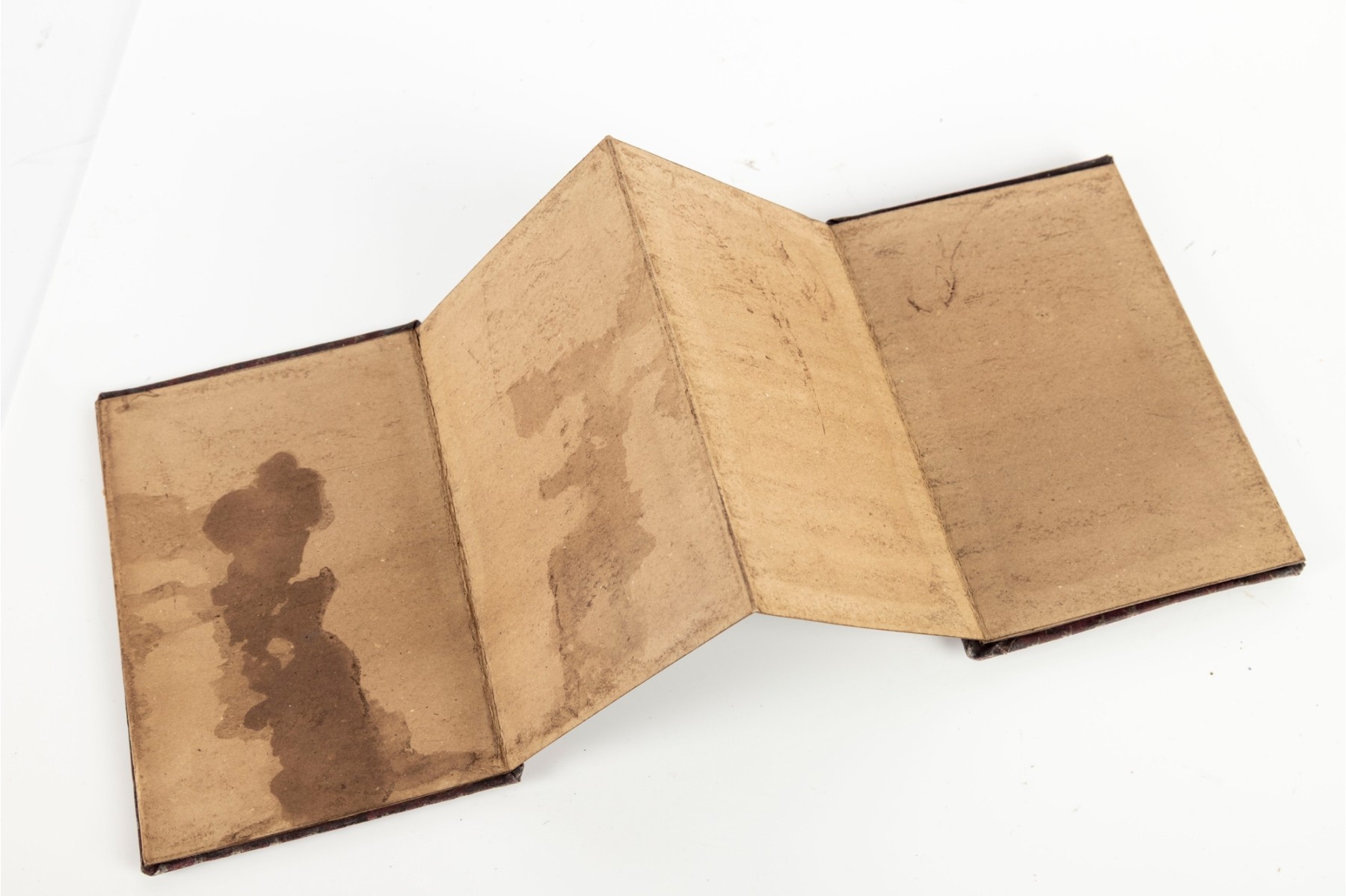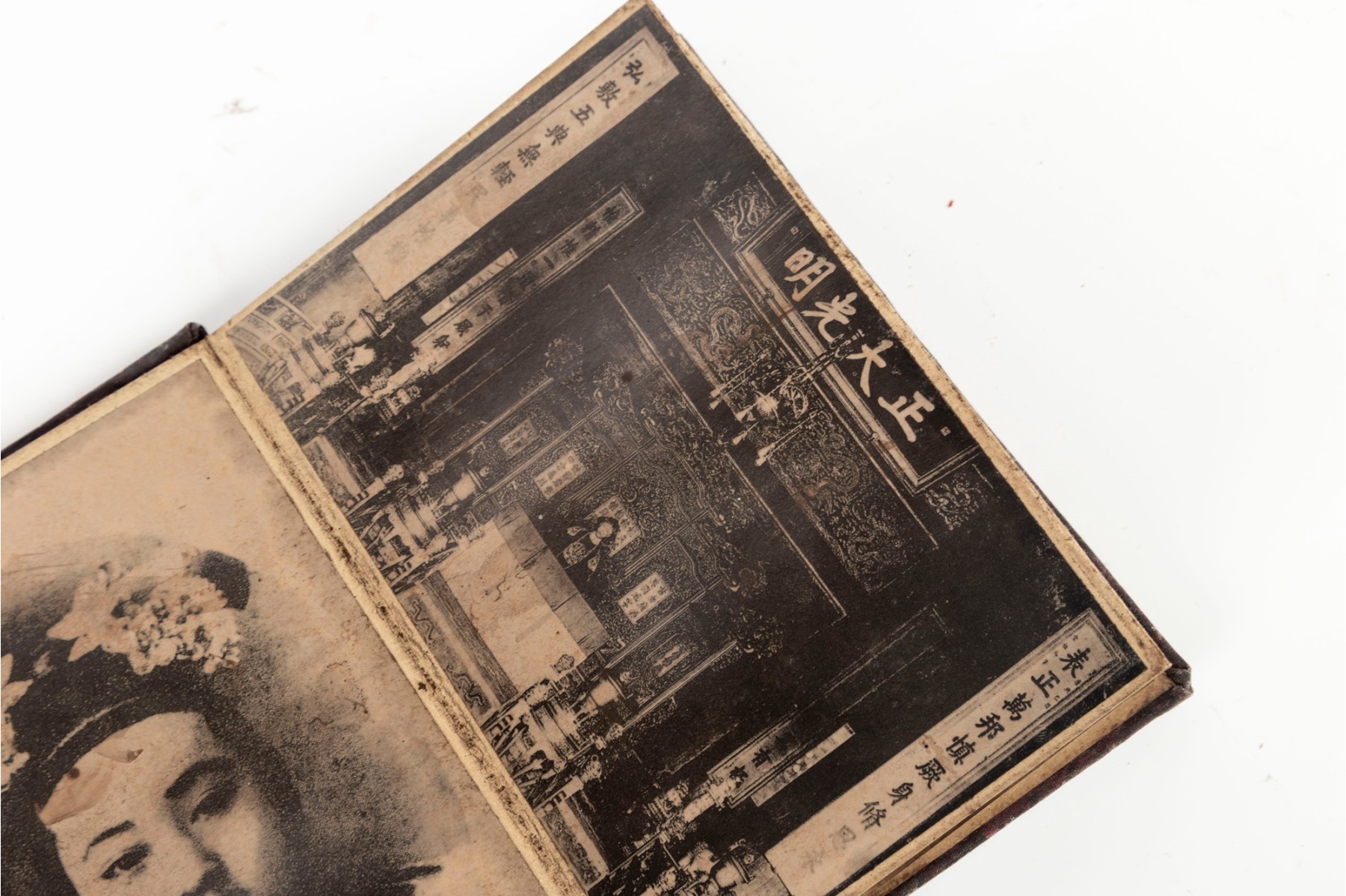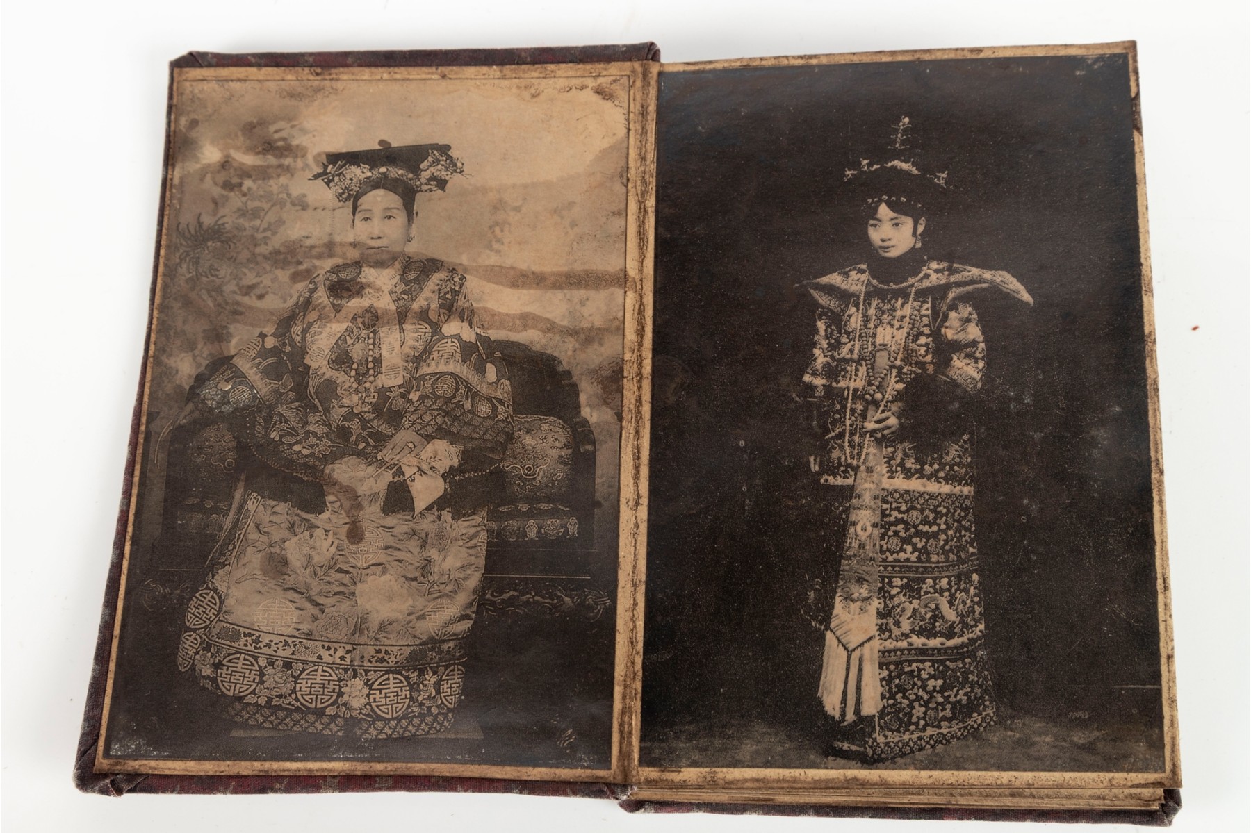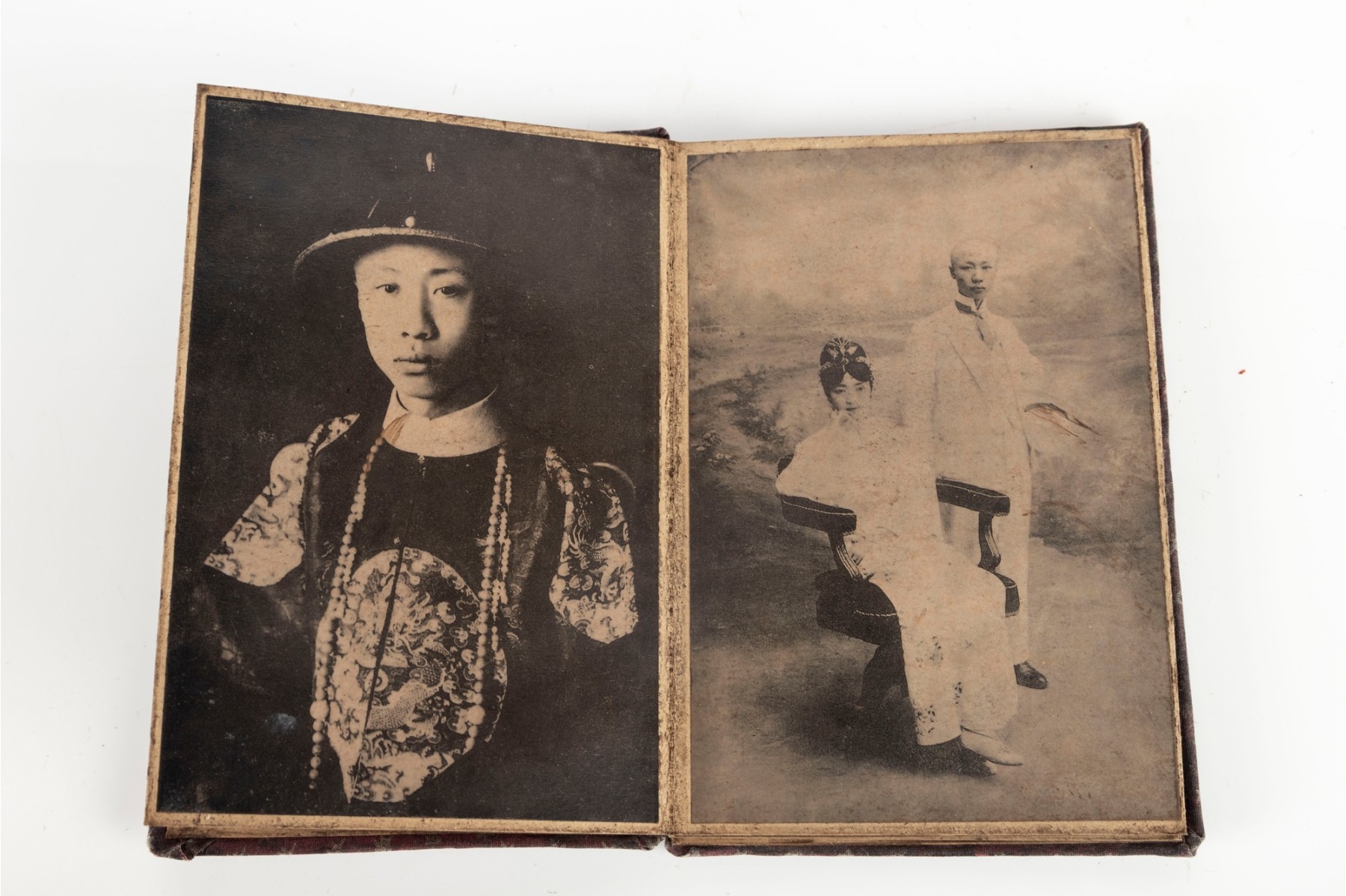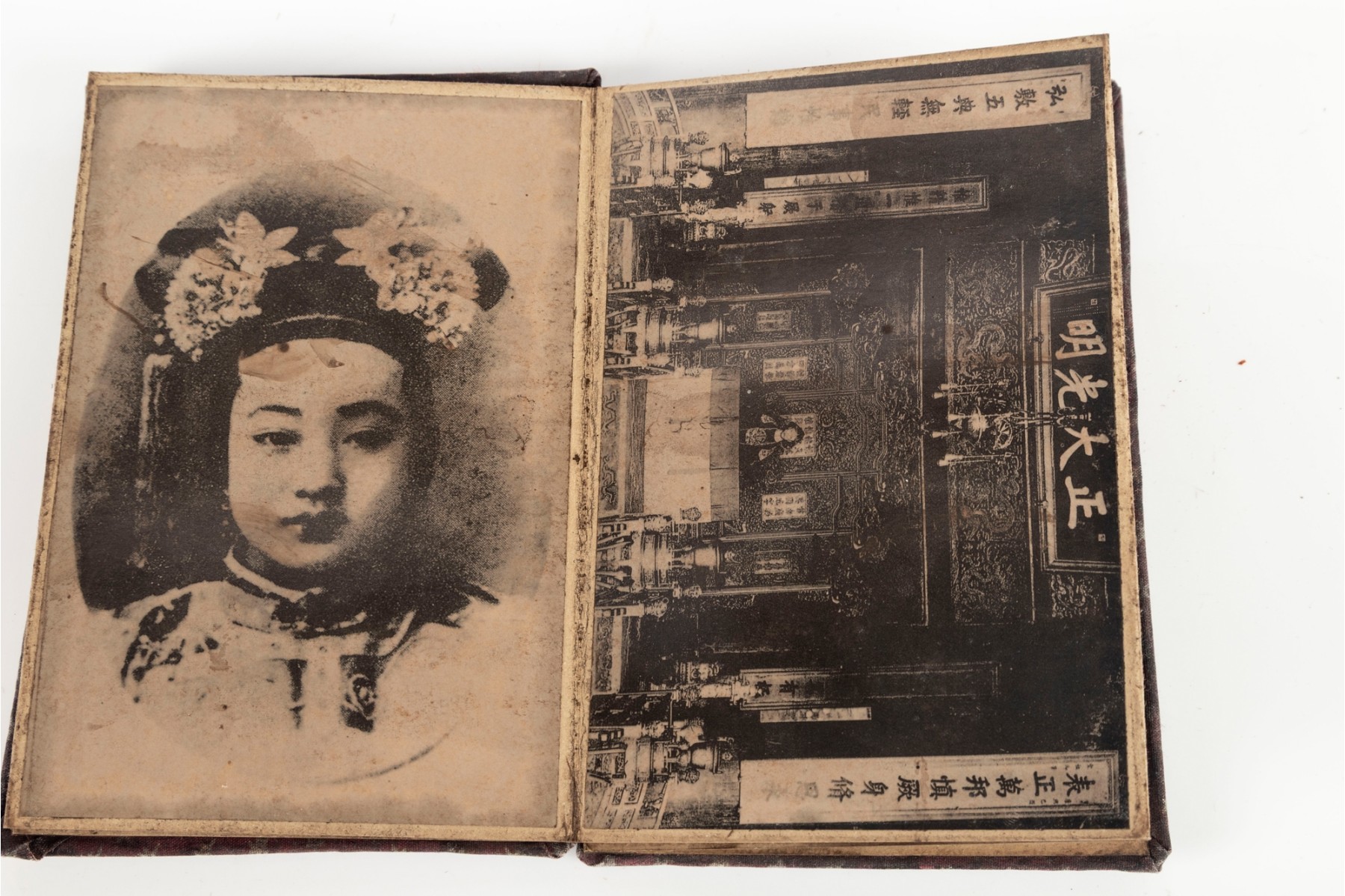 An antique Chinese leporello labeled "皇室書影" ("Imperial Household Photographs") depicting various portraits including Empress Dowager Cixi, last Qing emperor PuYi and his wife Wanrong, and more. The album features an accordion layout with hardcover end caps.