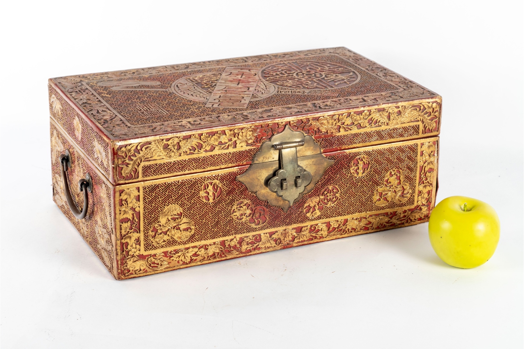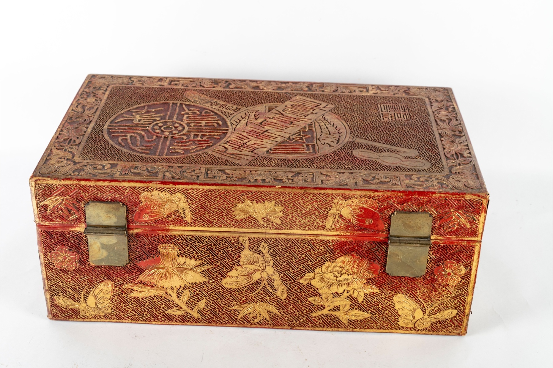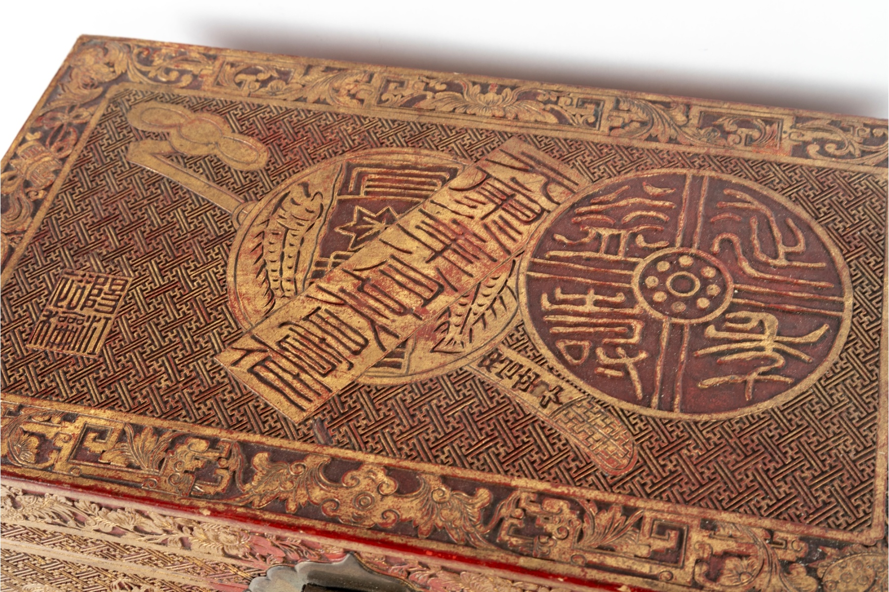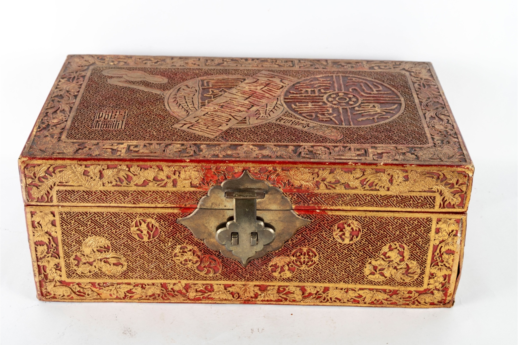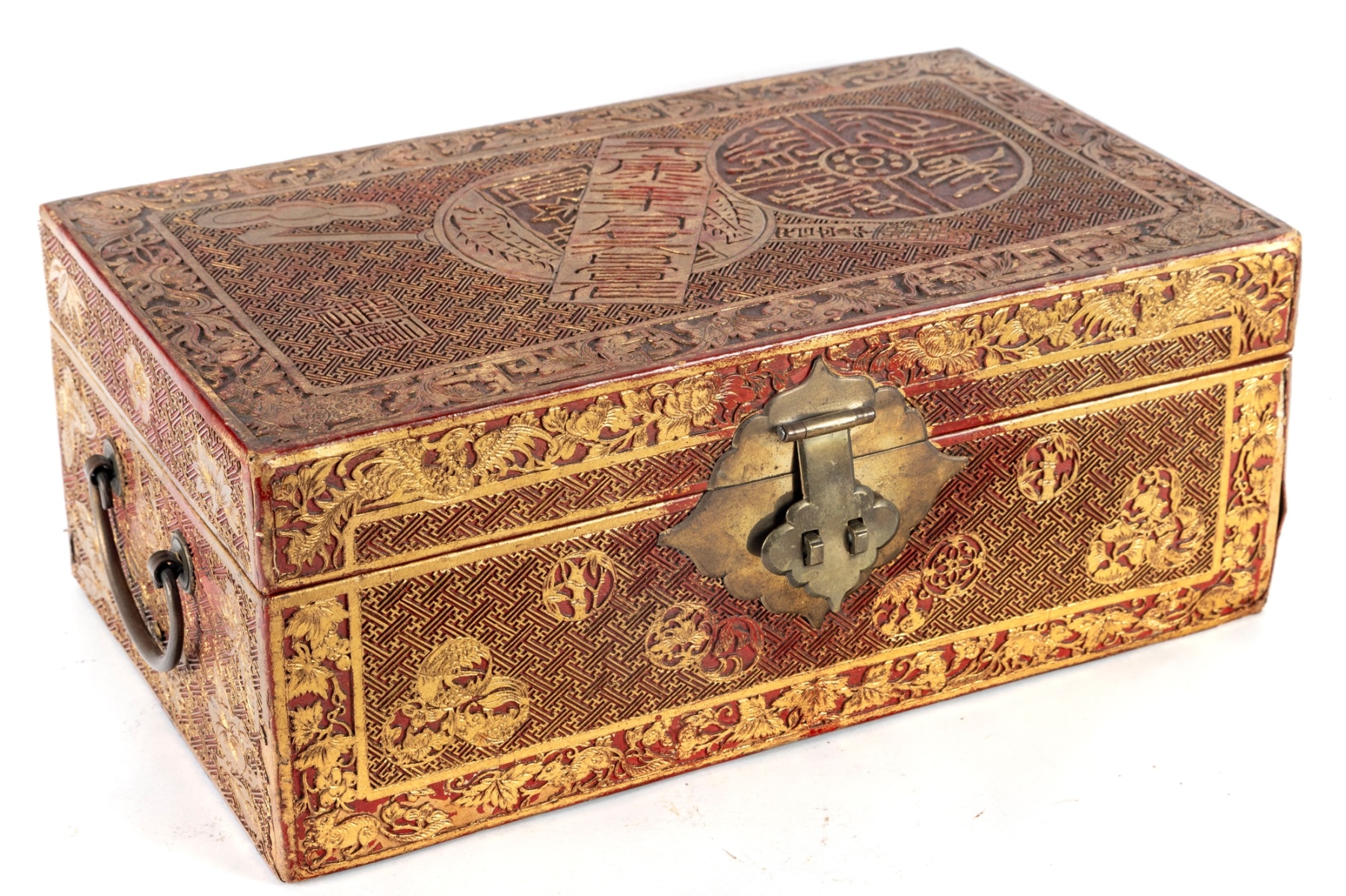 A beautifully detailed antique Chinese red and gilt lacquered wood storage box, featuring rich hand-carved and embossed designs throughout. The lid displays traditional symbols of prosperity, longevity, and protection with intricate Chinese calligraphy and auspicious motifs, including florals, bats, and lattice patterns. The sides continue the ornate gilt design against a deep red lacquer background.