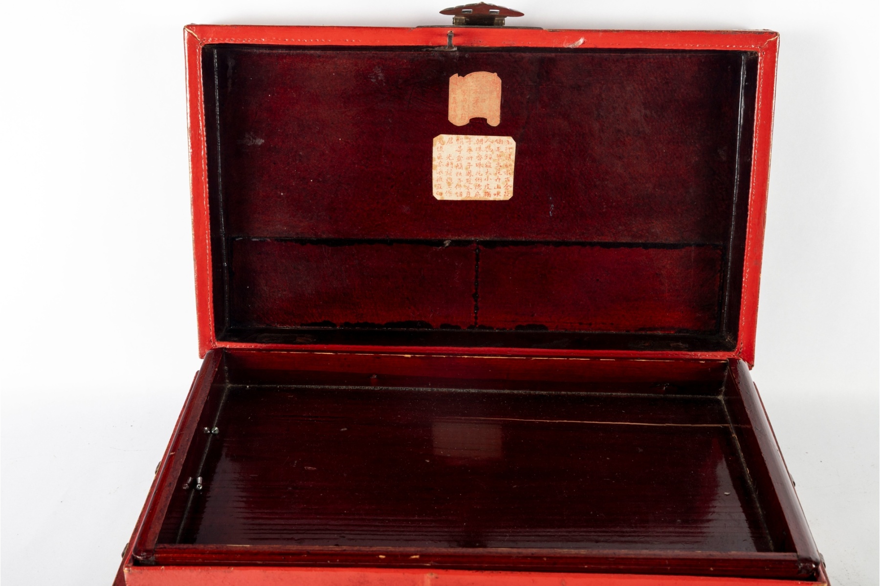 The box opens to reveal a red lacquer interior with a fitted lift-out tray and a paper label with Chinese script under the lid. Brass latch hardware and side handles