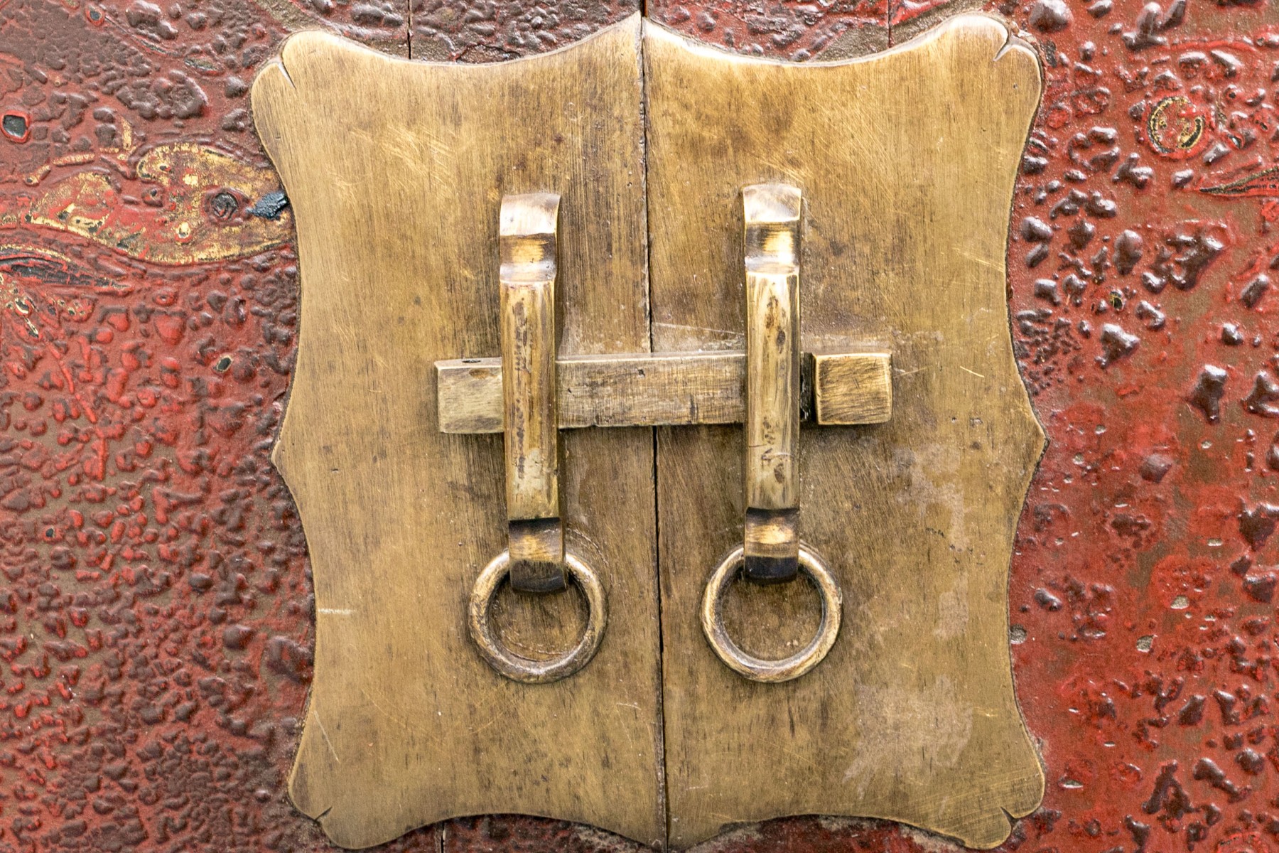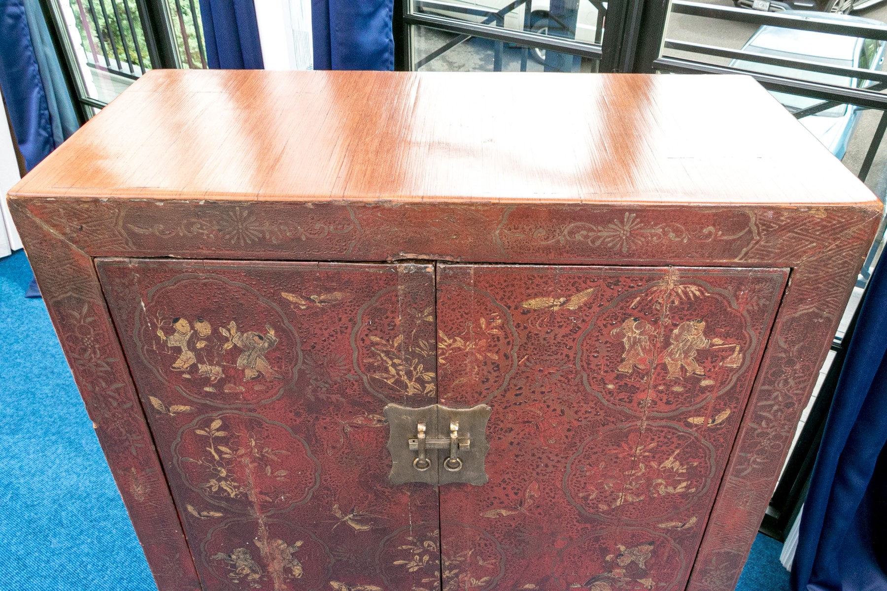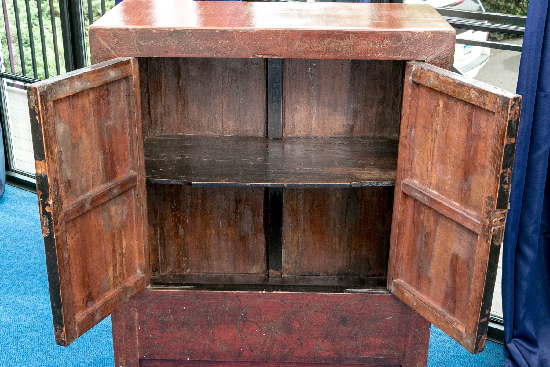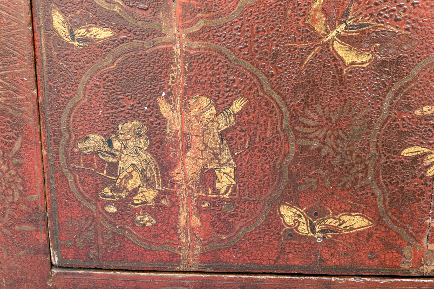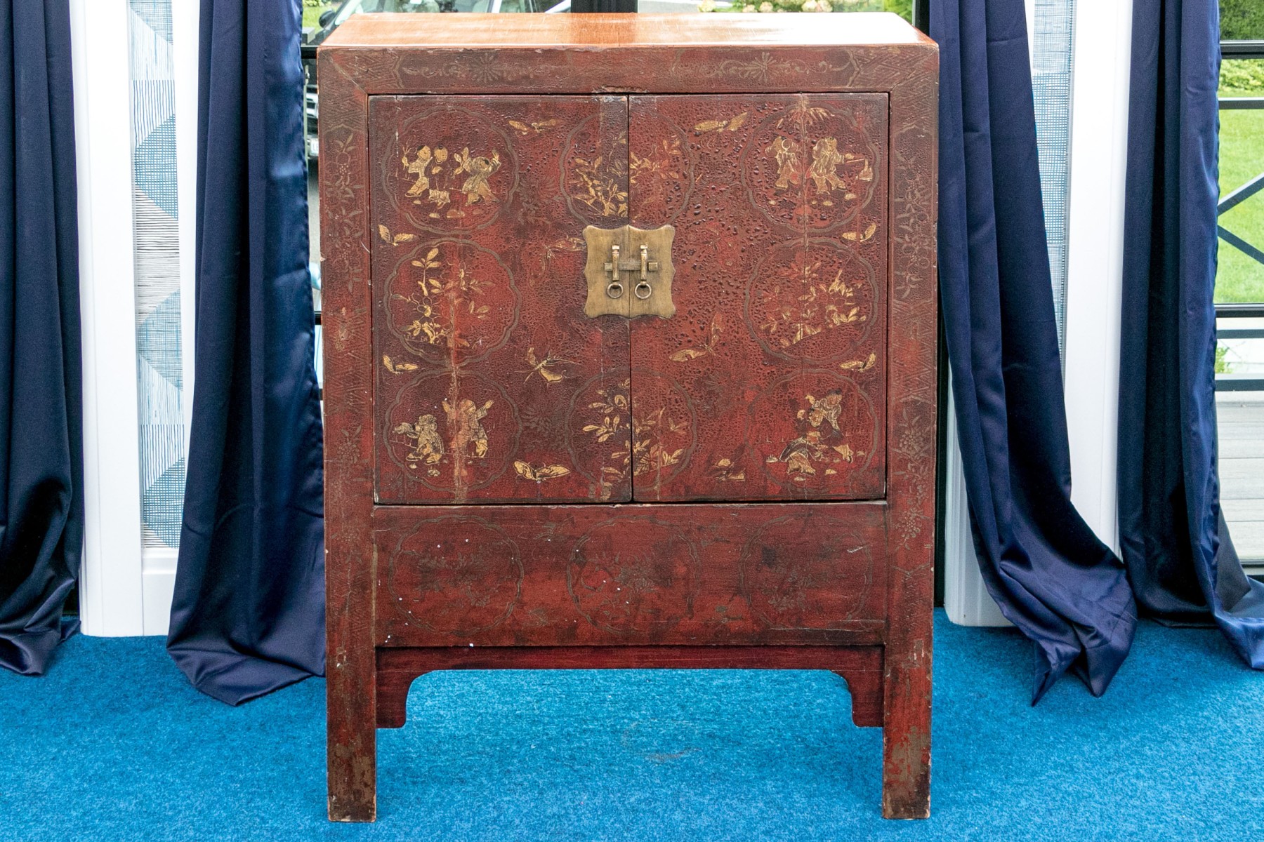 An antique Chinese Shanxi cabinet lacquered red with an excellent patina. Features a simple, rectangular profile showcasing double doors with a shapely brass plaque and pin closure opening to a spacious interior with a single shelf. The doors are ornately detailed with scalloped medallion reserves depicting figures, moths, and lush foliage, complimenting borders of foliate sprays along the frame.