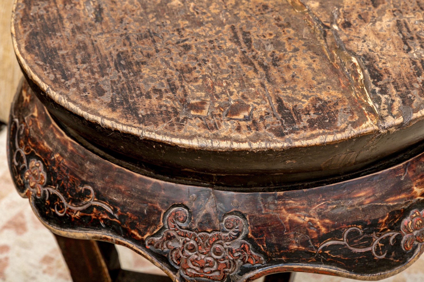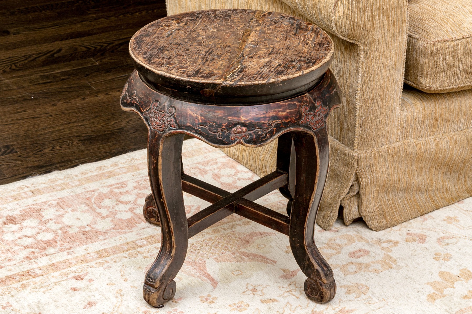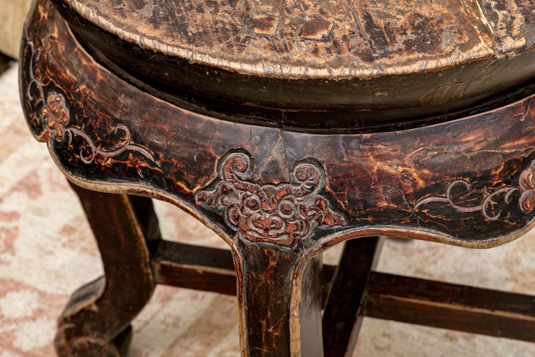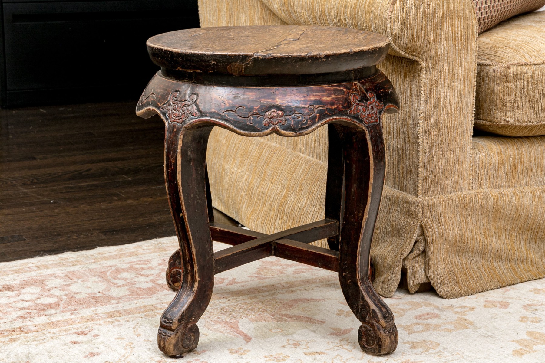 A wonderful and nicely aged Chinese pot stand or side table in warm medium brown finished wood. Features a circular top over a serpentine apron carved with figural lion heads and floral scrolls. raised on cabriole legs with carved and scrolled feet around an X-stretcher.
