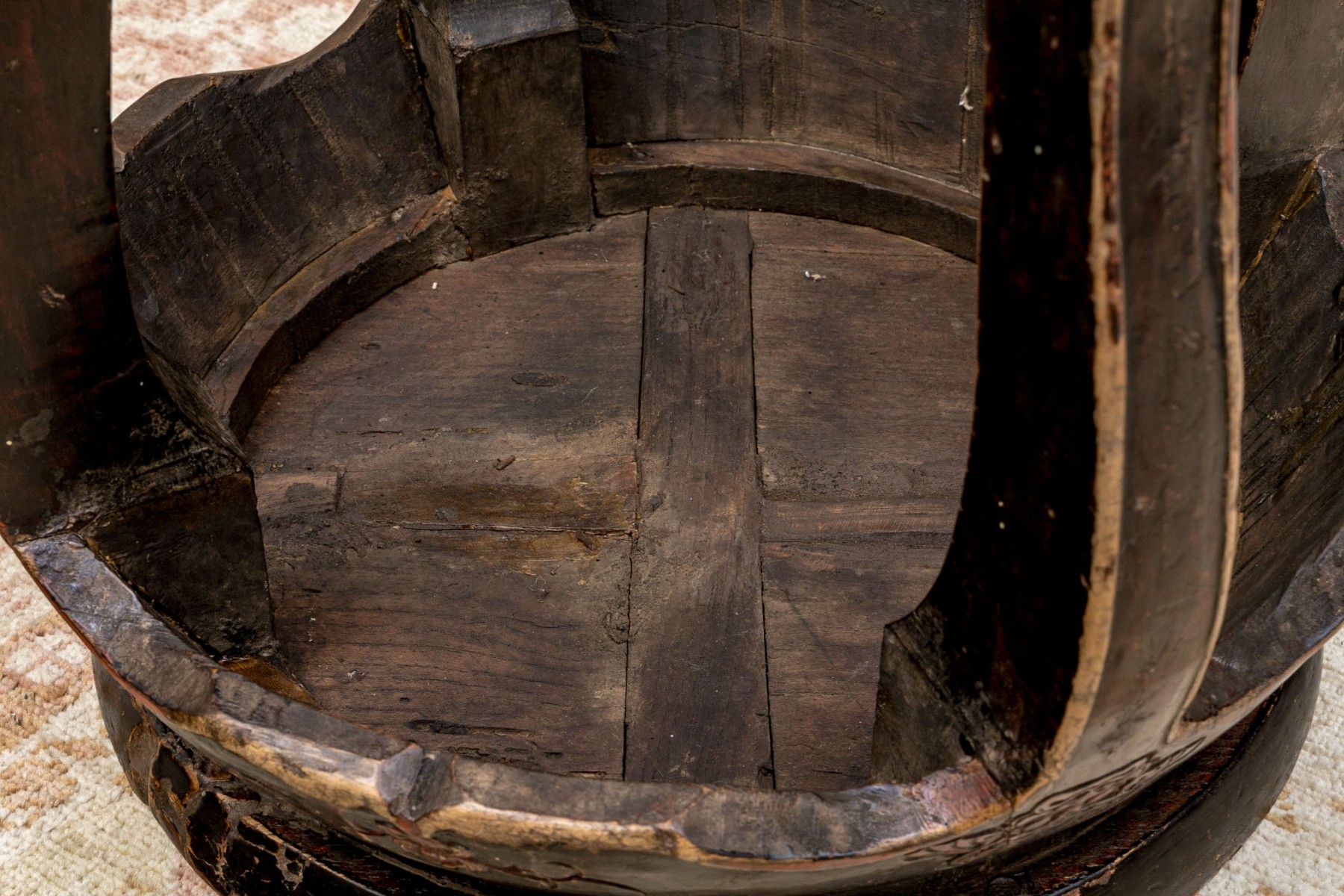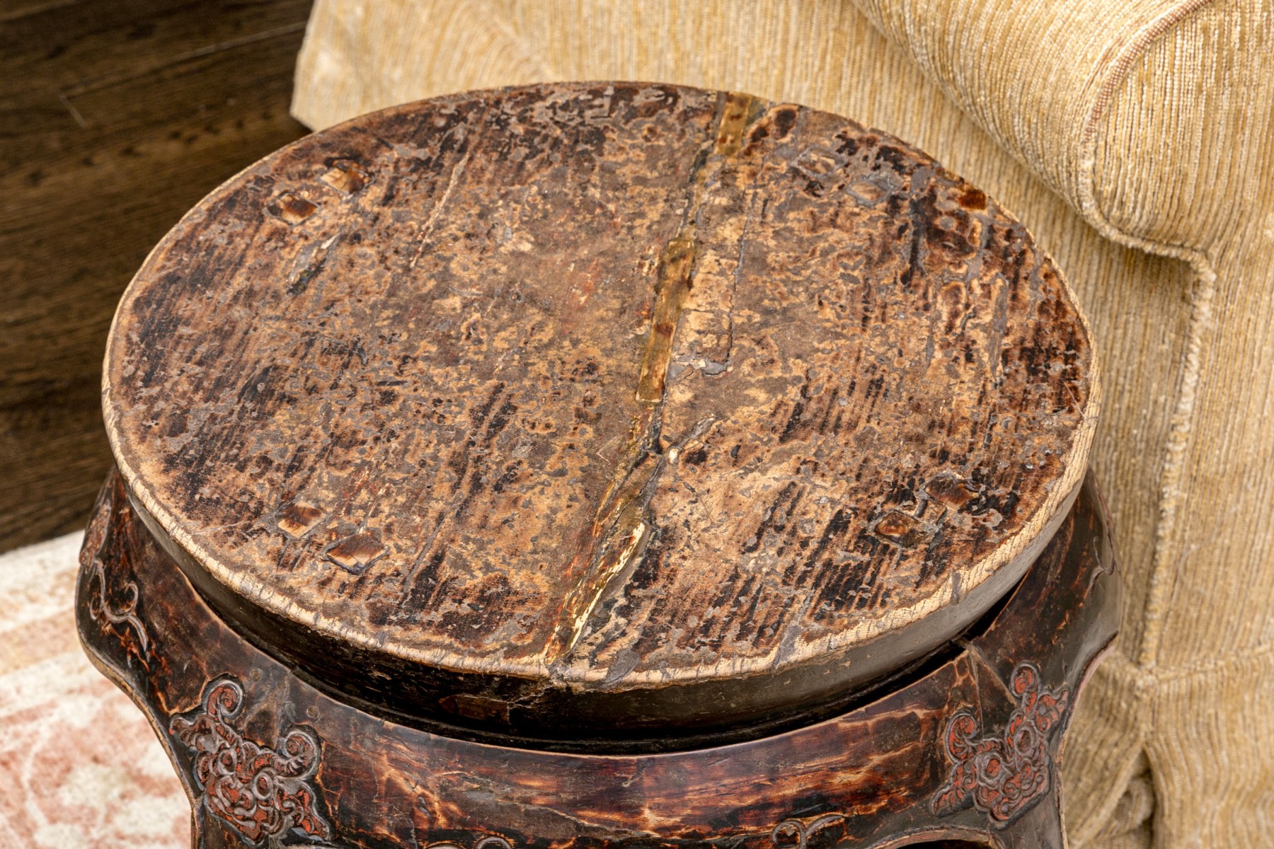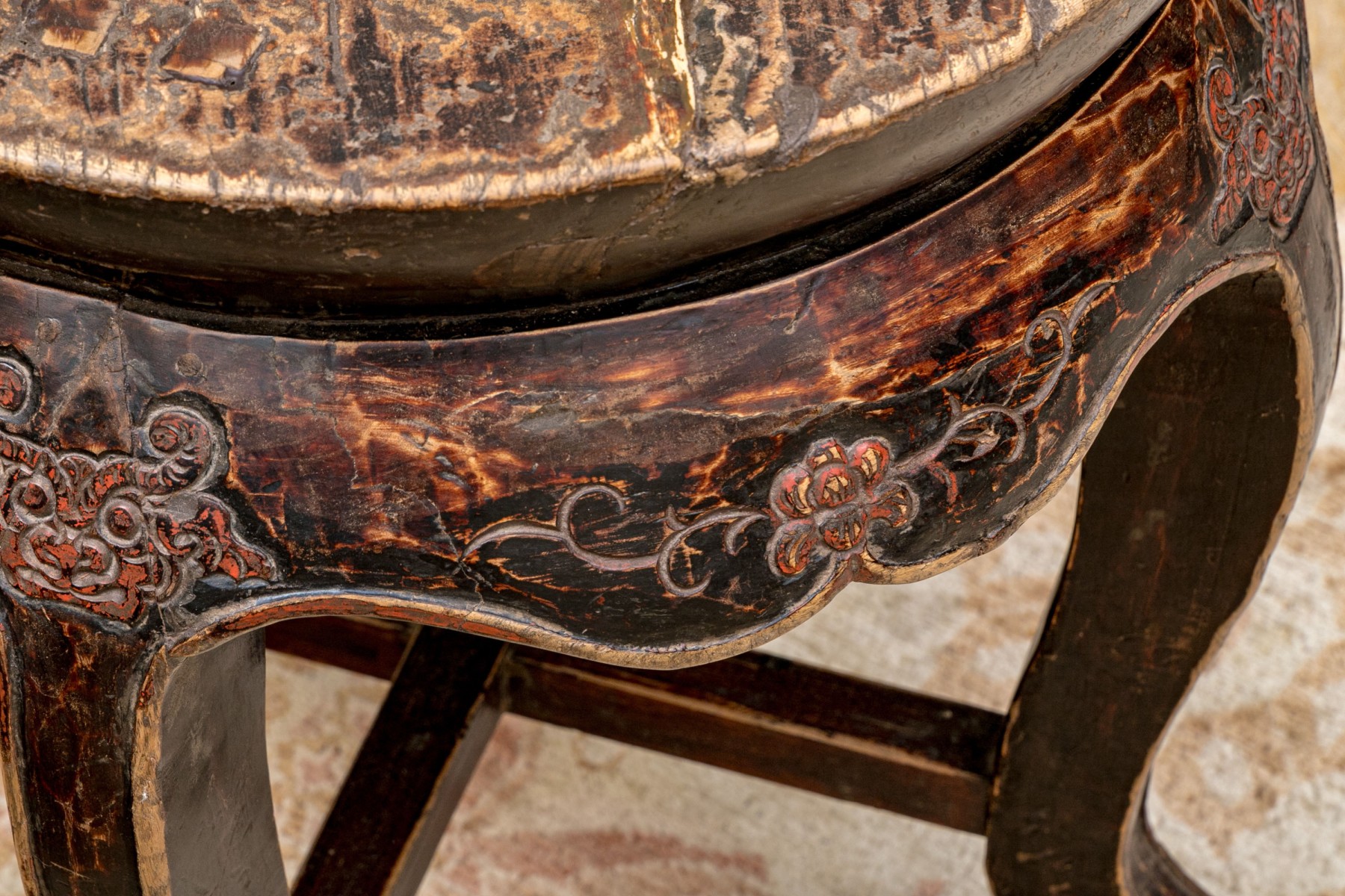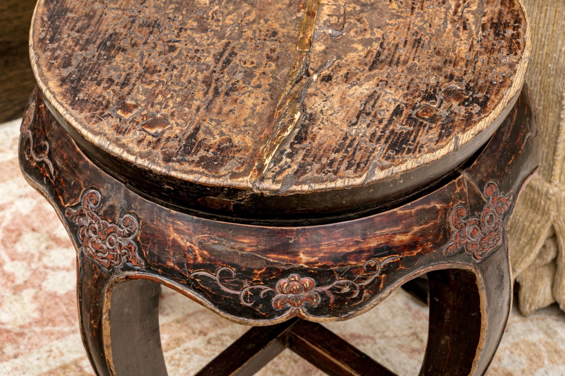 A wonderful and nicely aged Chinese pot stand or side table in warm medium brown finished wood. Features a circular top over a serpentine apron carved with figural lion heads and floral scrolls. raised on cabriole legs with carved and scrolled feet around an X-stretcher.