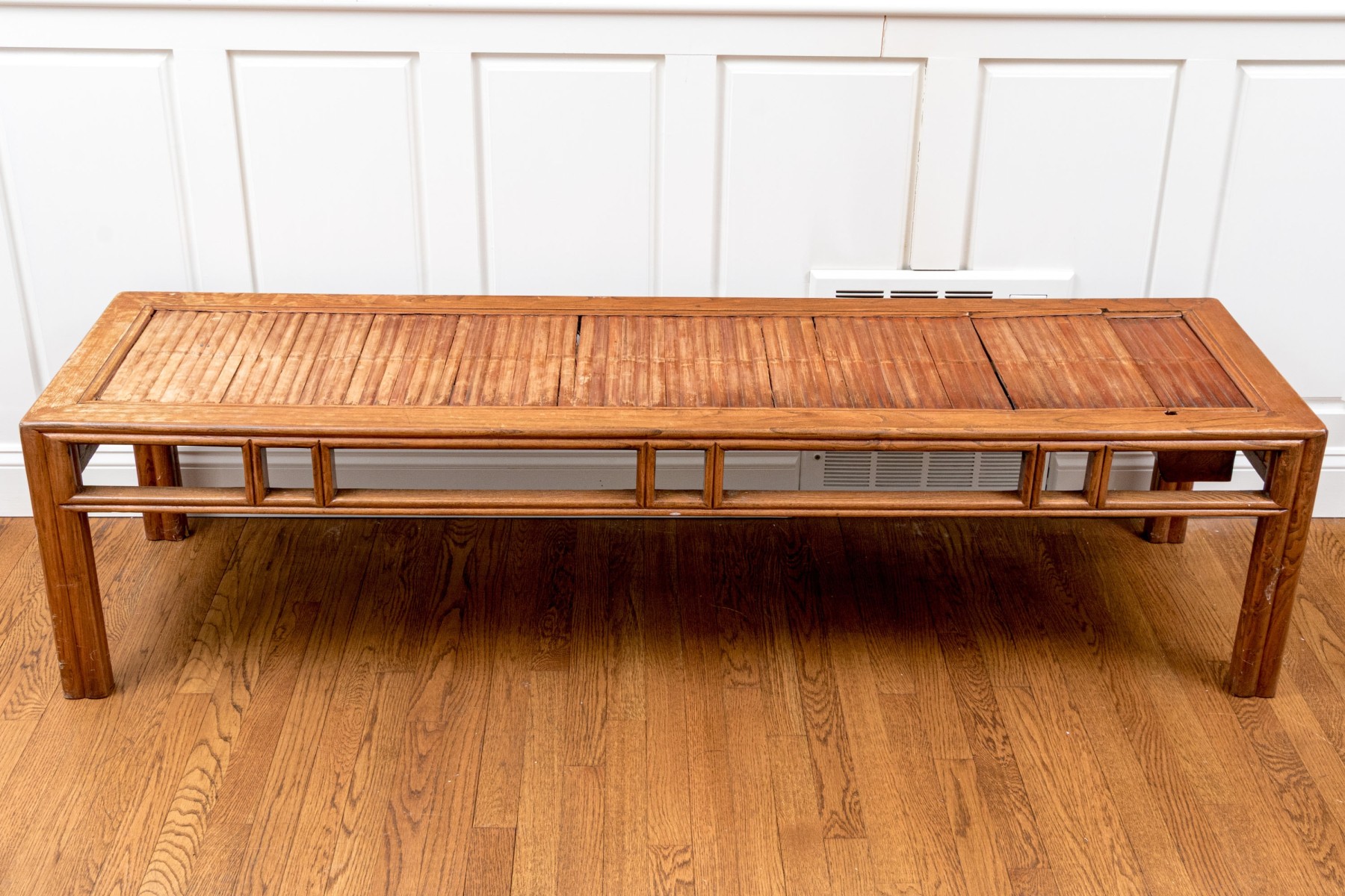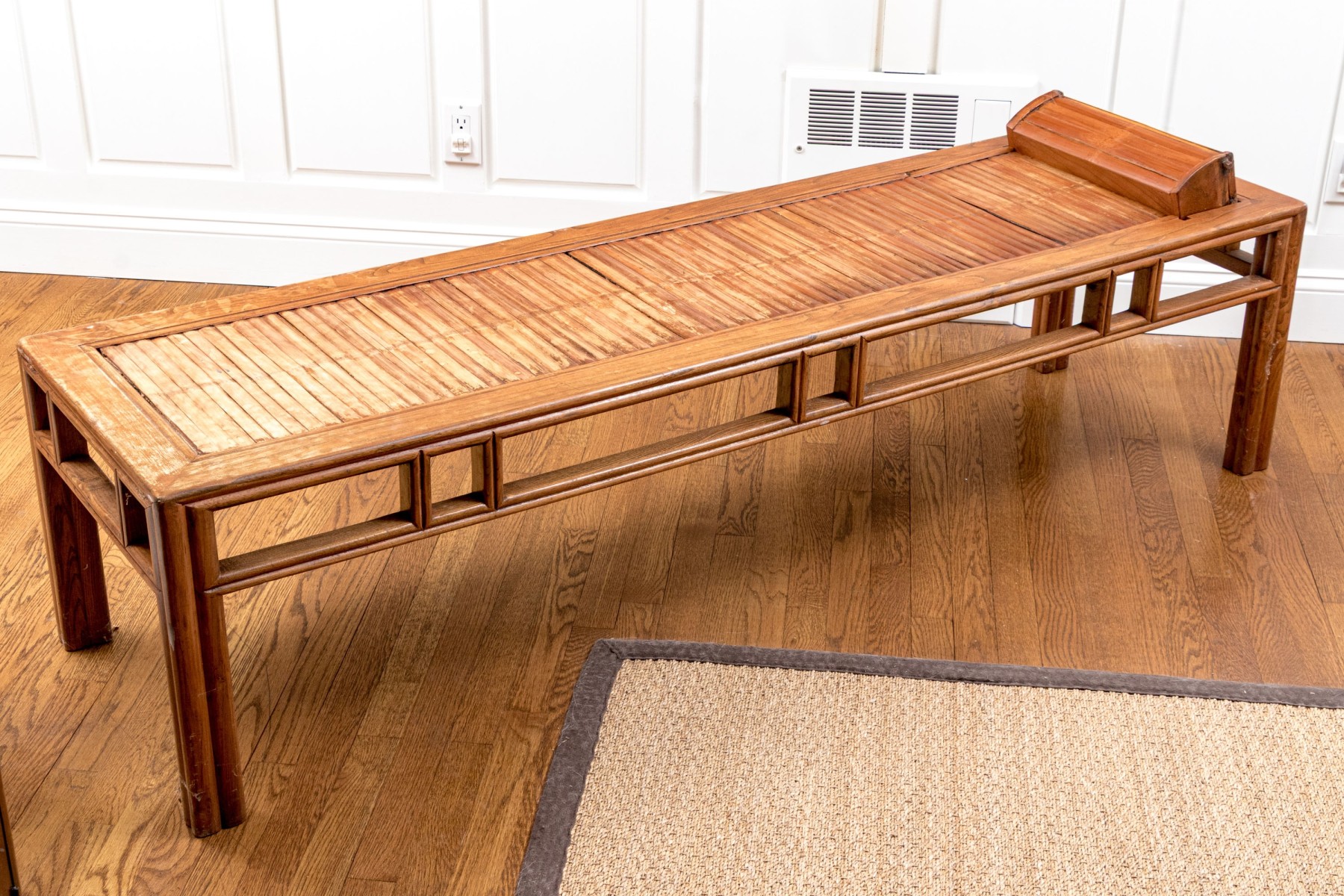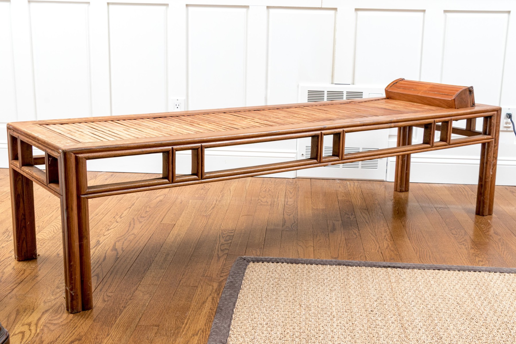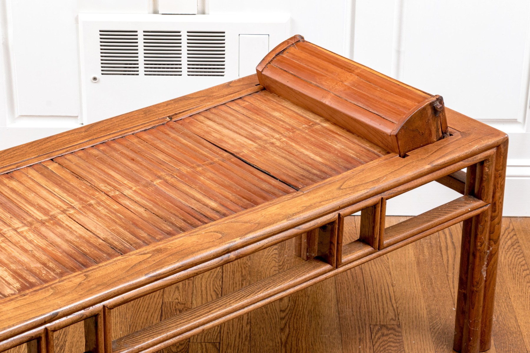 An antique Chinese opium bed in beautiful honeyed brown woo, showcasing a long rectangular form with a banded and subtly recessed center in a mitered frame. One side opens to reveal a wood pillow. The bench is detailed with an eye-catching banded apron creating decorative square motifs, and is raised on double-banded legs.