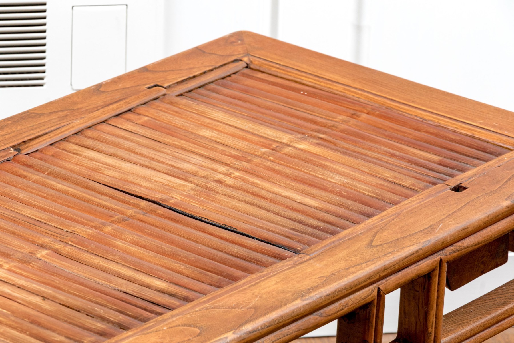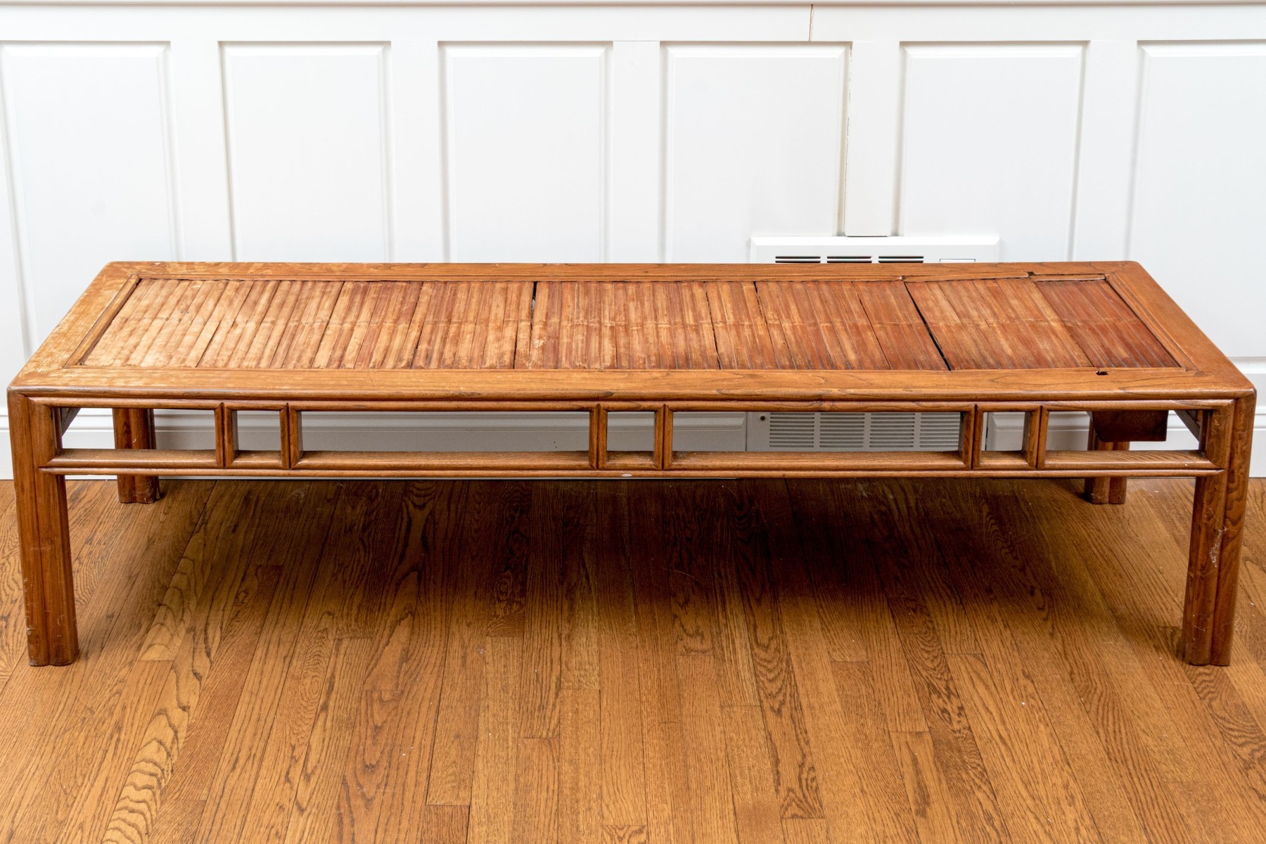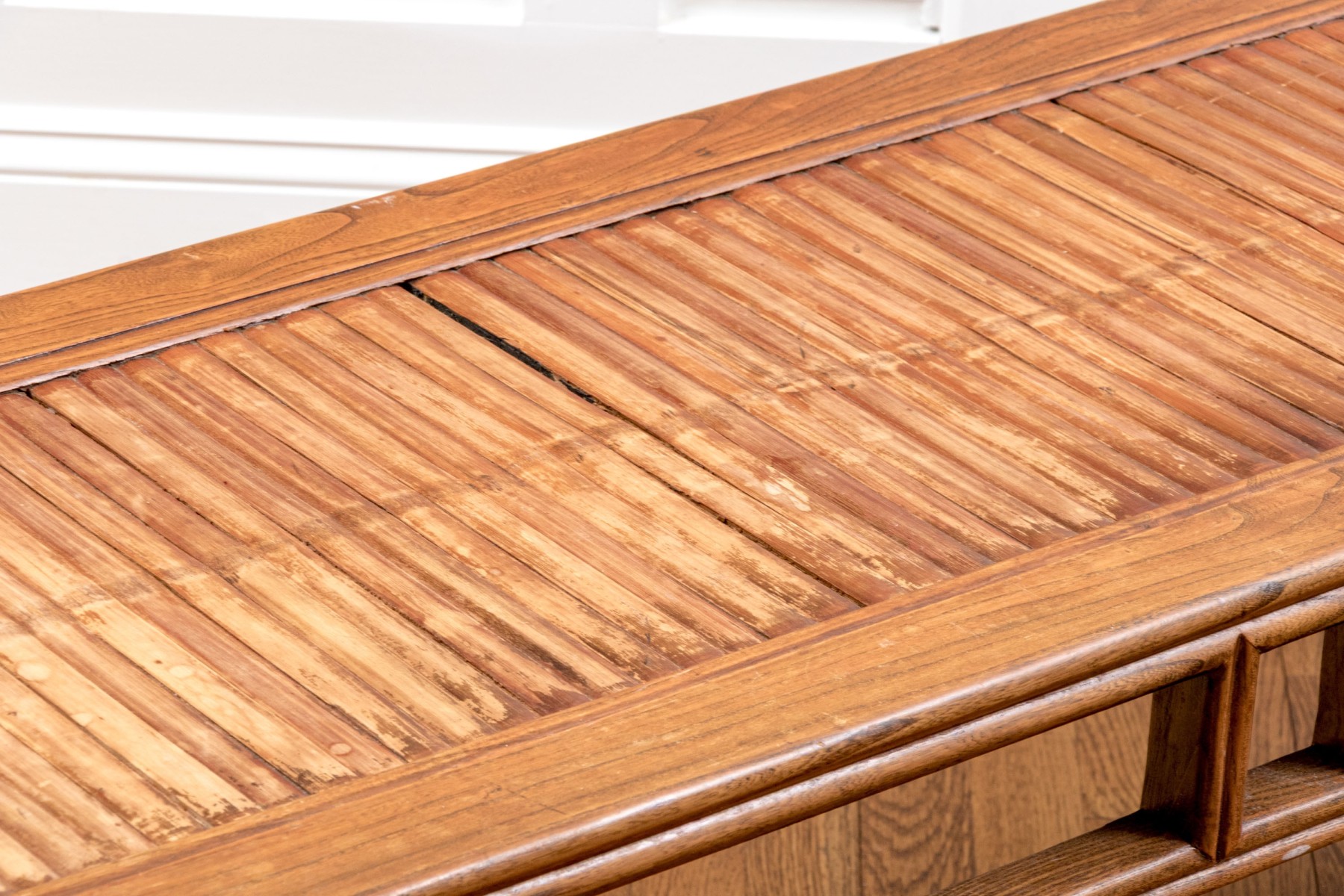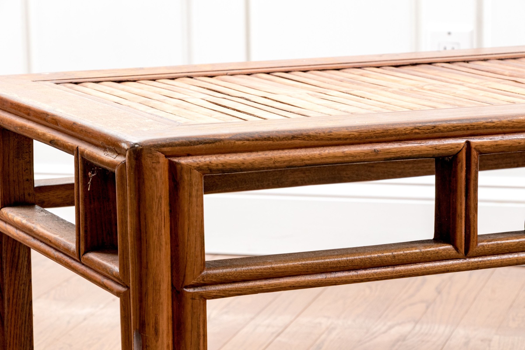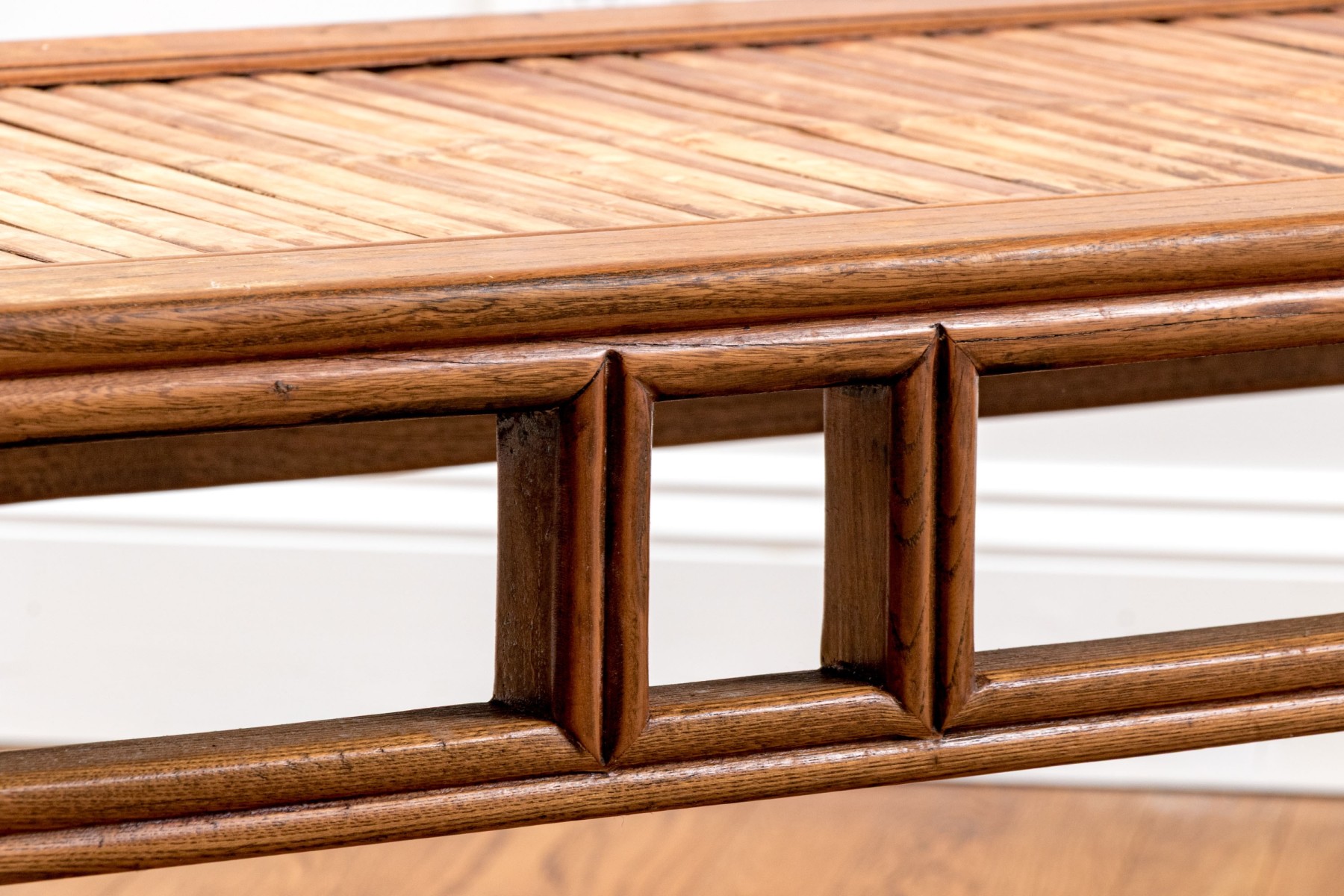 An antique Chinese opium bed in beautiful honeyed brown woo, showcasing a long rectangular form with a banded and subtly recessed center in a mitered frame. One side opens to reveal a wood pillow. The bench is detailed with an eye-catching banded apron creating decorative square motifs, and is raised on double-banded legs.