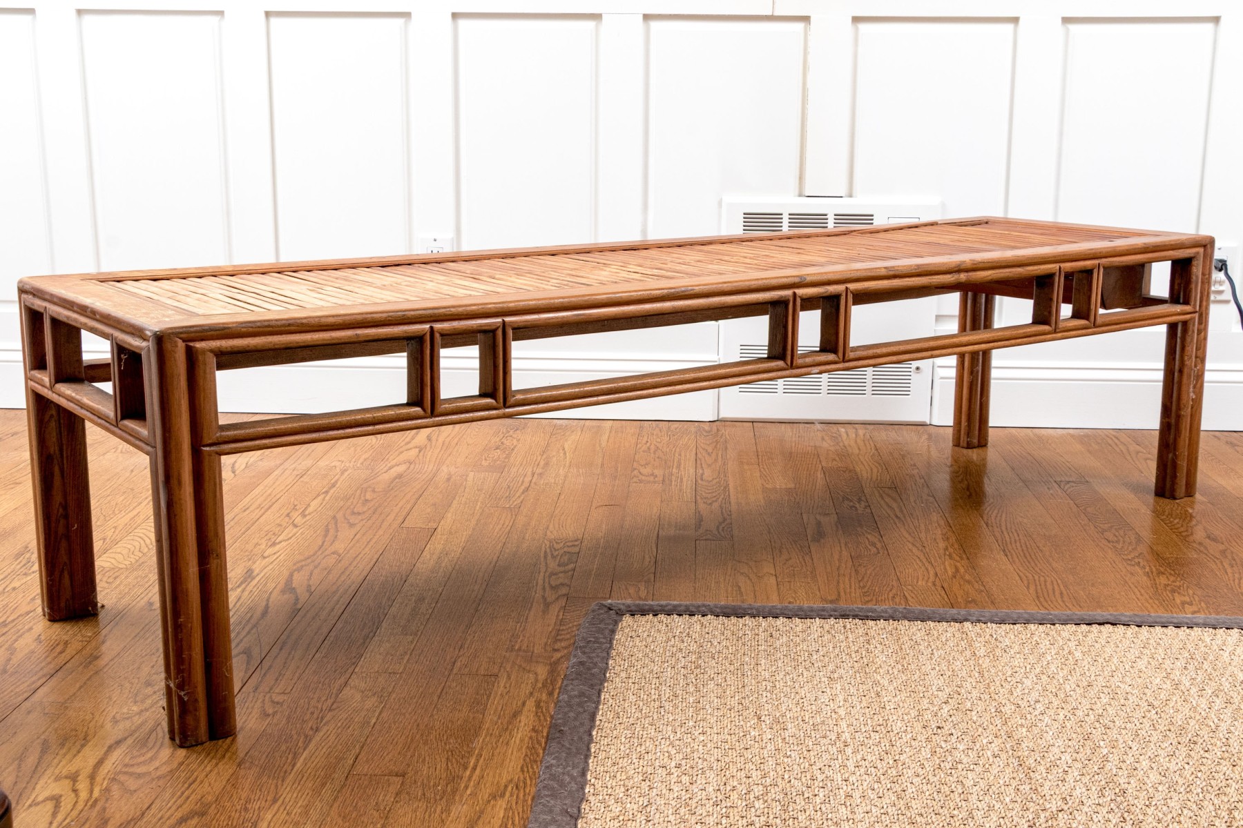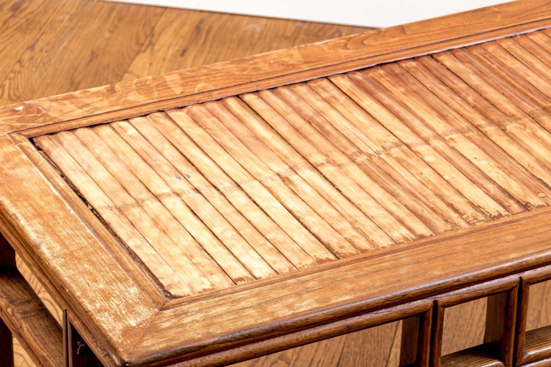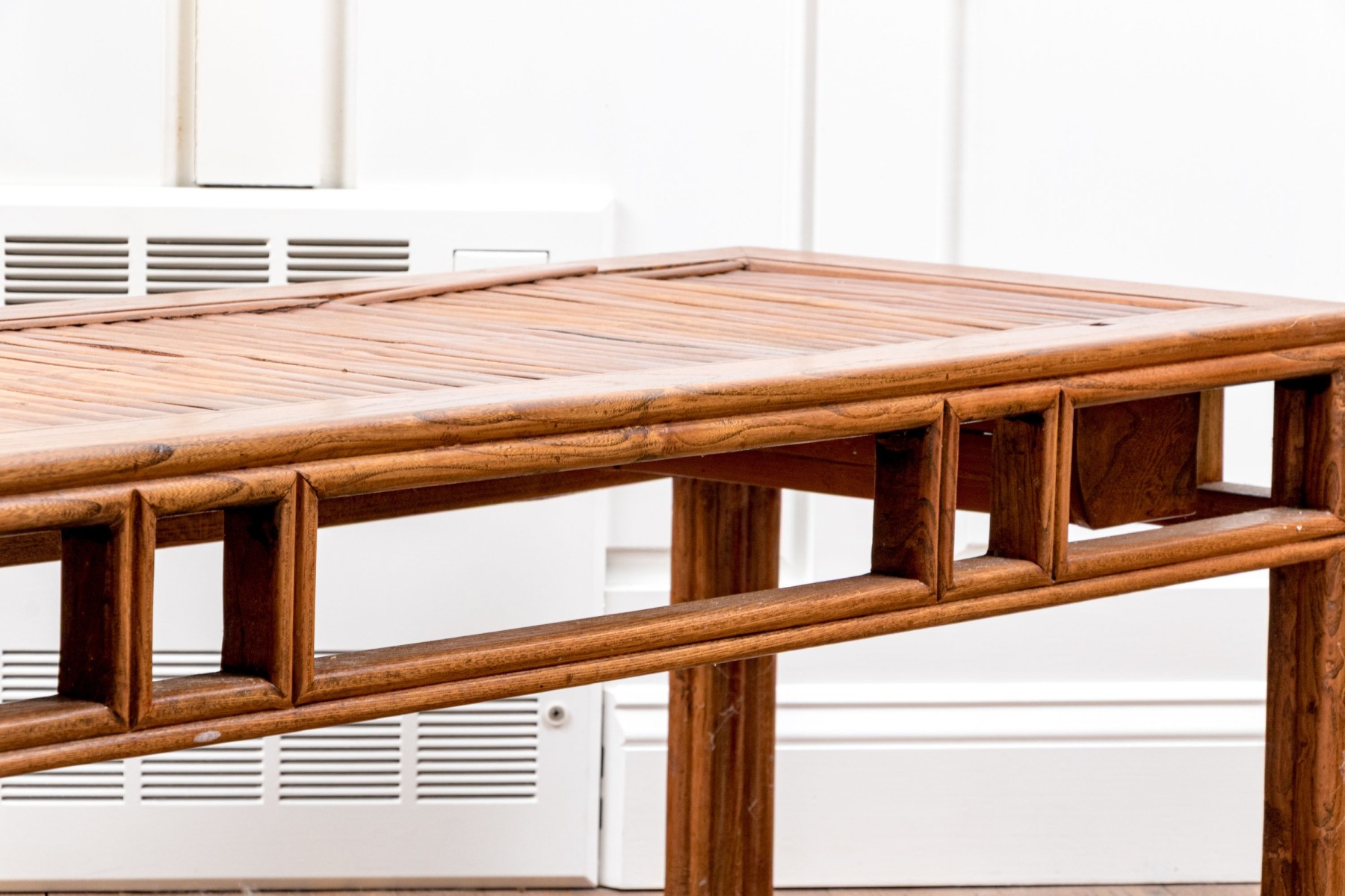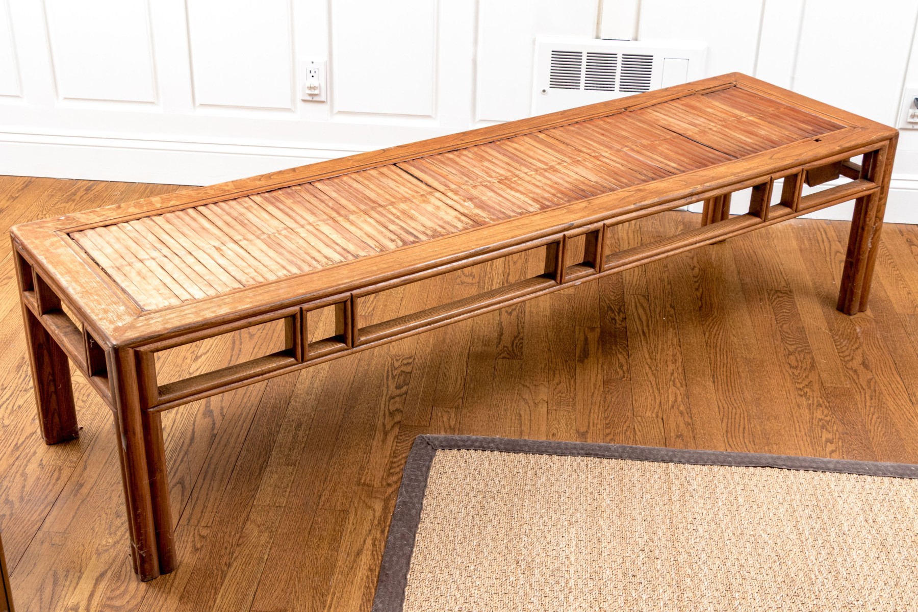 An antique Chinese opium bed in beautiful honeyed brown woo, showcasing a long rectangular form with a banded and subtly recessed center in a mitered frame. One side opens to reveal a wood pillow. The bench is detailed with an eye-catching banded apron creating decorative square motifs, and is raised on double-banded legs.