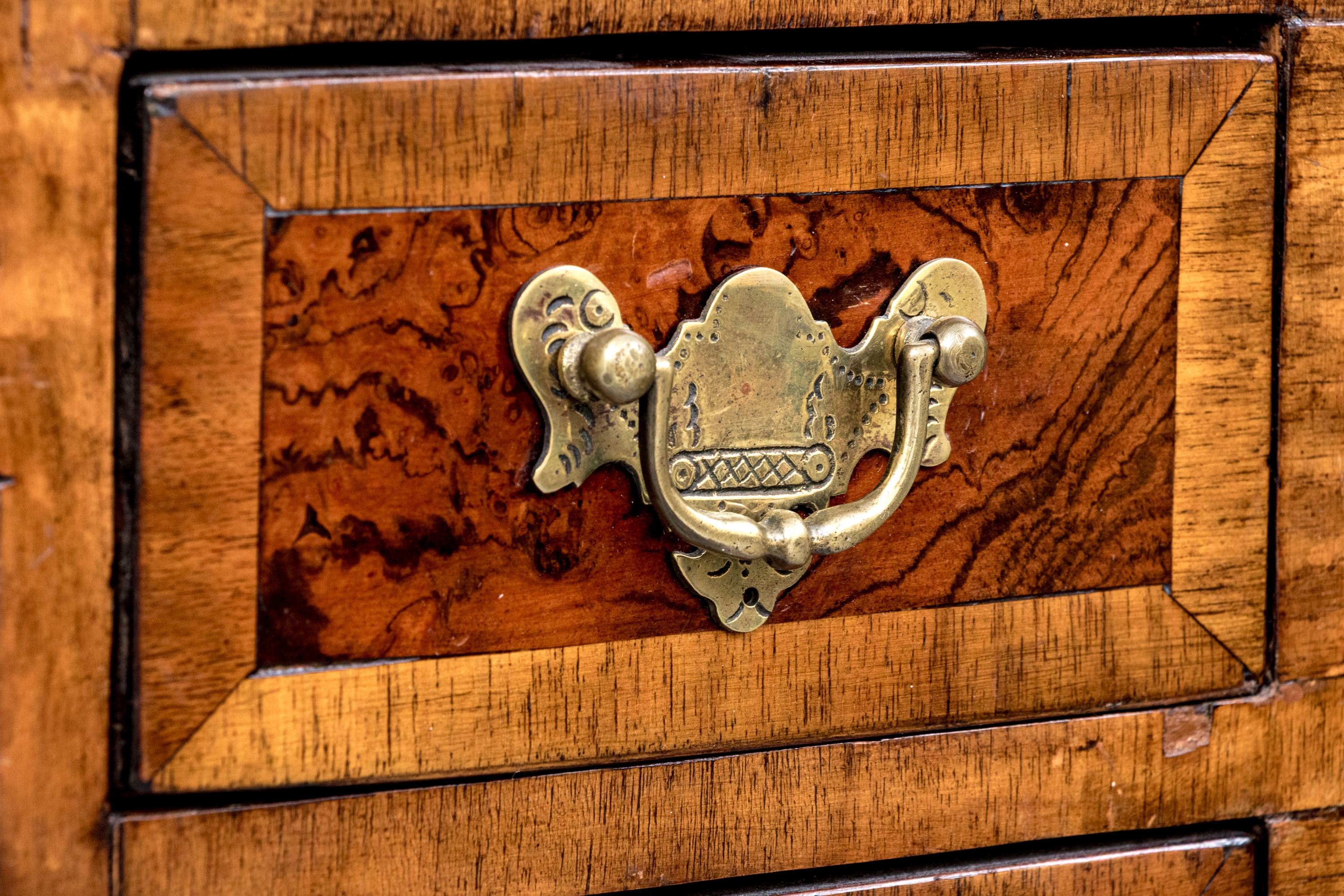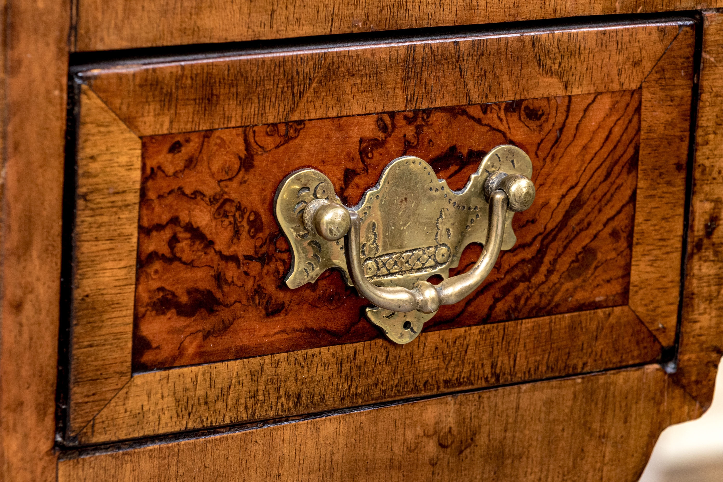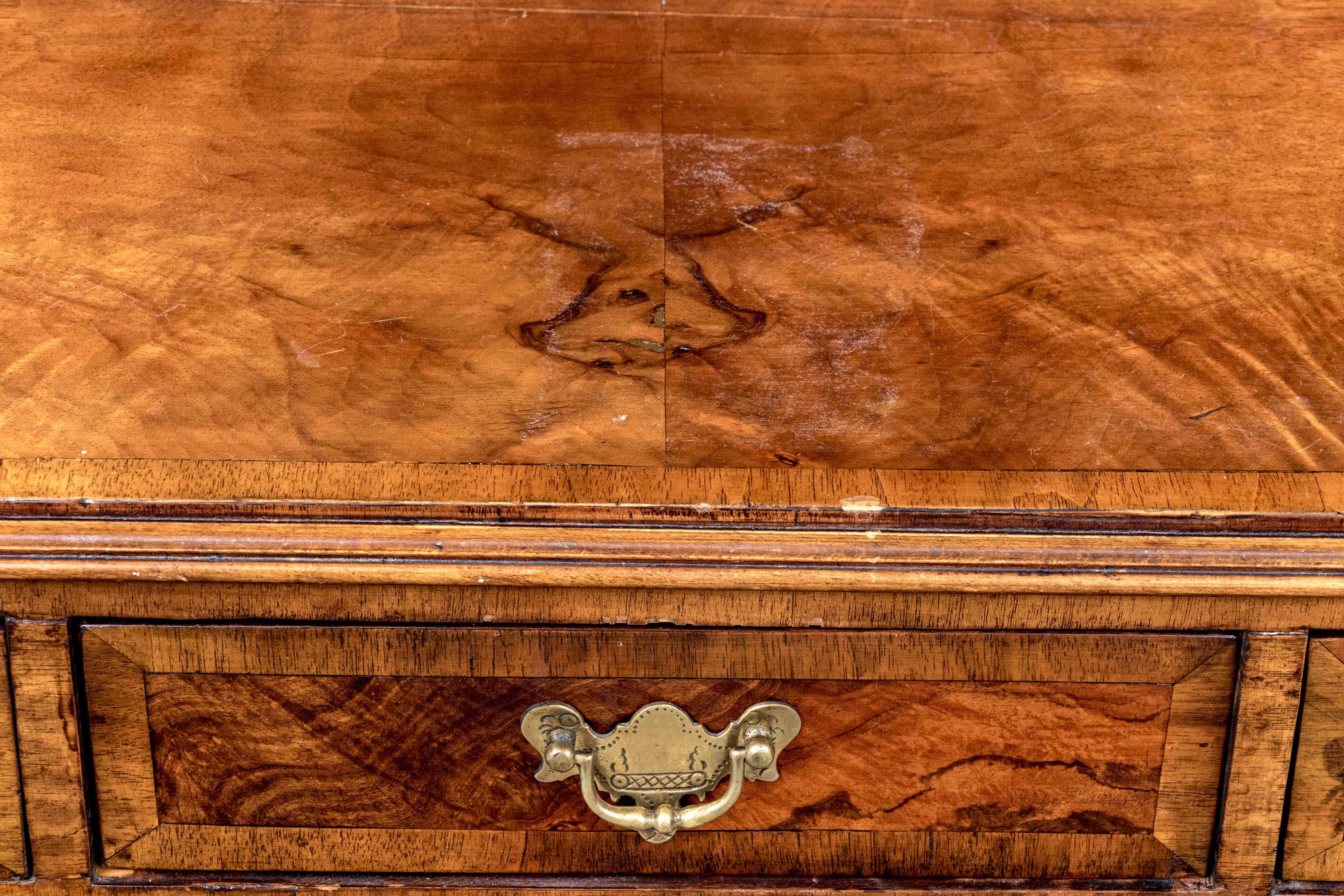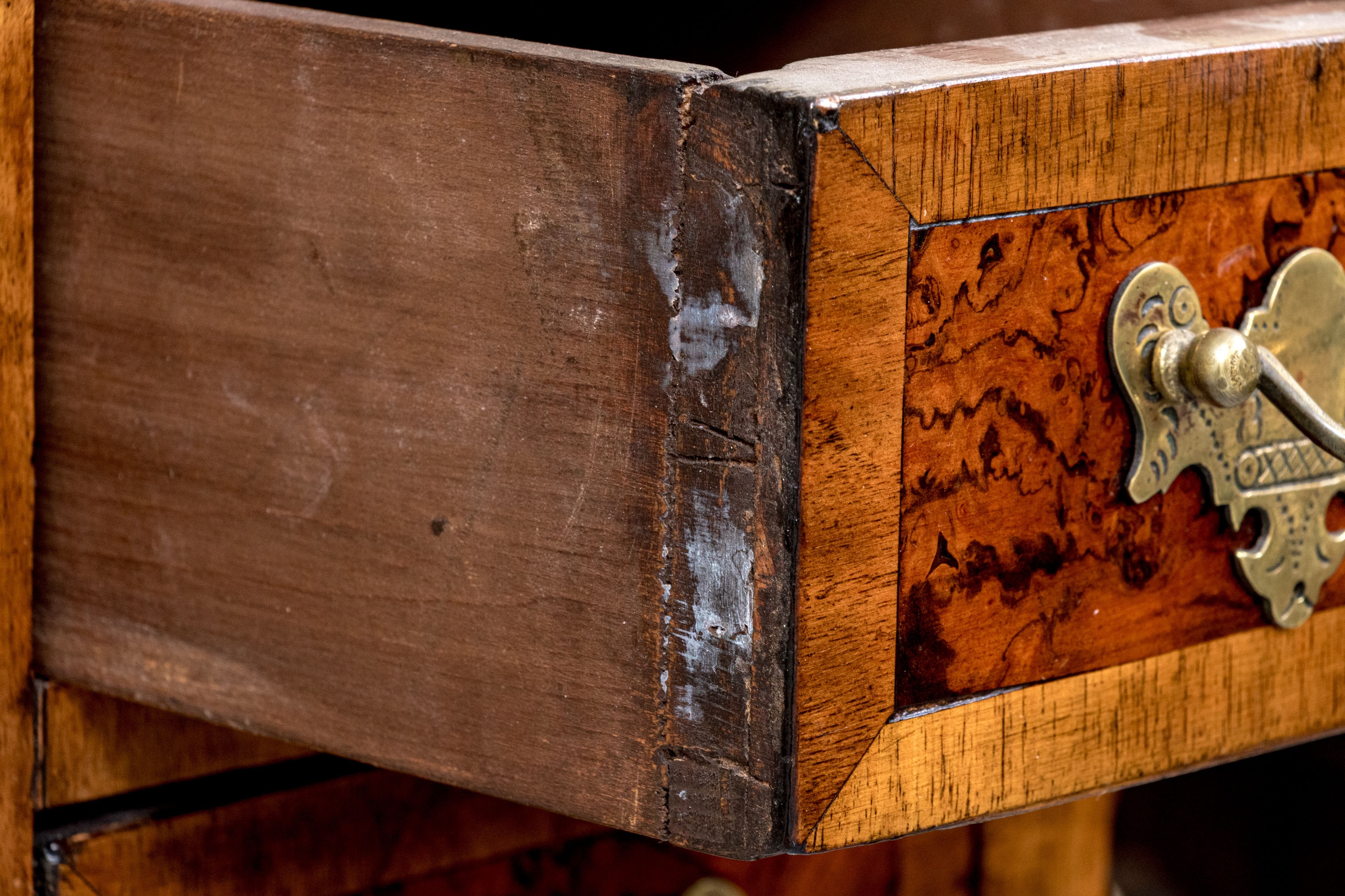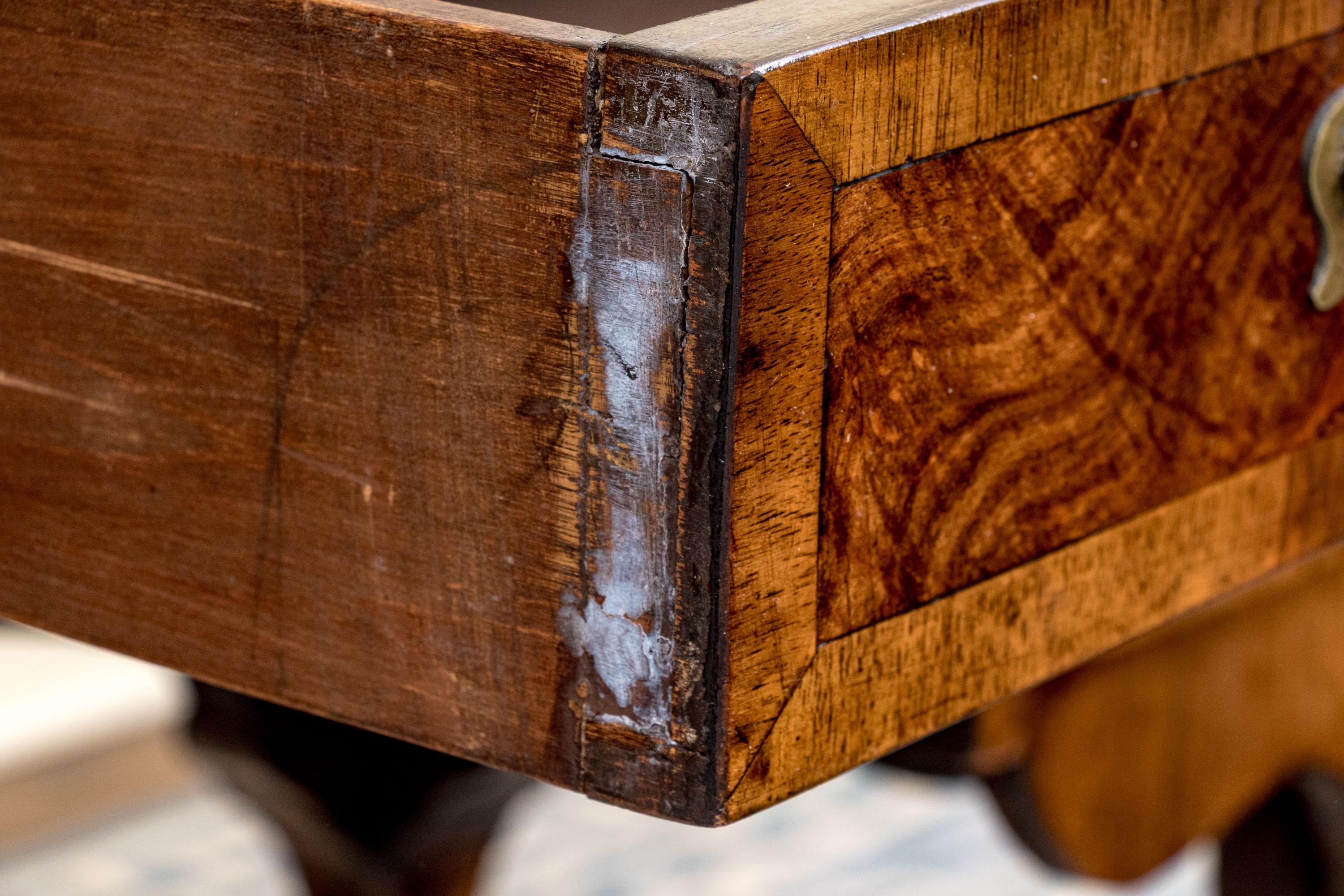 Splits and chipping to the veneers with wear commensurate with age and use. Old repairs to the drawer fronts.